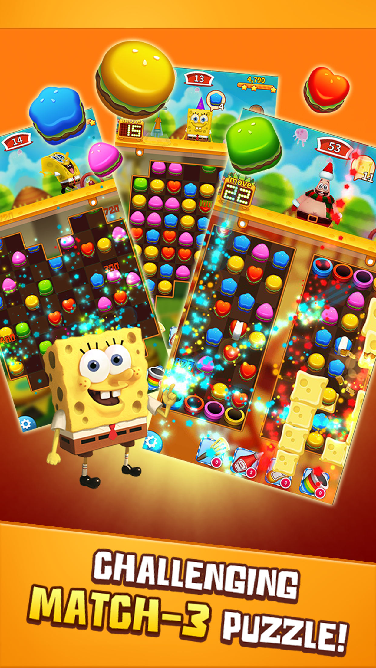 Отбери у Планктона секретную формулу и подавай клиентам краксбургеры, составляя в ряд и лопая кубики в собственном ресторане вместе с Губкой Бобом!