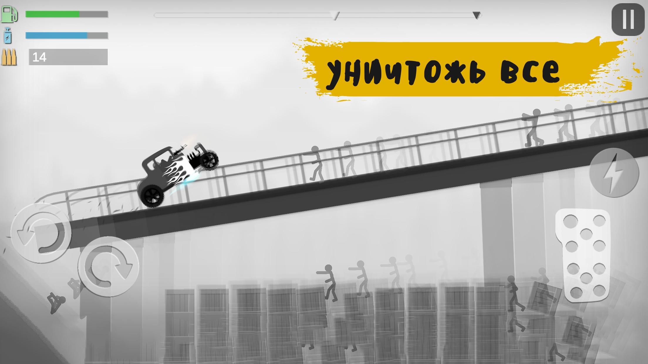 Stickman Zombie Destruction -это одна из лучших гоночных игр со стикменом, где можно делать эпические трюки, управлять различным транспортом и попадать в различные аварии! Игра выполнена в лучших традициях симуляторов с элементами рэгдолл физики . Совершайте невероятные прыжки и трюки и уничтожайте врагов! Ваша задача - добраться до финиша живым или мертвым! 🧟Новый режим истории! Зомби апокалипсис наступил на земле и цунами зомби бегают по улице. Помогите стикмену выжить и не дайте умереть. Все, что у вас есть, - это автомобиль, который вы можете прокачать, чтобы убивать мертвецов зомби на пути в новой гоночной игре! Зарабатывайте на новые машины и улучшения. Прокачайте топливный бак, двигатель, колеса и подвеску. Оснастите машину автоматом, чтобы убить ходячих мертвецов. Установите нитро, чтобы быстрее добраться до финиша и выжить. Кармагеддон уже здесь, поехали! 🏁Гоночный режим! Присоединяйся к этим гонкам по холмам и городам и покажи, кто здесь первый! Открывайте уникальные автомобили с системой апгрейда. Где каждый автомобиль имеет свою особенность и характеристики. Зарабатывайте и разблокируйте все автомобили. Так что езжай вперед и спасайся! Управляй своим автомобилем по пустыне Зомбиленда, пересекай горы и холмы. Исследуйте секретные пещеры и подземелья в новой игре с крупье. Здесь каждый новый уровень не похож на предыдущий и имеет несколько путей прохождения, и вы выбираете куда ехать. 🚗Режим свободной езды! Разблокируйте новые уровни в новом режиме свободной езды! Купите новый транспорт и творите полное разрушение. Stickman может ездить на мускулкаре, автобусе, водить спортивную машину и даже танк! Огромный выбор трасс и транспортных средств дает вам полную свободу действий для прыжков, трюков и гонок! 🔧Зарабатывайте деньги и улучшайте автомобили! Прокачай свой автомобиль, чтобы ехать быстрее с нитро. Зарабатывайте монеты и постройте мощную машину, чтобы убить их всех и убежать! Так что езжай вперед и спасайся! 👍Особенности игры: ★Удивительные трюки и физика рэгдолла ★ Доступны лучшие гоночные автомобили ★ Различные виды игровых уровней ★ Добавлены новые игровые режимы: история, гонки, фрирайд ★ Красивые графические эффекты ★ Прокачай свой автомобиль ★ Больше разрушений. Больше уничтожения зомби ★ Реалистичная физика - карабканья, падения и езды Внимание! 💪Не пытайтесь повторить игровые действия и трюки в реальной жизни. ✔️Игра бесплатная!