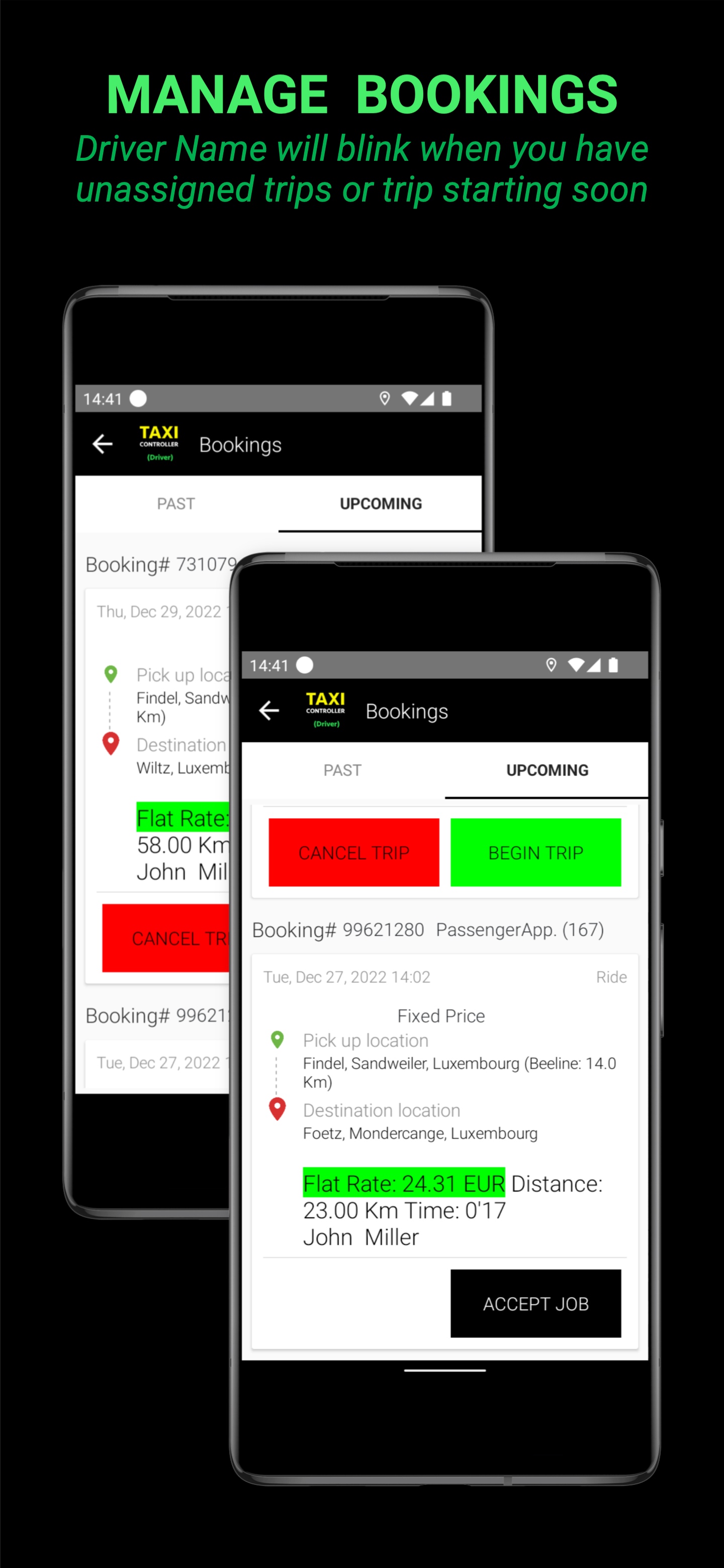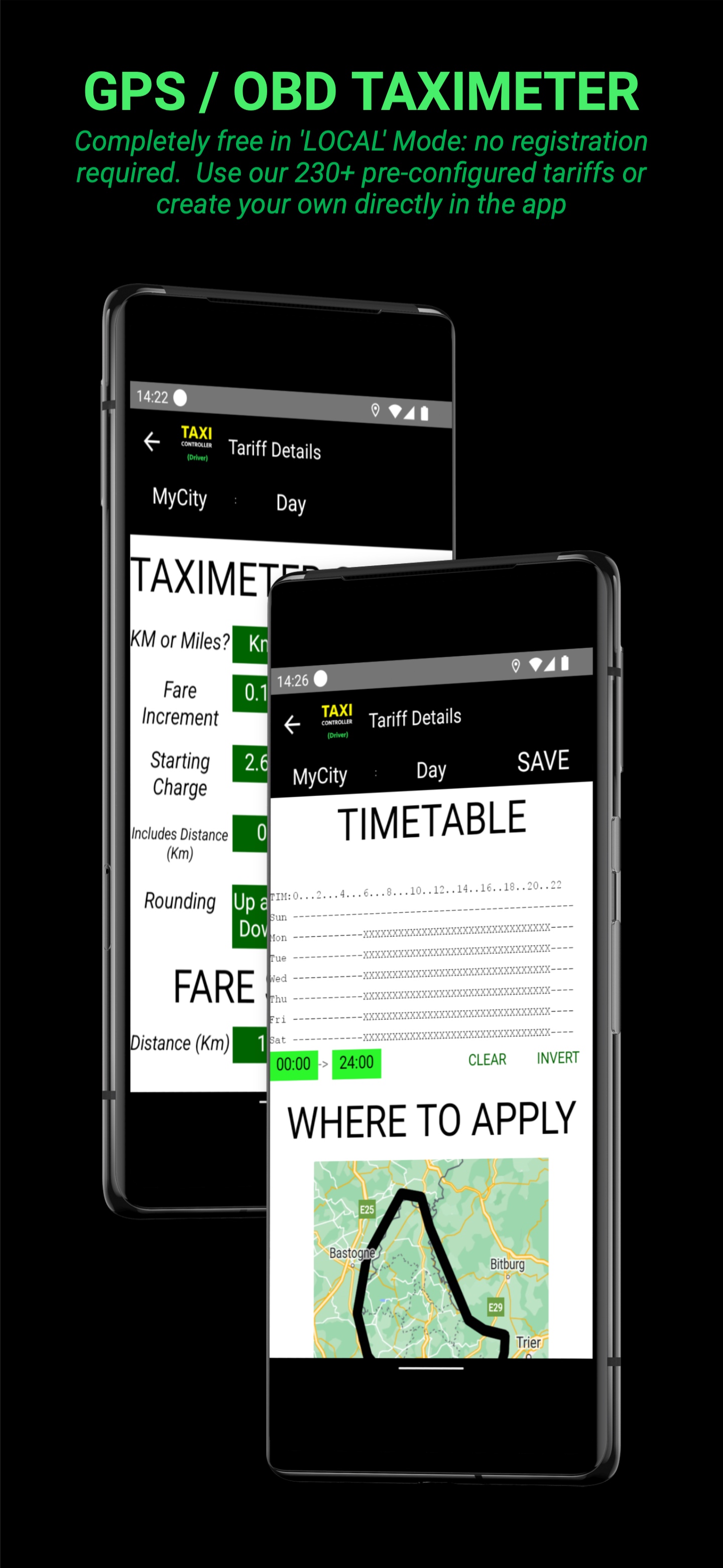 ТАКСИМЕТР И ДИСПЕТЧЕР ПОЕЗДКИ ДЛЯ ПРОФЕССИОНАЛЬНЫХ ВОДИТЕЛЕЙ Добро пожаловать в единственное приложение для таксометра и диспетчеризации самообслуживания. 📗 Руководство пользователя Нет необходимости в настройке: TaxiController поставляется с предустановленными тарифами из 230 городов в 70 странах. Взгляните на наш очень длинный Функции на нашем веб-сайте. При необходимости настройте собственный Тариф прямо в приложении или на нашем Портале. С 2011 года это приложение Таксометр на основе GPS и OBD постоянно расширяется в тесном сотрудничестве с таксопарками и водителями. Доверьтесь приложению, которым ежедневно пользуются тысячи профессиональных водителей по всему миру и которое совершило миллионы поездок. Сократите эксплуатационные расходы, заменив старые таксометры профессиональным приложением. Приложение рассчитывает с высочайшей точностью, управляет сложными тарифными структурами и справляется со всеми мыслимыми дорожными ситуациями. 3 режима использования: ✅ РЕЖИМ LOCAL Дополнительно ‣Профессиональный Таксометр. Первые 100 поездок бесплатны. ‣Для поездки на такси никаких действий по настройке не требуется: нажмите «НАНИМАТЬ», и таксометр запустится. Приложение подберет из нашей базы Тариф, который географически ближе всего к вам из 230 предустановленных Тарифов в 60 странах. ВЫ НЕ ДОЛЖНЫ СКАЗАТЬ ПРИЛОЖЕНИЮ, КАКОЙ ТАРИФ ОН ДОЛЖЕН ИСПОЛЬЗОВАТЬ! ‣По завершении поездки нажмите на ту же кнопку. ‣Если наш предустановленный Тариф вам не подходит, вы можете настроить свой Тариф в приложении. ‣Рассчитайте стоимость проезда заранее и начните навигацию. ‣Подключите принтер, OBD, Taxilight. ‣Интерфейс к системам кредитных карт (SUMUP, SIX). ✅ Режим входа Еще ‣Как компания такси, вы захотите, чтобы собственный тариф вашей компании такси управлялся централизованно. ‣Вы хотите, чтобы ваш водитель выполнял только вход/выход из приложения и не касался каких-либо настроек. ‣Вам наверняка захочется видеть все поездки, совершенные всеми водителями, и отслеживать их местонахождение в режиме реального времени. ‣Дополнительная система кредитных карт (КВАДРАТ) Затем зарегистрируйтесь на нашем веб-сайте, чтобы создать и поддерживать свой собственный Тариф, скопировав один из наших 230 предустановленных Тарифов и выполняя нужные вам изменения. Тарифная конфигурация предлагает так много возможностей, что поначалу она может показаться ошеломляющей. Вот почему мы помогаем вам в этом процессе. Мы можем сделать первоначальную настройку для вас за небольшую плату. Когда ваш Тариф настроен, вы создадите профили водителей и автомобилей. Приложение создает подробные отчеты о действиях водителя и автомобиля, таких как поездки (с пассажиром или на холостом ходу), другие действия (прерывание смены, ожидание,...), доходы и расходы и многое другое. Эти отчеты могут быть использованы для полицейского контроля, расчетов с бухгалтерией Компании и в налоговых целях. ✅ Режим ОТПРАВКИ Ещё Воспользуйтесь нашей комплексной функцией полного самообслуживания, а также нашим приложением для пассажиров, настроив типы транспортных средств, автомобили, водителей, тарифы и т. д. на нашем портале. ‣Отправляйте поездки (поездки и доставка) своим водителям через наш портал. ‣Получайте запросы на поездки через приложение Passenger. ‣Пусть пассажиры расплачиваются предварительн