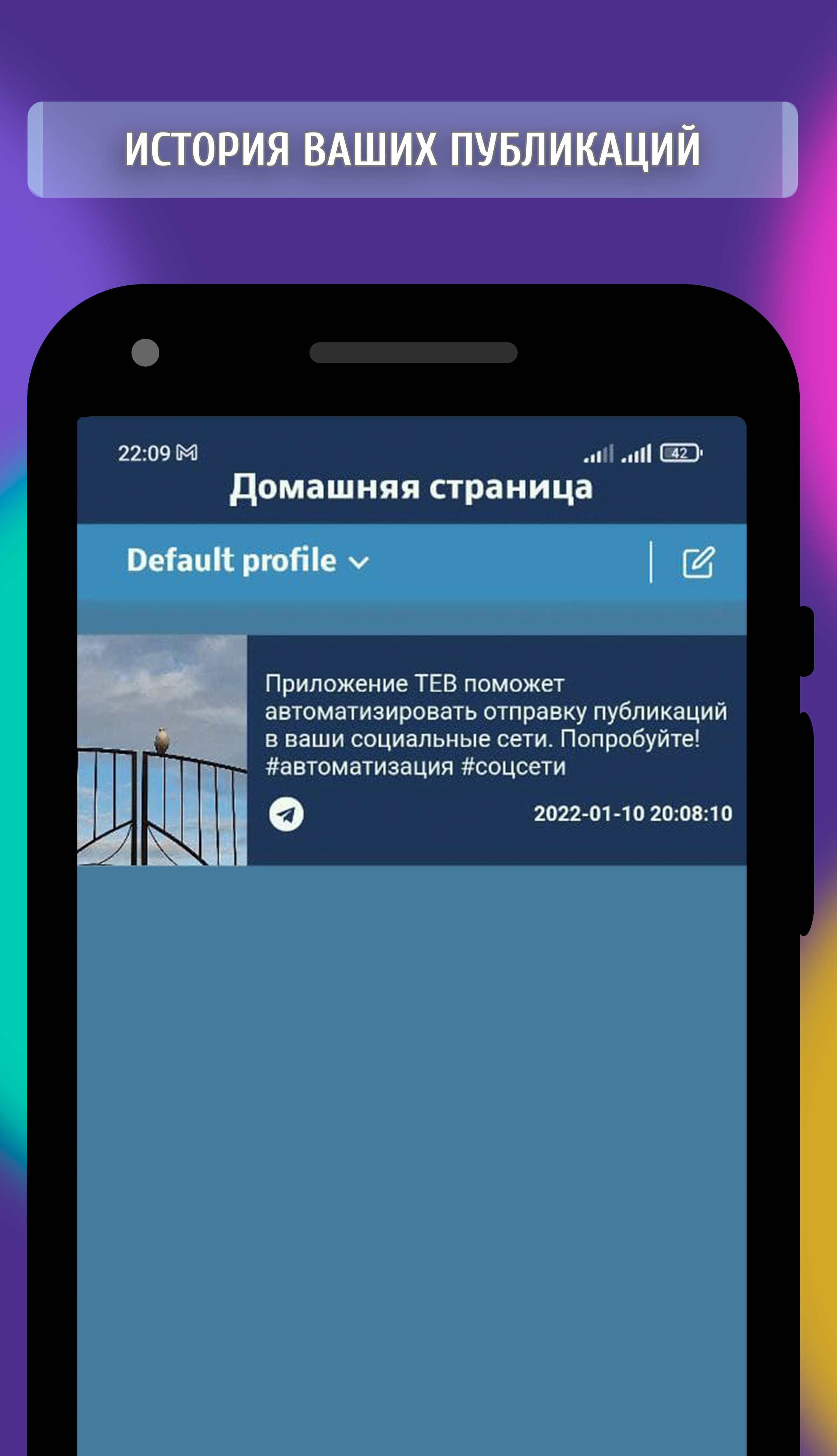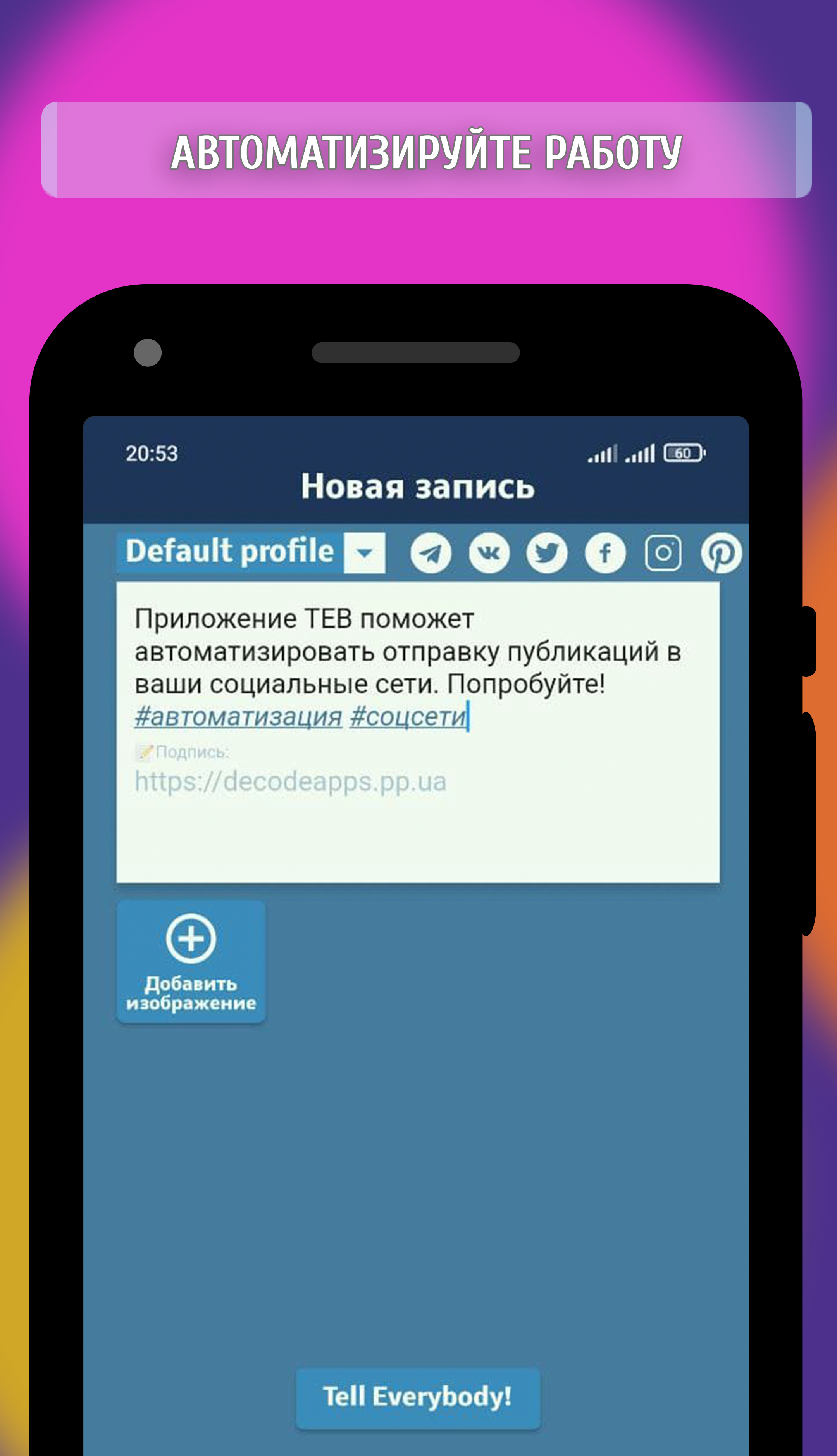 Вам надоело копировать контент от одной публикации в социальной сети в другую? К каждой публикации прикреплять изображения? Тогда TEB это то, что вам нужно! 💡 Создавайте публикации в одном месте и публикуйте их во все подключенные сети! Все очень просто! ⚫ Поддерживаются такие соцсети как Telegram, Facebook, Twitter, VK, Instagram, Pinterest 🎈 ⚫ Присутствует поддержка аккаунтов, так что вы можете сохранить несколько аккаунтов для одной сети 📒 ⚫ Вы можете прикреплять картинки вместе с публикациями 🖼️ ⚫ Токены и ваши персональные данные хранятся на вашем устройстве, так что вы можете всегда просто очистить их 🔐 ⚫ Поддержка тем 🎨 ⚫ Встроенный редактор изображений 🖌️