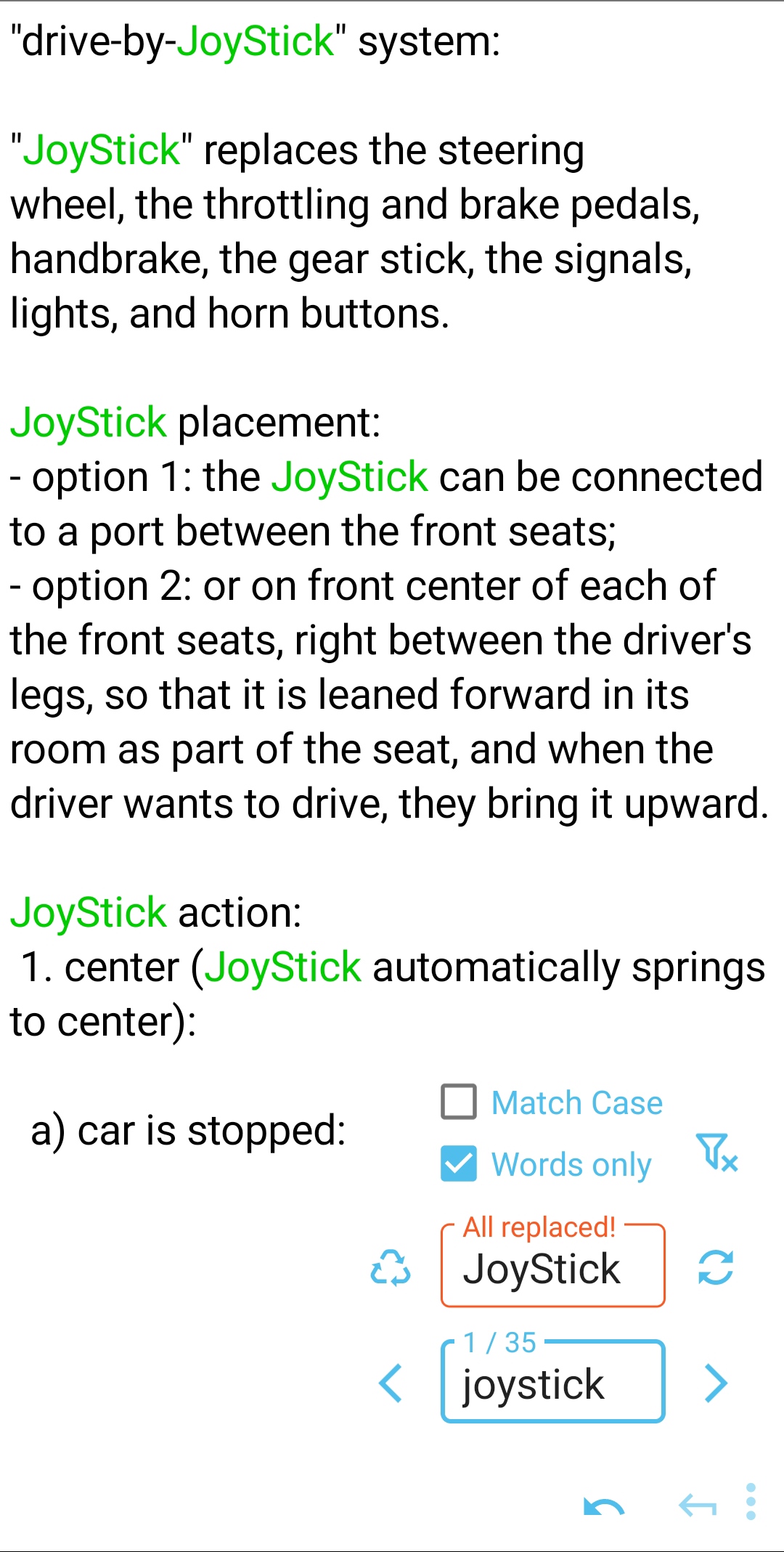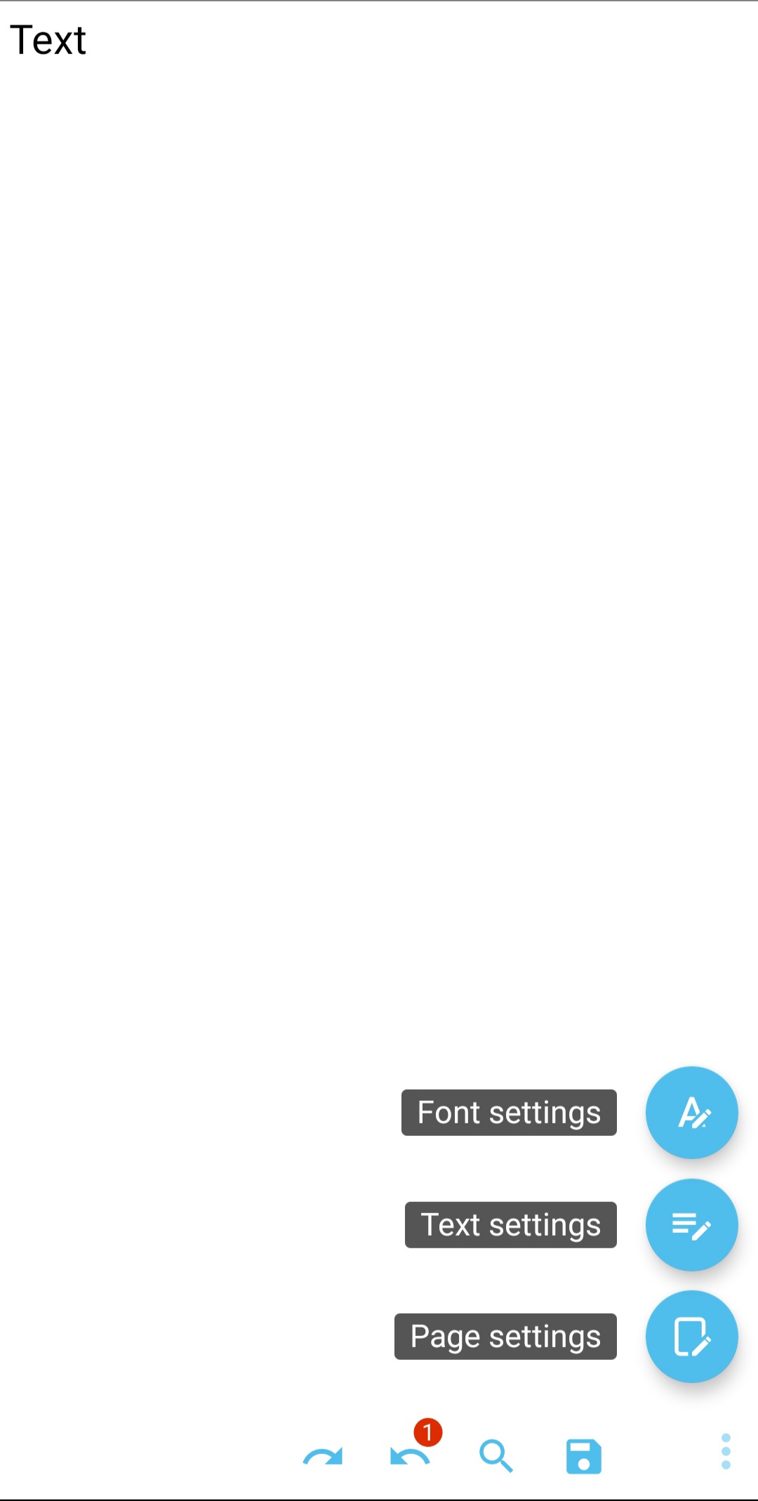 Text Pro 0.18 brings to you: ✓ Font Menu > "Font Size": - Graphical Slider & number input to set text font size ✓ Text Menu > Paragraphs > "Line Spacing": - Slider & Number input to set line spacing ✓ Page Menu > "Page Margin": - Slider & Number input to set page margins ✓ Find > Replace > "Replace All": - Replace All is now instant and much faster ✓ In version 0.185: Minor improvements.