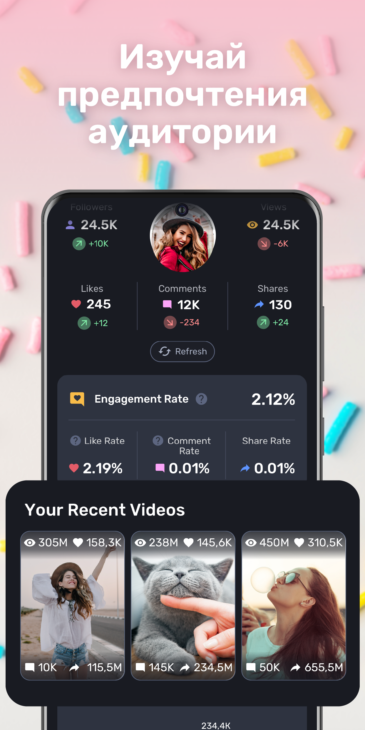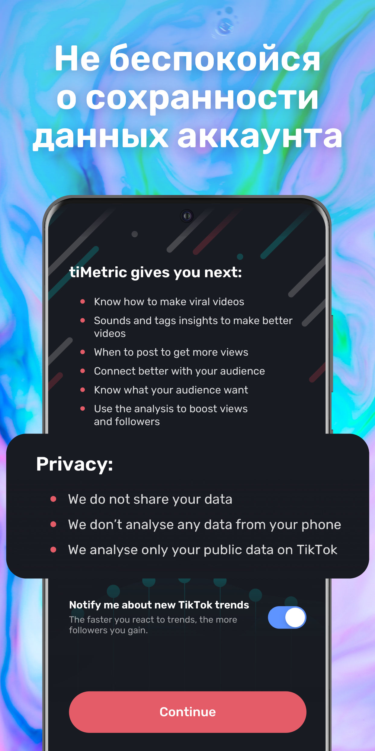 Продвигай свой аккаунт в Тиктоке! Узнай, как получить лайки, просмотры и подписки с помощью мобильной аналитики от tiMetric. 1. Анализируй свои посты. Получай информацию о том, какие посты пользуются большей популярностью и в какое время лучше постить видео в тикток. 2. Отслеживай подписчиков и тех, кто отписался. Получай статистику аккаунта аккаунта в любой момент и смотри, растет твой аккаунт или нет (или аккаунт другого тиктокера 😎). 3. Находи самые популярные аккаунты в тиктоке. Ищи популярные или похожие аккаунты и анализируй их контент, охват и вовлеченность аудитории. 4. Следи за тик ток трендами: популярными видео, хэштегами и песнями. Получай подписчиков, лайки и мгновенные охваты в тикток с помощью контента, который популярен прямо сейчас. 5. Изучай интересы и поведение своих подписчиков. Получай данные о том, как воспринимают твои посты: сколько получено лайков, просмотров и комментариев. 6. Узнай, как алгоритм TikTok влияет на продвижение видео. Ты получишь универсальный инструмент для продвижения своего тиктока. Используй tiMetric и получай рекомендации о способах роста профиля в TikTok. Изучай актуальные данные также по другим аккаунтам. Получай реальную вовлеченность от своей аудитории, отслеживай подписчиков и отписавшихся. Привлекай настоящих подписчиков в TikTok, не используя накрутку лайков или комментариев, с помощью нашего инструмента для аналитики. Это также поможет тебе отслеживать тренды и понять как делать вирусные видео. Ищи популярные хэштеги, используй их и получай подписчиков бесплатно. Получи с помощью tiMetric секреты о своем продвижении: выясни, кто твоя целевая аудитория, подумай о том, какой тип контента нравится и не нравится твоей аудитории, и созда собственную стратегию продвижения в TikTok. Продвигай свой блог, привлекайте спонсоров и монетизируй контент. Если ты никогда не использовал аналитику, мы обещаем, что tiMetric поможет тебе понять, как использовать данные из TikTok для увеличения числа подписчиков и развития профиля. Аналитика - это лучший способ принимать решения и корректировать свою контент-стратегию. Это приложение для тех, кто: - хочет получать больше лайков и подписок в тикток - интересуется текущими трендами и созданием виральных видео - собирается монетизировать аккаунт и получать деньги за видео в тикток - хочет увеличить вовлеченность и охват аудитории - хочет построить свою контент-стратегию, но не знает, что снимать и какие тикток хэштеги использовать. Скачай приложение и оцени все его возможности. Чем раньше ты начнешь продвигать свой аккаунт, тем быстрее ты получишь результат своей работы. Когда вы поделитесь своим видео с аудиторией и начнете отслеживать эффективность своих постов, вы поймете процессы продвижения. Начните свое увлекательное путешествие с самой быстрорастущей социальной сетью ТикТок Важно! Для использования приложения не нужно вводить пароль от твоего TikTok профиля. Скачай приложение и убедись в его пользе!