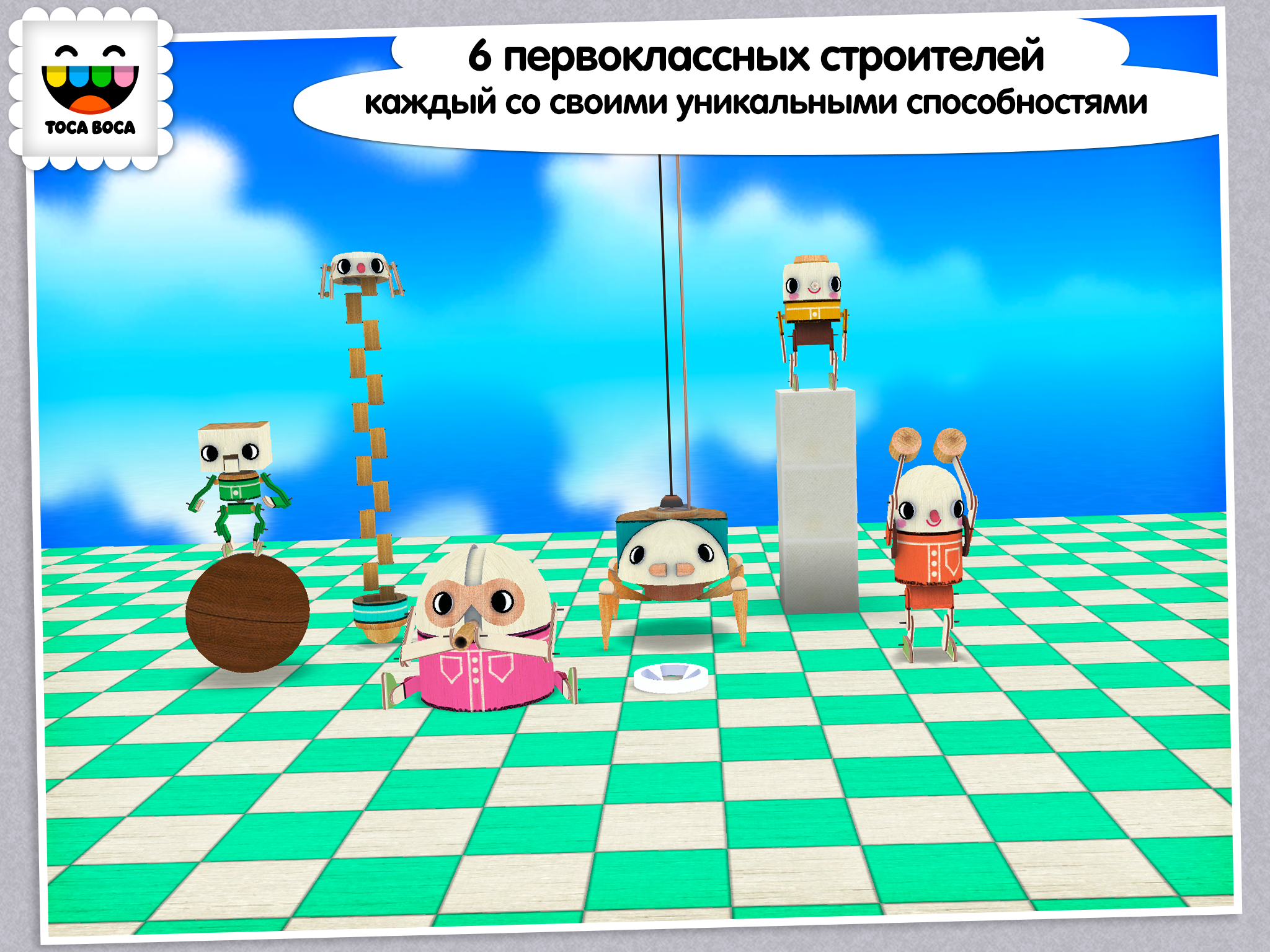 Пришло лето, а вместе с ним – время распродаж! Постройте свой мир в креативной игре Toca Builders. Цена временно снижена! Toca Buliders - это шесть веселых строителей, которые помогут вам воплотить в жизнь все ваши фантазии! Отправляйтесь на далекий остров, где вместе со своими новыми друзьями вы сможете построить целый мир из кубиков. Передвигайте, вращайте, поворачивайте и заставляйте подпрыгивать фигурки строителей, чтобы использовать их уникальные способности, с помощью которых можно построить все, что вам придет в голову! Приложение Toca Buliders позволит вам опускать, поднимать, разбивать на части и красить из пульверизатора строительные блоки, чтобы каждый раз создавать из них нечто новое - дом, лампу или, может быть, даже банан? Итак, начинаем игру: нам понадобится несколько кубиков... Но постойте-ка! Давайте сначала познакомимся с нашими строителями. Блокс: Отлично умеет опускать кубики или разбивать их на части Купер: Превосходный маляр Векс: Идеально укладывает кубики в штабеля Стретч: Отличается умением размещать кубики где угодно Конни: Обожает поднимать и передвигать кубики Джам-Джам: Любит рисовать аэрозольной краской С такими помощниками вы отлично проведете время и сможете построить свой собственный "кубический" мир! Toca Buliders - это совершенно новый подход к игре в кубики, стимулирующий как творческий потенциал, так и любознательность ребенка. Несколько несложных сенсорных жестов и уникальных элементов управления - и строители оживут, для того чтобы помочь вам построить мир вашей мечты! Если вы хотите сохранить созданный вами мир, просто нажмите кнопку Back ("Назад"), чтобы вернуться в главное меню, и все сделанные изменения будут сохранены. Функция моментального "фотоснимка" экрана даст вам возможность сфотографировать ваше творение и выложить его на всеобщее обозрение! КЛЮЧЕВЫЕ ФУНКЦИИ И ВОЗМОЖНОСТИ ПРИЛОЖЕНИЯ - 6 первоклассных строителей - Стройте все, что угодно - опускайте, поднимайте, разбивайте кубики на части и красьте их из пульверизатора! - Раскрасьте любые кубики в нужный вам цвет - Управляйте строителями с помощью уникальных команд - фигурки можно вращать, поворачивать, направлять и передвигать - Сохраните созданные вами архитектурные шедевры при выходе из вашего мира с помощью кнопки Back ("Назад"). - Воспользуйтесь функцией моментального фотоснимка, чтобы запечатлеть ваше творение - Простой, интуитивно понятный ребенку интерфейс с потрясающими возможностями для творчества - Великолепные возможности для развития творческого потенциала ребенка - Яркая оригинальная графика - Никаких правил или ограничений по времени, никаких проблем - играйте так, как вам нравится - Никакой посторонней рекламы - Никаких покупок внутри приложения *** О TOCA BOCA Сотрудники Toca Boca убеждены, что игра стимулирует воображение ребенка и помогает ему познавать мир. Создавая наши продукты, мы стараемся смотреть на вещи глазами ребенка, чтобы побудить его играть, творить и воплощать свои мечты. Среди наших разработок — удостоенные наград приложения, насчитывающие более 130 млн загрузок в 215 странах мира. Мы предлагаем веселые и безопасные игры с открытым концом. Узнать о нас и о наших продуктах подробнее вы можете на нашем сайте tocaboca.com. ПОЛИТИКА КОНФИДЕНЦИАЛЬНОСТИ Мы относимся очень серьезно к вопросу конфиденциальности. Чтобы узнать больше о том, как м