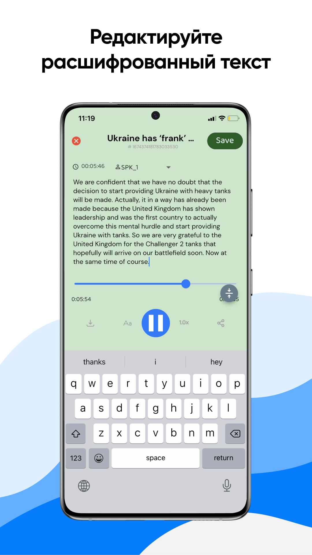TRANSKRIPTOR — это приложение для преобразования речи в текст, которое расшифровывает встречи, лекции, аудио и голос в текст! Используйте приложение автоматической транскрипции, чтобы делать заметки о встрече и диктовать интервью. Он поддерживает все форматы файлов, поэтому вы можете легко конвертировать аудио и видео в текст! Приложение преобразования речи в текст предлагает 90 минут бесплатной транскрипции. ★ Конвертер аудио в текст делает для вас заметки о встречах! ★ Преобразование mp4 и mp3 в текст ★ Преобразование аудио в текст с транскрибером ★ Добавляйте субтитры к видео с созданием файлов srt ★ Расшифровывать голосовые сообщения WhatsApp Что такое ТРАНСКРИПТОР? Это приложение для транскрипции, которое преобразует голос в текст с помощью технологии на базе искусственного интеллекта, аналогичной Happy Scribe, Transcribeme, Voicepop и otter ai. Наше приложение для аудиодиктовки можно использовать во многих областях: от диктовки интервью до создания субтитров к видео. Вам нужно только зарегистрироваться, чтобы попробовать приложение для диктовки бесплатно. Почему вы должны использовать конвертер речи в текст? Преобразователь голоса в текст. Автоматические диктовки так же точны, как и диктовки вручную. Кроме того, автоматическая транскрибация занимает меньше времени, чем ручная транскрибация. В отличие от других приложений для транскрипции, Transcriptor обеспечивает скорость, точность и доступность. Таким образом, вы можете легко делать речевые заметки и создавать субтитры для видео. Легко транскрибировать аудио в текст: вы можете записывать голос и расшифровывать его одним щелчком мыши. Если вы не знаете, как диктовать голос тексту, не волнуйтесь. У нас есть руководства для многих вариантов использования, которые показывают, как транскрибировать интервью, как использовать инструмент генератора субтитров и расшифровку подкастов. Благодаря новому обновлению вы можете транскрибировать голосовую заметку WhatsApp через приложение. Речь в текст. С TRANSKRIPTOR, одним из лучших конвертеров голоса в текст, вы можете преобразовывать файлы многих форматов, таких как mp3, mp4, wav, m4a, в текст. Он может транскрибировать видео в текст. Это поможет вам добавить субтитры к видео. Вы можете генерировать субтитры для Youtube Video с помощью autocap. Он даже может преобразовывать ваши речевые заметки в текст и диктовать ваши подкасты. Вы можете легко конвертировать аудио и видео в текст. Кроме того, вы можете транскрибировать видео с YouTube в текст. Скопируйте ссылку на видео и позвольте TRANSKRIPTOR преобразовать Youtube в текст. Доступное приложение для преобразования голоса в текст. TRANSKRIPTOR предлагает конвертер аудио в текст и видео в текст по самой низкой цене. Кроме того, он предлагает своим пользователям бесплатную пробную версию. Он поддерживает дословную групповую расшифровку, поэтому вы можете использовать его для выступлений и встреч с несколькими докладчиками. Диктовка текста: Работает на современном искусственном интеллекте. алгоритм преобразования речи в текст; поэтому его точность может достигать 99% (в зависимости от языка и качества звука). Он запоминает речевые паттерны, как выдра и атекст, и его точность улучшается с каждым днем. Таким образом, он может дать лучшие результаты, чем некоторые из лучших сервисов преобразования речи в текст. TRANSKRIPTOR — это онлайн-приложение для транскр