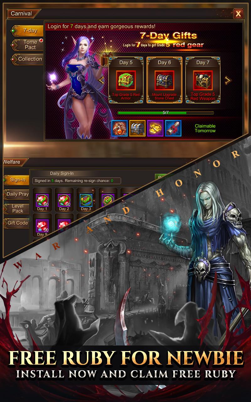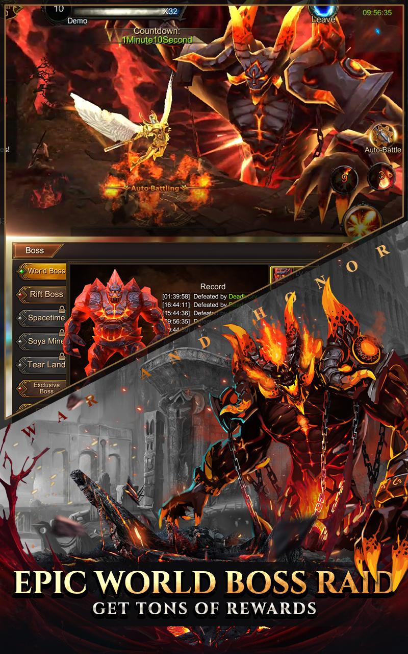 War and honor is a classic 3D action MMORPG. In this game, you can fight against other players all over the world, experience the extraordinary storyline, and enjoy the purest classic role-playing! There are more wonderful dungeons, epic world BOSS waiting ahead, defeat them to get tons of treasures, leads you to get the top of the glory! This is the most interesting MMORPG - Unique gameplay to unlock your exclusive skills by completing missions and clearing dungeons - Awesome costume, free to customize your character, make you have the best unique outfit on the battlefield. - Define your own mount forms, change your pet appearance, make your conque journey legendary. The fairest global real-time PVP In the arena, technology is everything for you! Feel free to control the character, experience the exciting battle, and use your excellent game skills to win the first throne of the arena! your precious rewards are waiting ahead. Social interaction experience Enjoy a colorful multiplayer experience, join a guild, make friends, cope with the coming challenges, or share a common enemy in the game. A variety of exciting interactions make you feel immersive. Best events never STOP! Download now and get free diamond rewards, as well as a variety of exciting activities waiting for you to participate, the stronger you are, the gifts are more you get! ¦¦ Official Community Websites ¦¦ Facebook: @war and honor [Configuring Permissions] - Storage: Requires access to storage to attach files for Community Board, FAQ, and 1:1 Inquiry. * War and Honor have been developed to run on Android 6.0 and above with selective app permissions. If you're using a device with an Android version under 6.0, contact your device's customer support to see if they offer upgrades to your operating system. After upgrading you may want to manage the selective app permissions, which you can do from your device's settings menu. [Manage and Revoke Permissions] - Android 6.0 and above: Device Settings > Apps > Choose App > App Settings > Permissions - Android 6.0 and under: Revoke permissions by deleting the app