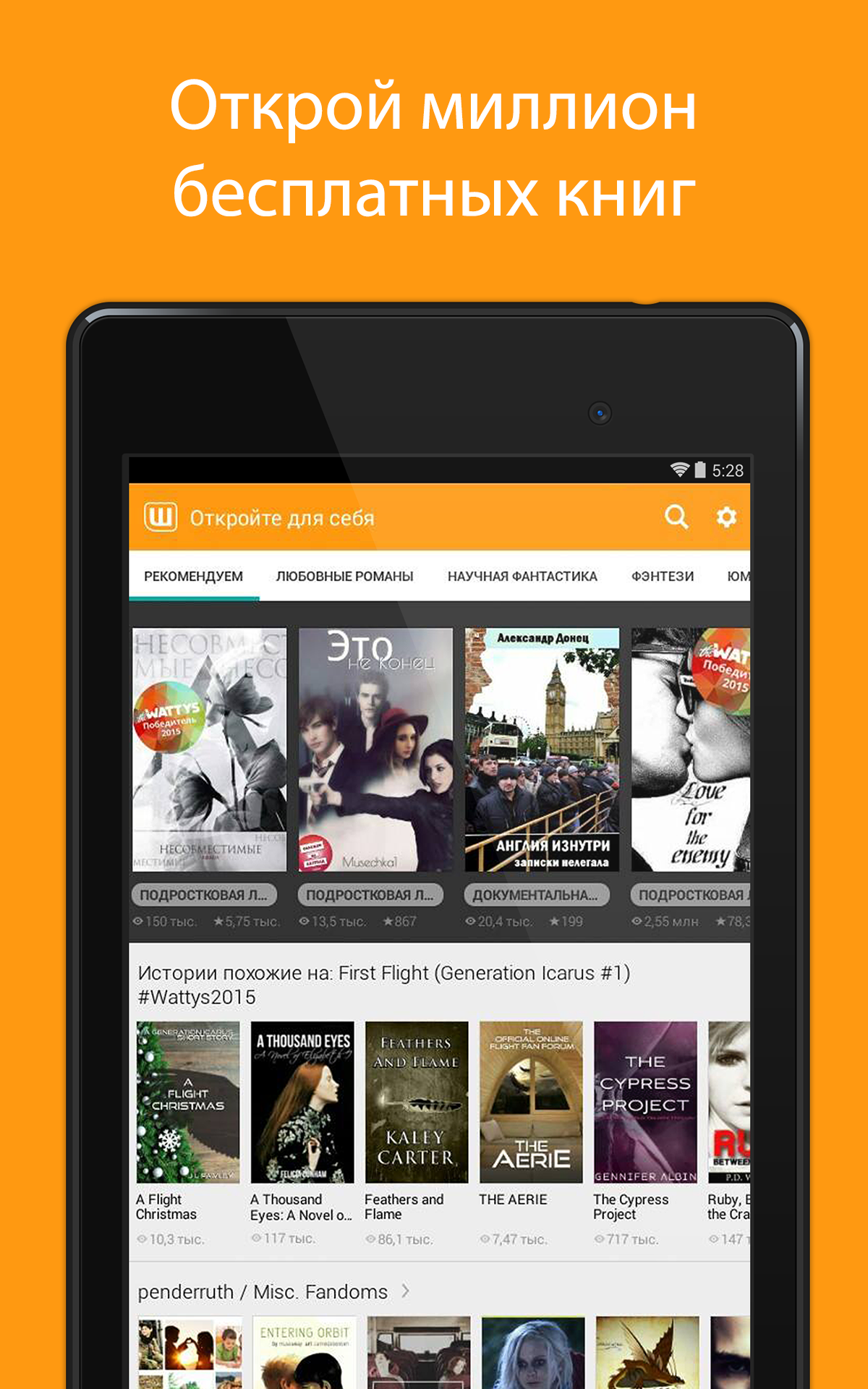 Найди новый сюжет, который увлечет тебя Читай и пиши оригинальные истории на своем родном языке. Открой для себя социальную платформу для любителей книг и международное сообщество, объединенное общей страстью к увлекательному повествованию. Скачай Wattpad, чтобы приступить к чтению или написанию книг уже сегодня. Присоединяйся к Wattpad, чтобы стать участником международного сообщества любителей книг. Общайся с другими увлеченными читателями и писателями, комментируй книги прямо во время чтения и поддерживай писателей, которые создают и публикуют свои оригинальные произведения. Ты также можешь читать в совместном режиме, делиться своей библиотекой с другими людьми и создавать списки для чтения, чтобы твои друзья могли знать, что ты сейчас читаешь. Открой миру свою историю. Хочешь рассказать свою историю? Используй силу сообщества и технологий Wattpad, чтобы донести ее до людей. Поделись своими оригинальными историями и писательскими идеями с нашим сообществом, которое поддержит тебя на всех этапах пути писателя. Считаешь, что твоя книга — готовый бестселлер? Wattpad WEBTOON Studios находит на Wattpad талантливых авторов, еще не подписавших контракт с издателем, и помогает им установить контакт с международными компаниями из отрасли мультимедийных развлечений. Многие истории, изначально найденные на Wattpad, впоследствии были адаптированы в сериалы, фильмы и книги, завоевавшие поклонников по всему миру, — например, «Будка поцелуев», «Идеальная зависимость», «После» и многие другие. В чем особенность Wattpad? Приложение Wattpad — это миллионы рассказов, книг, фанфиков и стихов от писателей со всего мира, на более чем 25 языках. С помощью приложения ты можешь как читать книги, так и писать свои собственные, после чего публиковать их в открытом доступе. Увлеченные читатели и писатели ждут тебя в сообществе Wattpad. Преимущества Wattpad, лучшего приложения для читателей и писателей - Читай миллионы бесплатных историй - Исследуй популярные жанры книг, в числе которых любовные и фантастические романы, фанфики, историческая проза, фэнтези, детективы, книги для подростков и многое другое, а также не менее захватывающие жанры: романы про оборотней, мафиозные триллеры, повести в жанре темной романтики и книги про роман с миллиардером. - Находи популярные книги по названию - Создай собственную бесплатную библиотеку и сохраняй любимые истории, чтобы они всегда были с тобой - Скачивай книги, чтобы читать без подключения к интернету - Оставляй комментарии и голосуй за любимые книги - Получай уведомления о выходе новых глав - Начни свой путь писателя уже сегодня! - Общайся с сообществом книгоманов и любителей фанфиков - Книга затянула с головой? Просто синхронизируй свой аккаунт, чтобы легко продолжить чтение или написание с компьютера, мобильного телефона или планшета В нашем приложении для чтения ты найдешь множество популярных электронных книг, включая такие, как «Lost Luna», «Ex-Husband Turned Boss» и «Chasing Red». Уже пользуешься Wattpad? Подпишись на нас в соцсетях, чтобы быть в курсе новостей о твоих любимых писателях, книгах, конкурсах и многом другом. Instagram: https://www.instagram.com/wattpad/ Facebook: https://www.facebook.com/wattpad/ TikTok: https://www.tiktok.com/@wattpad Twitter: https://x.com/wattpad