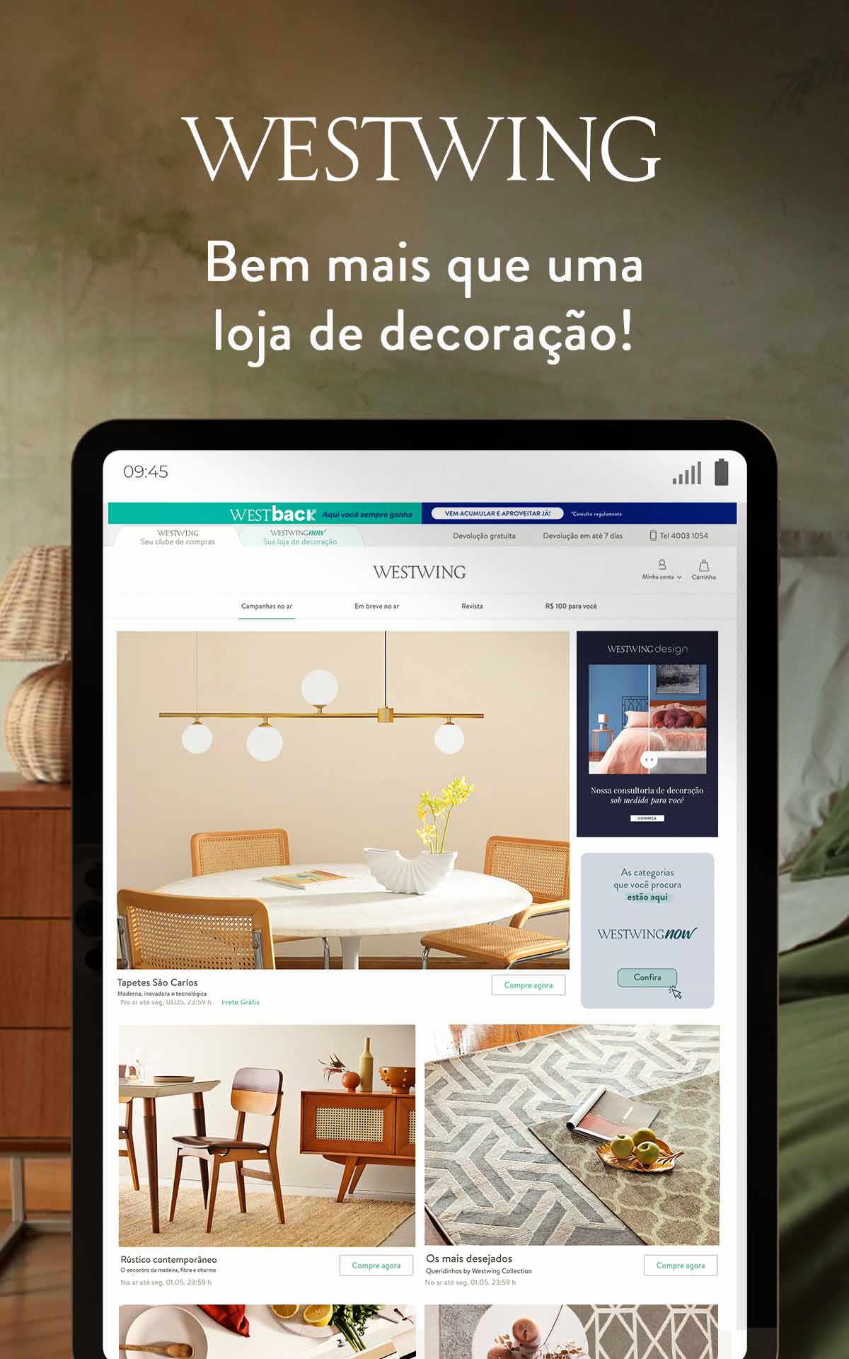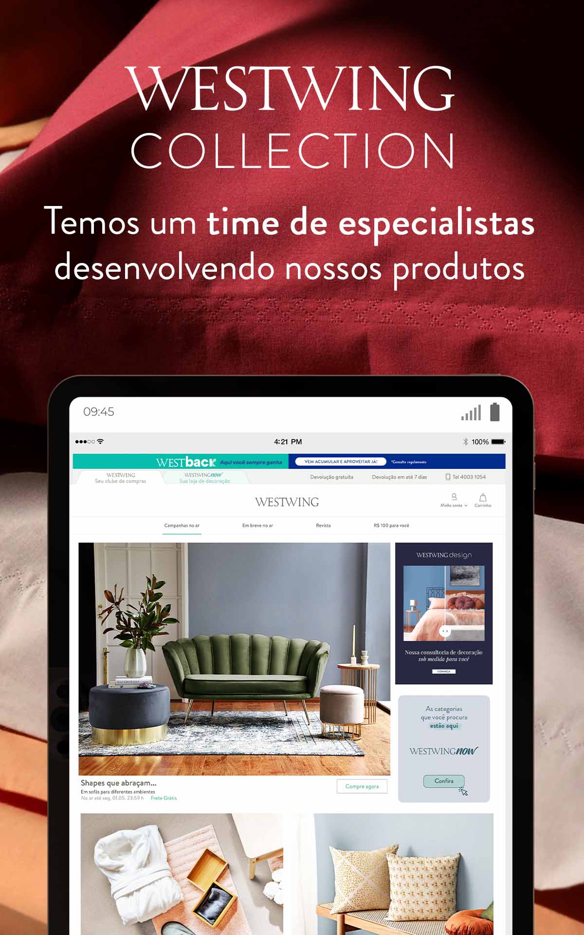 Пригласив друзей на встречу с WESTWING, они получат ваучер на 100 реалов при первом входе в систему. А после первой покупки вы также получите ваучер на 100 реалов, который можно использовать по своему усмотрению. *Проверьте правила в приложении.