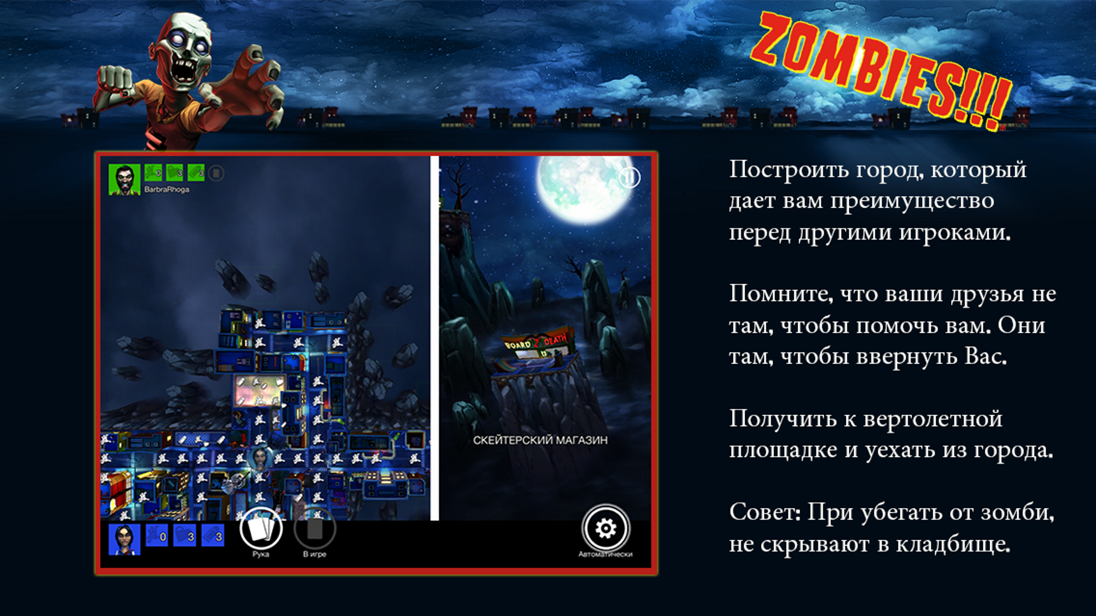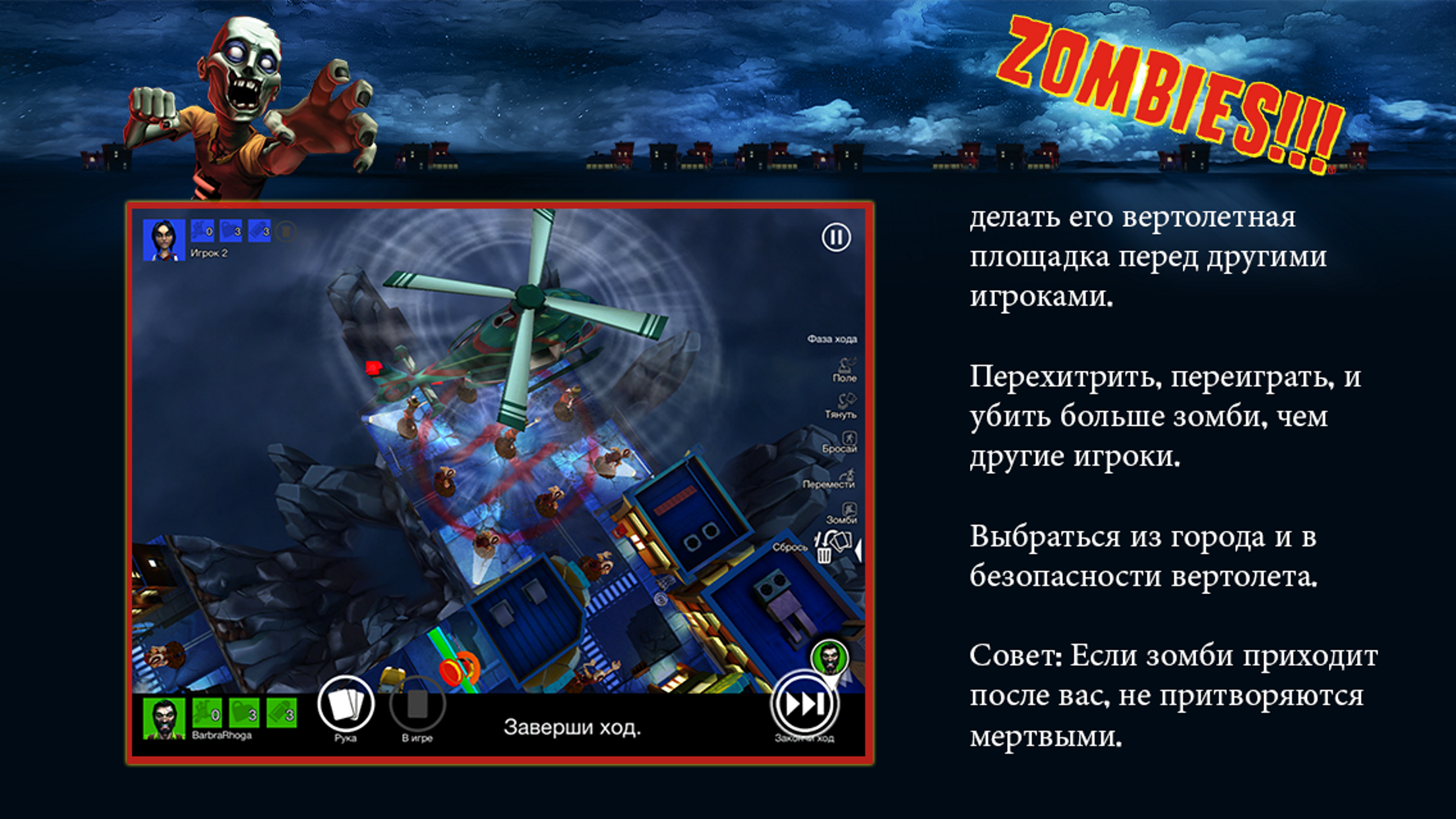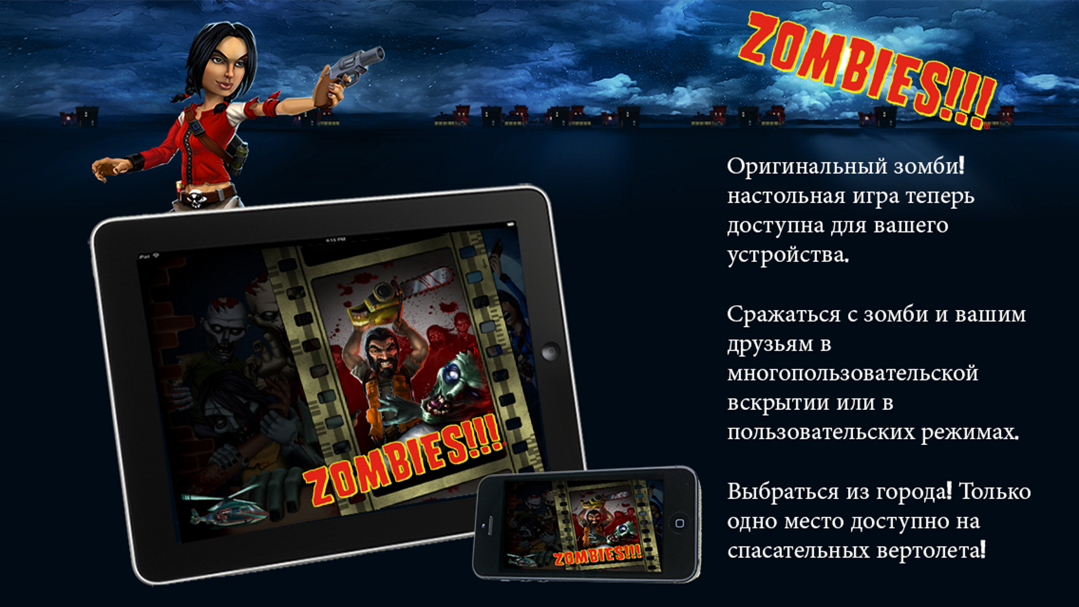 Zombies!!! Здесь игроков мгновенно подхватывает водоворот событий, и им придется искать пути к спасению среди наступающих орд зомби. Примени весь свой ум и силы, чтобы первым добраться до взлетной площадки и осуществить побег. Но вот беда, зомби повсюду, и, похоже, они очень голодны. А твои соперники явно не хотят становиться жертвами. Если у тебя есть вопросы, просьбы, идеи или ты хочешь сообщить об ошибках, отправь нам сообщение по электронной почте из меню "Инструкции". Или посети веб-сайт нашей службы поддержки по адресу http://zombies.babaroga.com либо http://facebook.com/babarogagames. Мы действительно переживаем за эту игру, поэтому если у тебя есть какие-либо предложения по ее улучшению, мы обязательно реализуем их в следующих обновлениях. Нам интересно узнать о тебе, игра и твой игровой опыт.