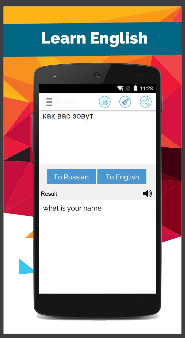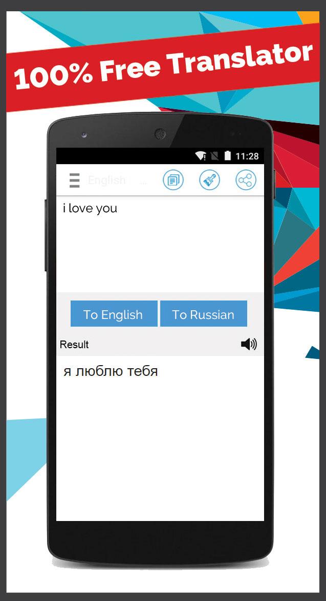Free Russian English Translator Translate text, word or sentence from Russian to English or from English to Russian language. This app can be used as a Russian English Dictionary too. A must have Translator for students, travelers, language enthusiasts and for everyone. You can learn Russian or English at your convenience - at home or at school or during your commute - a translator that works every where and every time. Some of the benefits of Russian English Translator are following: - Russian English Translator - English Russian Translator - Simple User Interface(Easy to use for Translator) - Listen translated text, sentence in English or Russian. Comes with Live Pronunciation. - Use it as a Russian to English dictionary or English to Russian Dictionary. - Social Media - Easily share with Friends and Family. Download now and Translate easily.