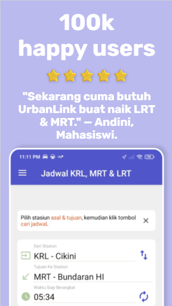 UrbanLink is the most complete public transport schedule app for KRL Commuter Line, LRT Jabodebek, and MRT Jakarta. Get fastest routes, real-time schedules, and fare information in one app!