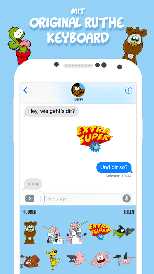 Black, but warm humor distinguishes the drawings and videos of Ralph Ruthe. With the rod cartoons app and keyboard you now have access to more than 200 of his best pictures, emoji, stickers and GIFs. So you can finally use its funny comics and characters while chatting and writing messages. You can find it all his well-known cartoon characters: the fins, ENT WG, Biber & Tree, Pete, Thorsten Dörnbach and popular characters from Ruthes advertising parodies. Exclusive to the app Ralph Ruthe has drawn the fin actor Barry and Sting with the main Smilie expressions: Laughing wink, annoy, anger, blushing u.v.m. So you have a suitable Emoji for every situation. Sends the images directly from the app or installed you the Ruthe keyboard. Parts you can emoticons and pictures on Instagram, WhatsApp, Facebook, iMessage, Facebook Messenger, Twitter, SMS or email. In the app you can even make your own memes and customize the text. The personalized stickers can be saved as an image. The keyboard works in all Messenger apps that support copying and pasting graphics and GIFs. The app also includes a QWERTY keyboard.
