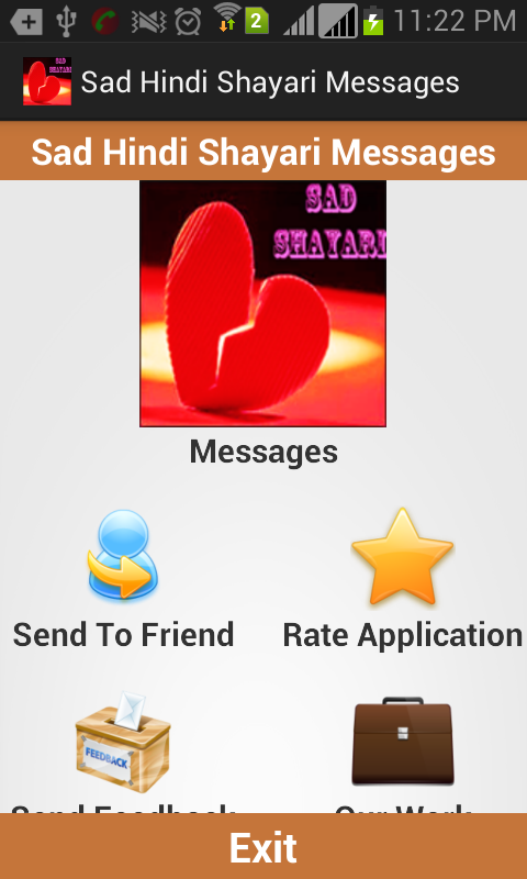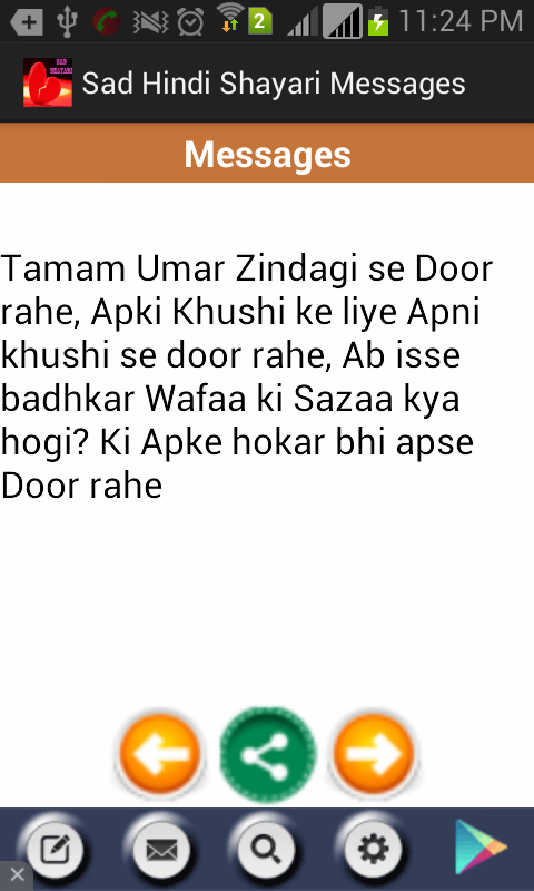 Sad Hindi Shayari Messages (Package Name: com.yv.h_sad_shayari) is developed by Bhavsar InfoTech and the latest version of Sad Hindi Shayari Messages 1.0 was updated on May 3, 2016. Sad Hindi Shayari Messages is in the category of Social. You can check all apps from the developer of Sad Hindi Shayari Messages. Currently this app is for free. This app can be downloaded on Android 2.2+ on APKFab or Google Play. All APK/XAPK files on APKFab.com are original and 100% safe with fast download.