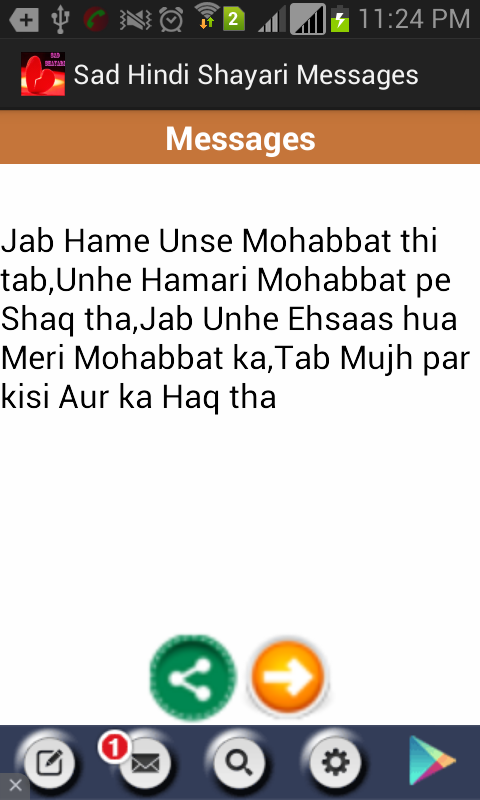 Sad Hindi Shayari Messages Free Sad Shayaris SMS Messages Collection Very Heart Touching Sad Love Shayari Sms Messages Quotes in hindi, Best Dard Bhari Shayari on Pyar Mohabbat, Painful Heart Broken Lines with Images "Sad Shayari" or dard shayari section of this site is a concept to share the pain of thought about broken heart in love. So don't waste your thoughts and shayaris but share them with us so that world can see your thinking and truly in your way. We provide a platform where you can share your shayaris with world and we encourage all types of sad poetry in language like hindi. So, what are you waiting for, just start reading our sad shayari. If you like any shayari you can send it to your friends. Also don't forget to rate these dard shayaris. We provide a simple & elegant way to share your favorite text messages with your family and freinds. Shayari is unique poetic way to express yourself your feelings deep in heart. This app is the right place for Specially Dard Shayari on every Best in class like Dard bhari shayari break up Shayari Sad Shayari bewafai. Very Heart Touching Sad Love Shayari Sms Messages Quotes in hindi, Best Dard Bhari Shayari on Pyar Mohabbat, Painful Heart Broken Lines.. Features: - Easy to copy and send or share it on WhatsApp,facebook, twitter etc. - Email or SMS share shayari to your friend. - You can share the App Link to your Friend & Family Members. - If you give any Suggestion so you can click on feedback. - User interactive and simple design Sad Shayari, Bewafa Shayari, Dil tod Shayari, Hart Brecker shayari, Dard Shayari, WhatsApp Status line, Sad Pyar Bhari Shayari , Sad Shayari, Sad Quotes, Sad Pyari Shayari , Sadest Shayari ,