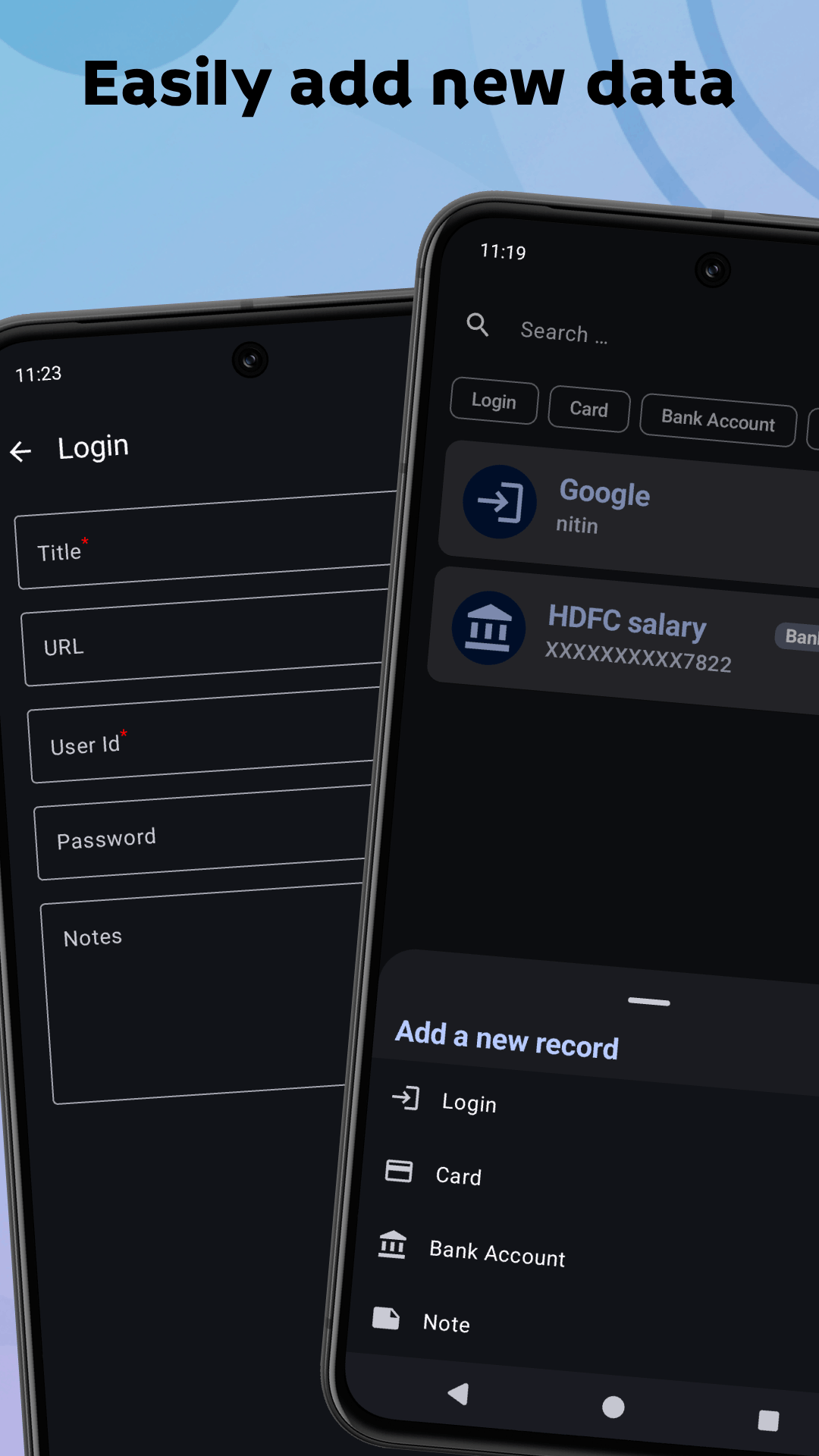 * Smart Organization: Categorize different types of data (e.g., login credentials, financial info, secure notes) for effortless navigation within your integrated password manager and data organizer.