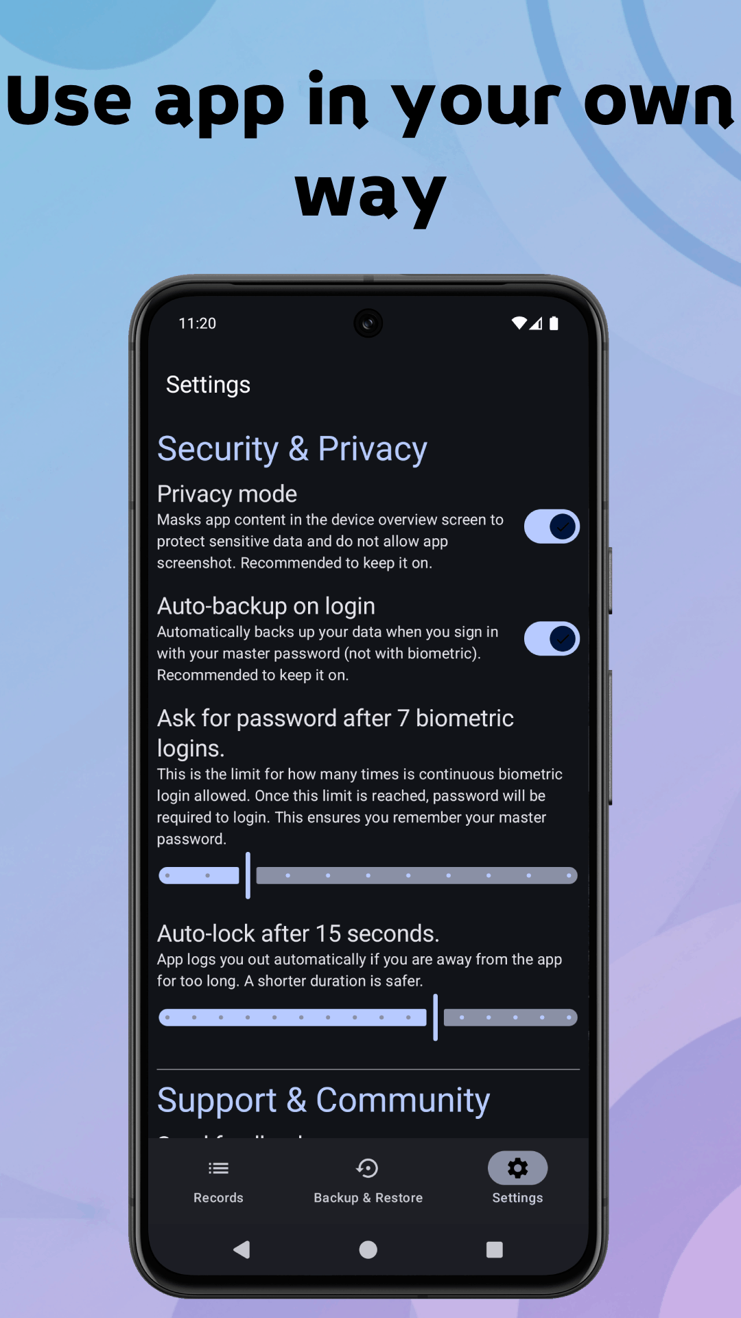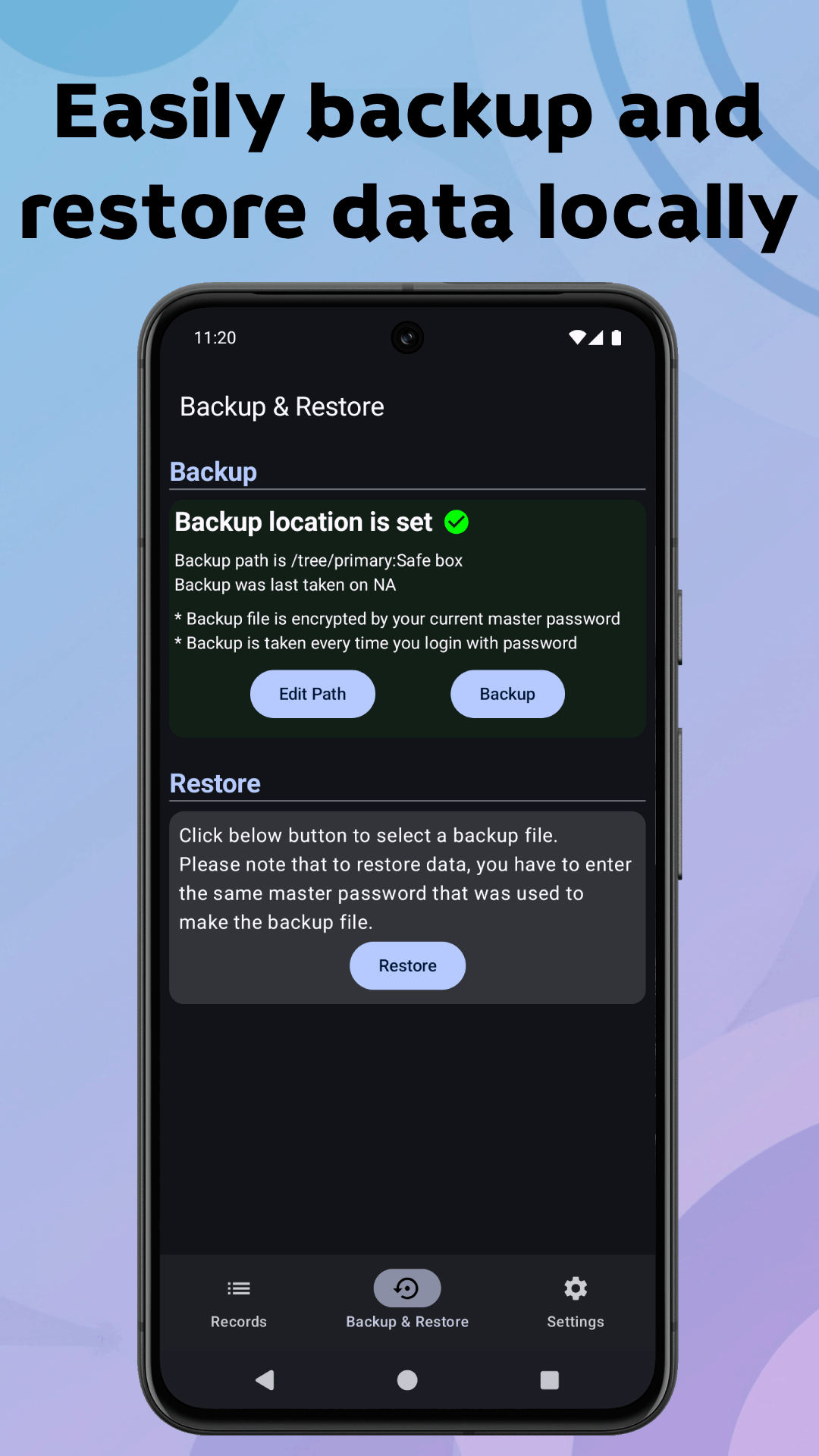 * Local Backup & Restore: Confidently backup and restore your entire safebox data directly on your device, giving you full control without reliance on cloud services.