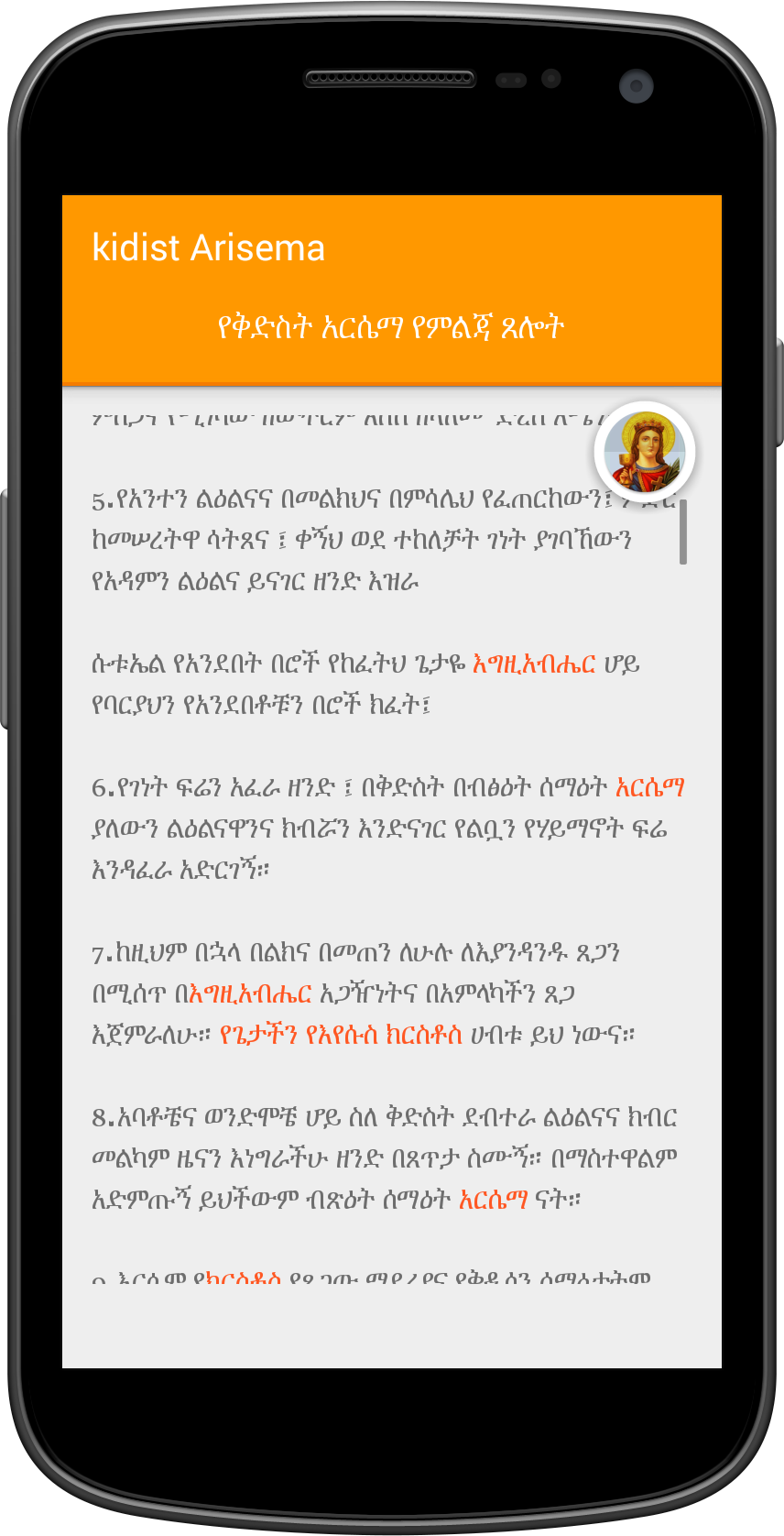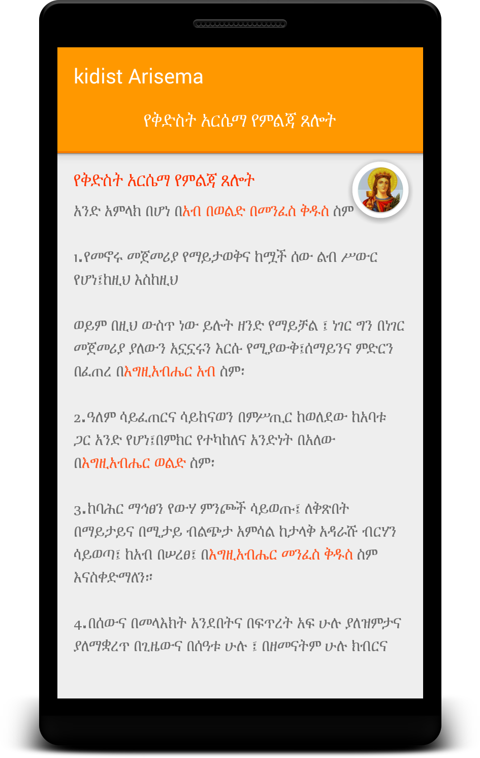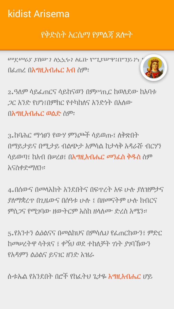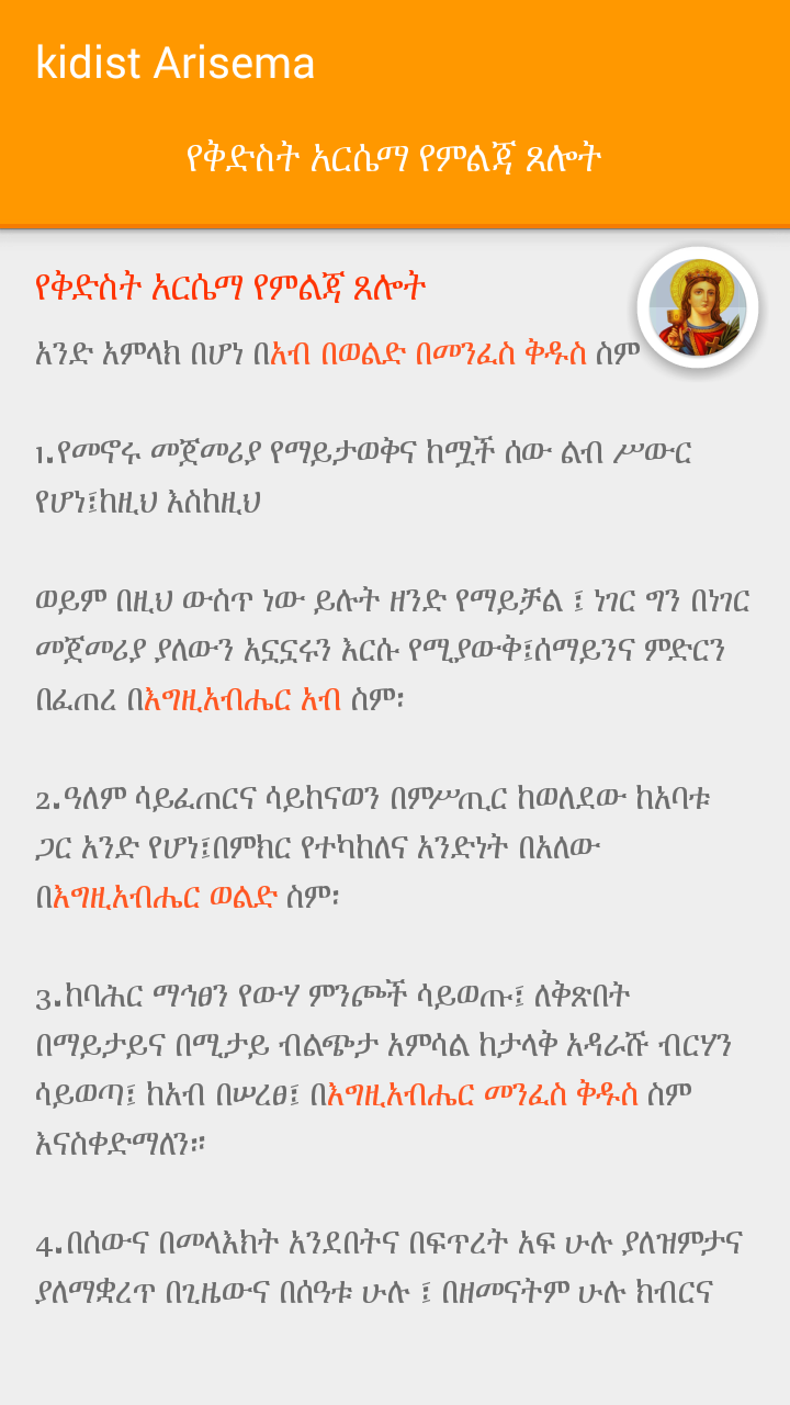 Saint Arsema prayer for every day use. With clean UI Ethiopian Amharic font. Marked with proper text font color as per EOTC writing. In Amharic only. continuse update with more content and also look at Wudasie Mariam in Amharic and Geez languages. ቅድስት አርሴማ
