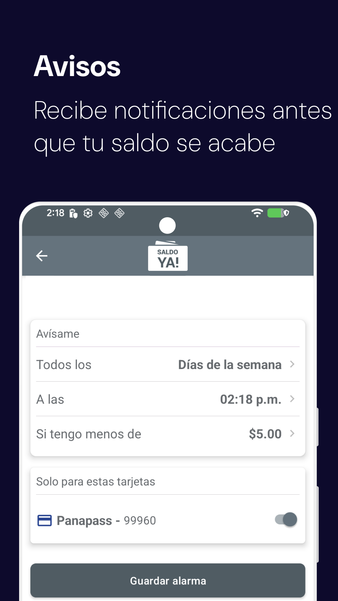 ¡Nueva funcionalidad: Alertas de saldo bajo! Configura avisos personalizados para que te notifiquemos cuando el saldo de tus tarjetas esté bajo. Elige los días, la hora y el monto límite. Selecciona cuáles tarjetas monitorear y olvídate de quedarte sin saldo.