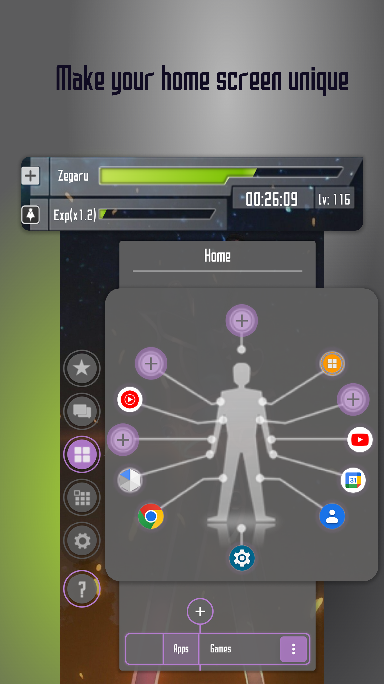 More than a launcher, your phone becomes a game. Customize your setup, complete quests, and level up as you use your phone. Zeta Launcher combines design, progression, and community into a single system. 🎨 Themes & layout Customize everything—colors, layouts, and styles. Inspired by SAO (Sword Art Online) and GGO (Gun Gale Online), with new worlds coming regularly. 📋 Daily quests Complete simple challenges every day to earn XP and keep progressing. 🔥 Streaks & rewards Stay consistent, build streaks, and unlock bonus XP and milestones. 🎵 Built-in music player Control your music, view album art, and jump into your favorite apps without leaving your home screen. 🎮 Level up & compete Gain levels, climb leaderboards, and show your progress. 📱 Flexible home experience Choose a classic app grid or switch to Zeta’s unique, immersive layouts. 🤝 Social & community Share posts, connect with others, and chat with friends directly from your launcher. 🚀 Constant updates New features, themes, and improvements added regularly. 👑 Vanguard membership Unlock faster progression, exclusive customization, and premium perks. Zeta Launcher isn’t just about how your phone looks, it’s about how it evolves. Download now and start building your world.