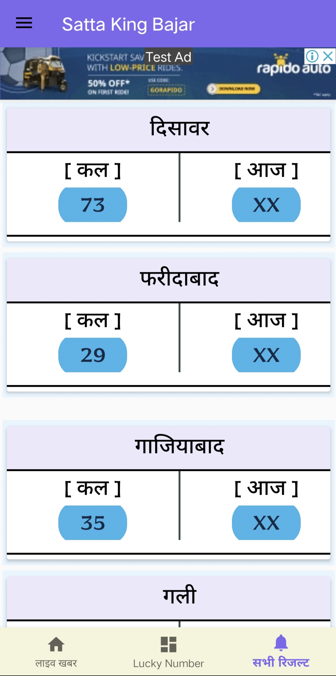 Stay up-to-date with real-time results for Disawar, Gali, Faridabad, and Ghaziabad with Satta King Result (सट्टा किंग रिजल्ट). Our app provides you with instant access to the latest outcomes, ensuring you never miss a winning number. Whether you're a fan of Disawar, Gali, Faridabad, Ghaziabad, Delhi Day or UP, Our app keeps you in the loop with real-time updates. Don't rely on outdated sources or delayed notifications. Download our app now and be the first to know the results of these popular lotteries as soon as they are announced!