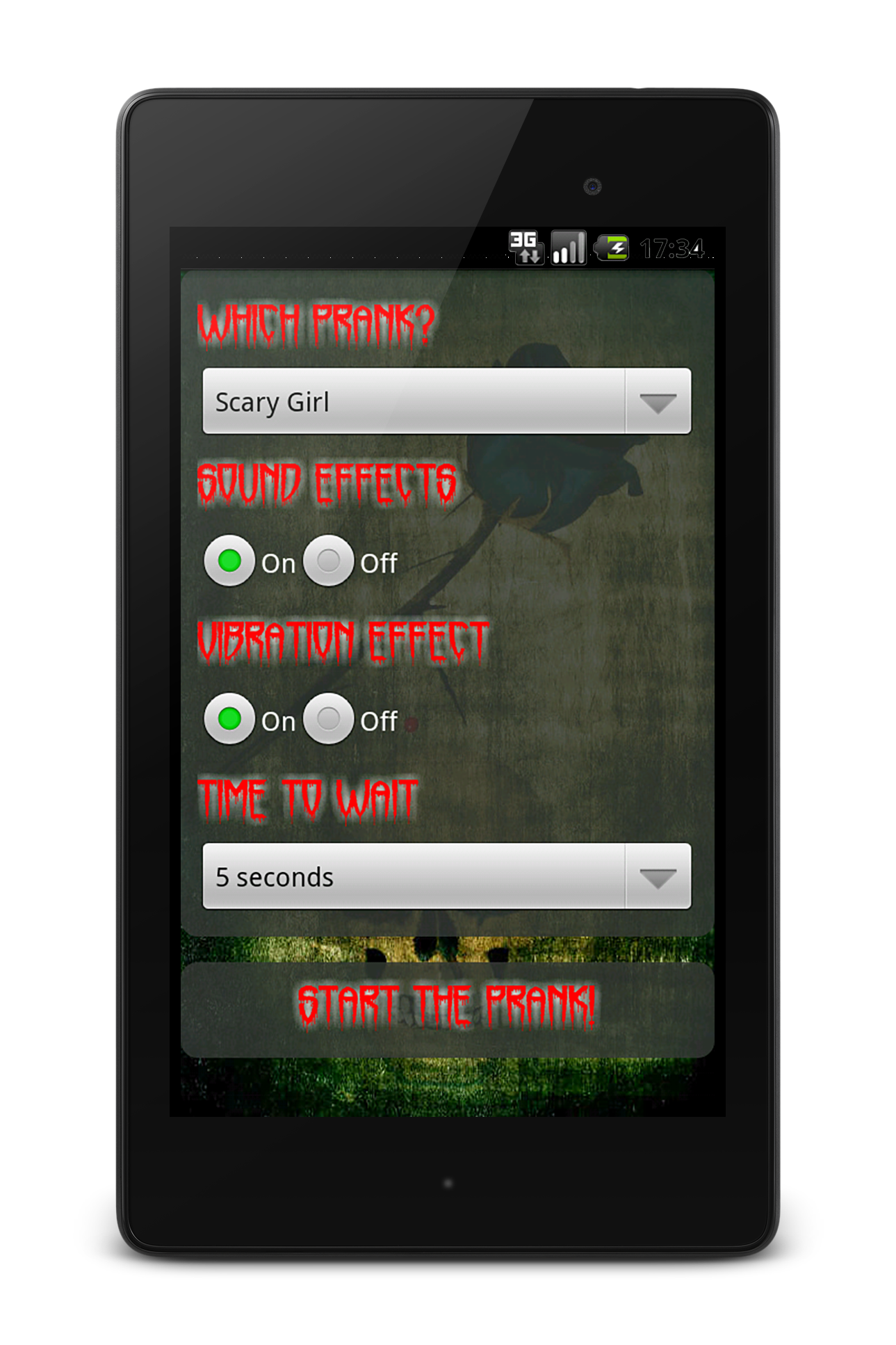 * Configure sound, vibration and the time it takes until the prank pops up on your phone