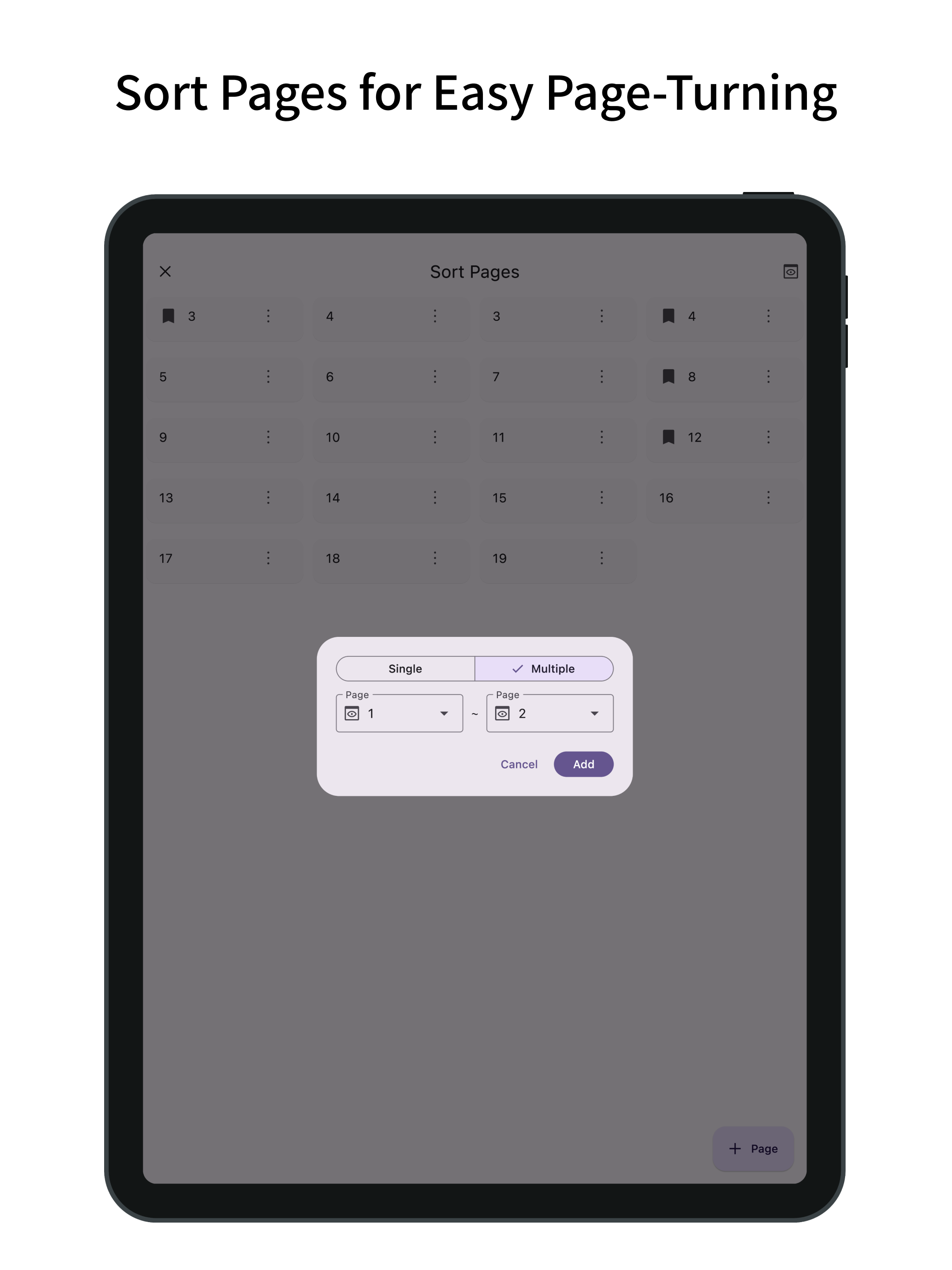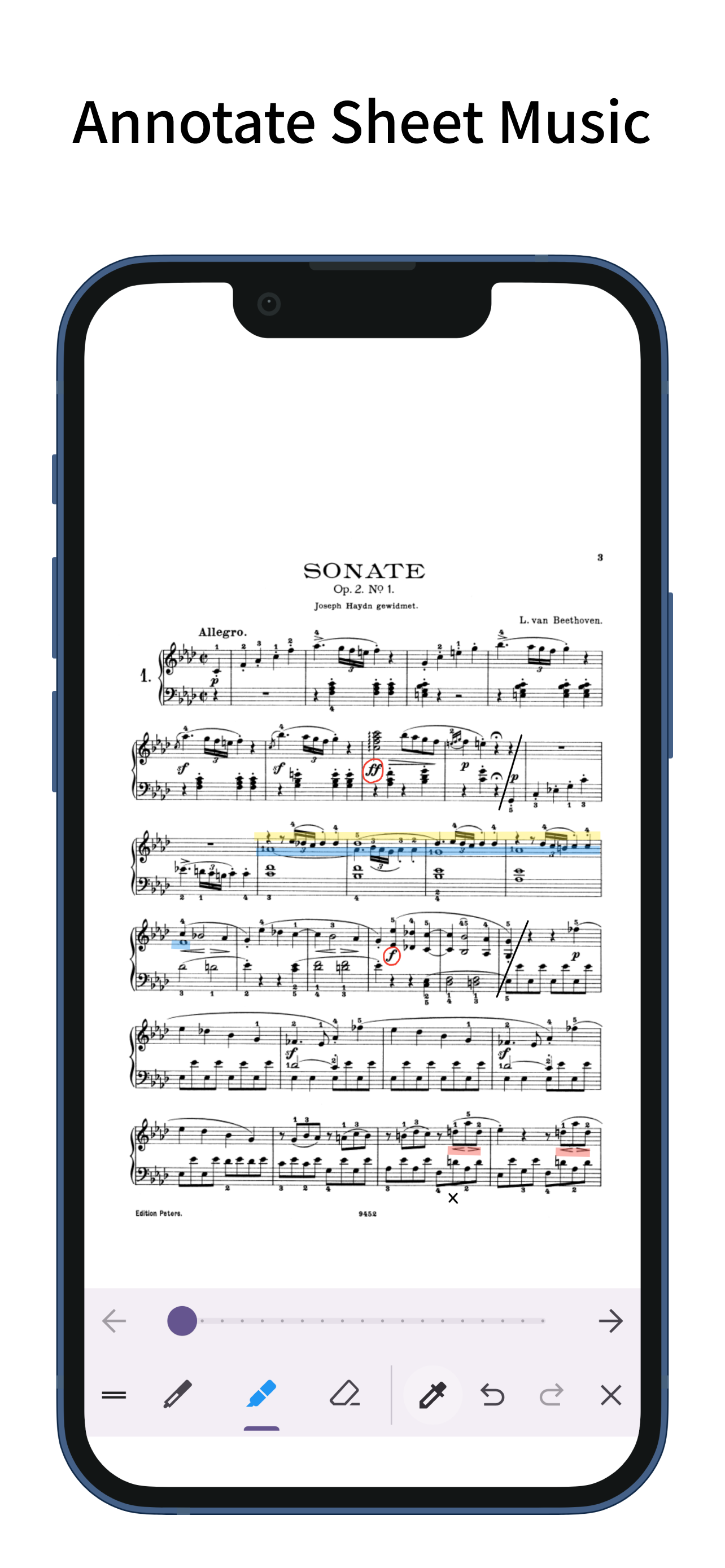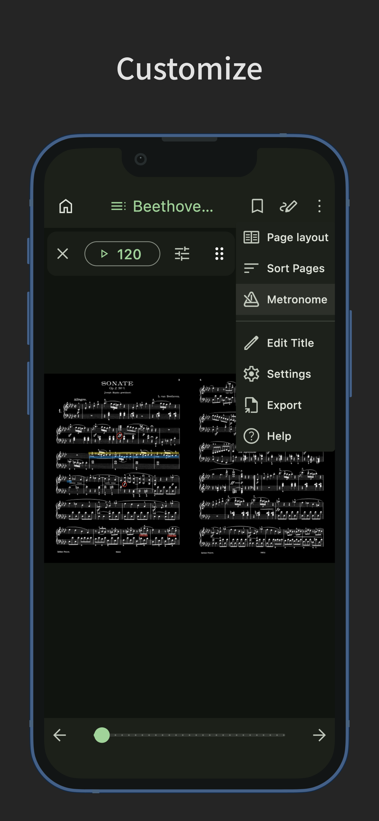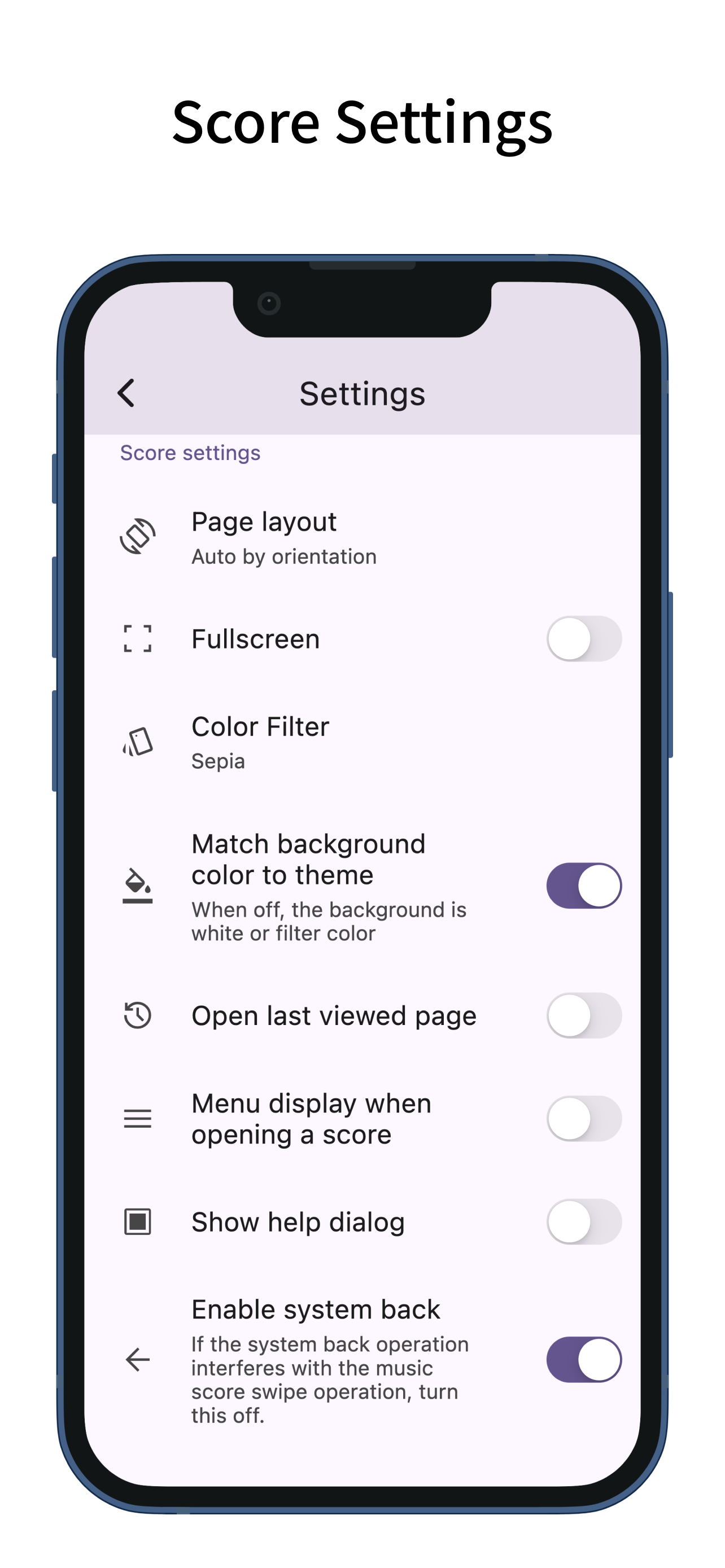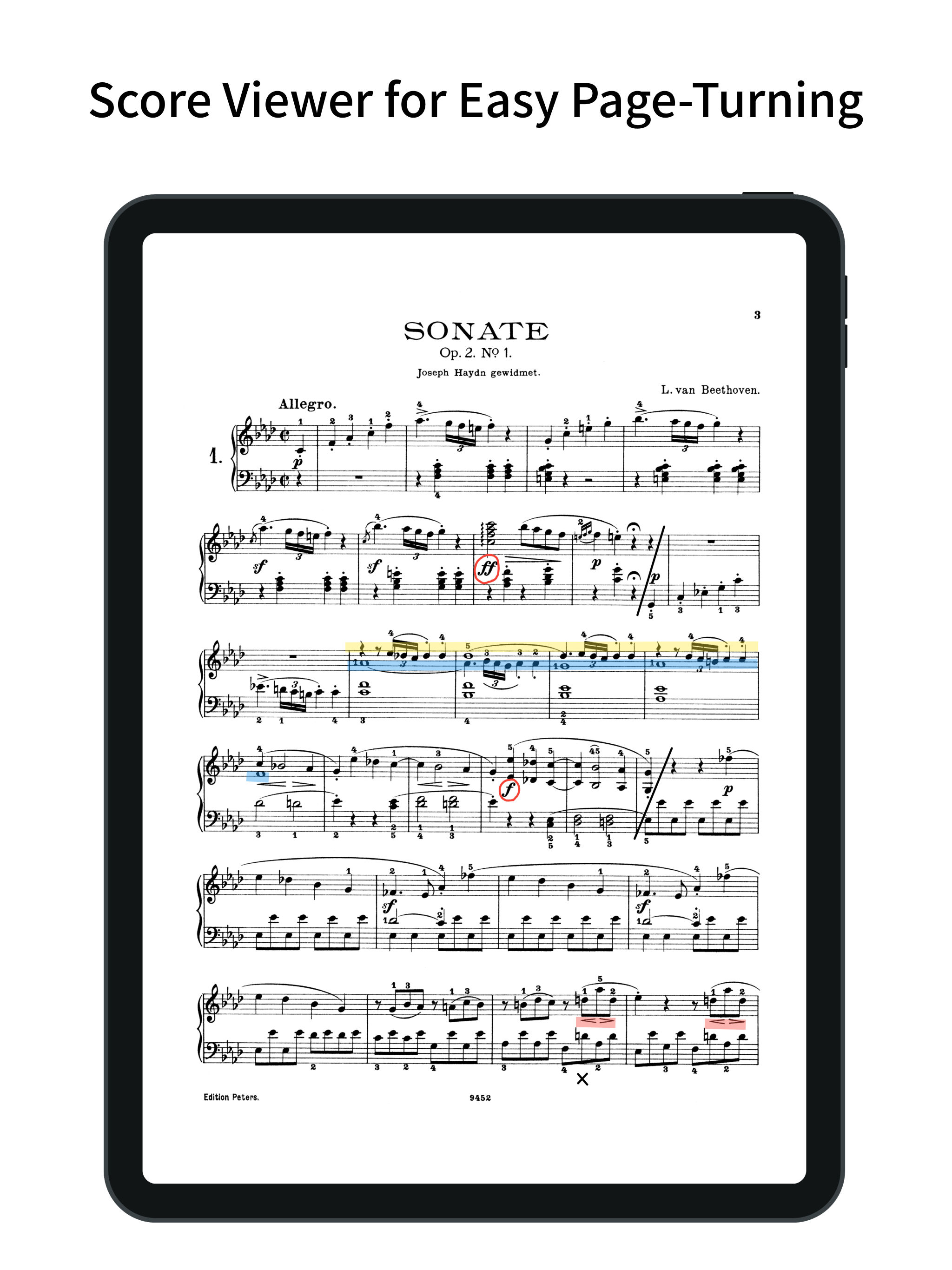 A sheet music viewer app with easy page turning. Turn pages with taps and swipes. You can also reorder the pages of your sheet music. Easy Page Turning - You can turn pages with taps and swipes. - Supports Bluetooth page-turning foot pedals. - Tap assignments can be set to: previous page, left/right, top/bottom, next page, or disabled. - Swipe gestures can be toggled on or off individually for up, down, left, and right. - Actions other than page turning (such as displaying the menu or writing annotations) can be assigned to gestures that won’t interfere with page turning, such as long-pressing or tapping the top or bottom edges. - Zoom operations on the sheet music (pinch or double-tap) can also be toggled on or off. Page Reordering - Reordering the pages makes page turning easier during repeats, dal segno, codas, and similar situations. - When adding pages via reordering, you can add and drag multiple pages at once—not just one. - You can also delete pages or add blank pages. Annotations on Sheet Music - You can write handwritten annotations on your sheet music. - Two types of pens, markers, and an eraser are available, with undo and redo functions. - Pens and markers allow you to choose line thickness and color, and you can draw straight lines. - An eyedropper tool lets you pick up colors from the screen. - You can output a PDF that includes your annotations. Setlist - You can group multiple pieces of sheet music into a setlist for continuous viewing without reopening files. - Tapping the title in the menu bar displays the list of sheet music in the setlist; tapping one jumps to that piece. Bookmark - You can add bookmarks to specific pages of your sheet music. - Bookmarks can have custom titles. - Tapping the title in the menu bar displays a list of bookmarks; tapping one jumps to that page. Page Layout - You can choose from single-page, two-page (spread), fit width, fit height, half page (top/bottom) or half page (left/right) layouts for your sheet music. - The layout can automatically change based on the screen orientation. - When selecting fit width, the sheet music is displayed at full screen width, making it easier to view on small devices. Color Filter - You can apply a color filter to your sheet music, choosing from sepia, green, or inverted. - If you find the white of the sheet music too bright, this setting may improve readability. Adding Sheet Music - You can add sheet music in PDF format. - In the sheet music list screen, tapping the plus button at the bottom right lets you add PDF files from your device. (In the setlist screen, tapping the plus button opens the setlist addition screen.) - You can also add sheet music by sharing PDF files from other apps. - Multiple pieces of sheet music can be added at once. Managing Sheet Music - The label feature lets you add labels to sheet music or setlists, allowing you to filter by multiple labels. - Tapping the search bar lets you search for sheet music or setlists by title. - Sheet music and setlists can be sorted by title, creation date, or last viewed. Customization - Supports dark mode. - Allows you to change the theme color. - Features a simple design adhering to Material Design principles.