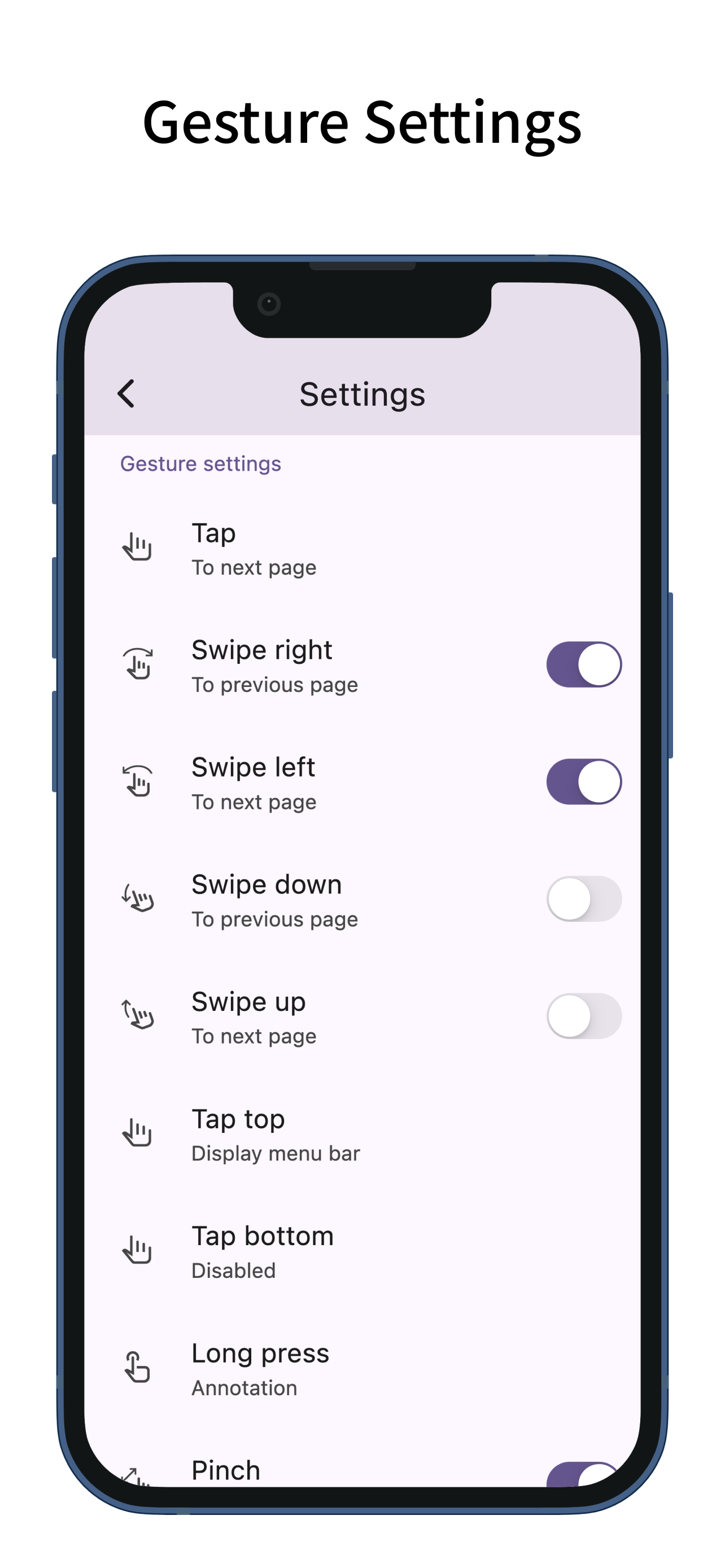 - You can now assign various functions to each gesture, such as last page, show bookmarks, etc. - Added "Tap left edge" and "Tap right edge" to gestures.