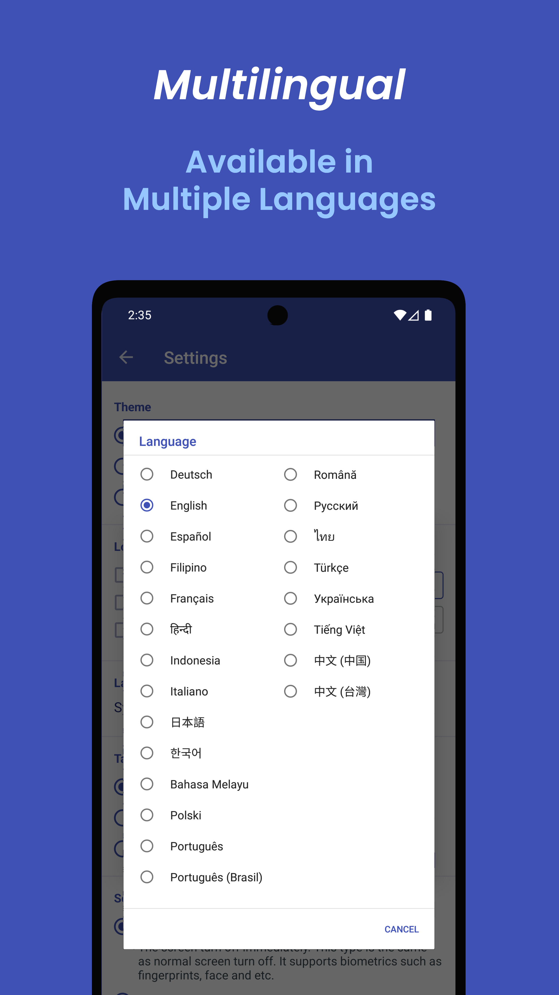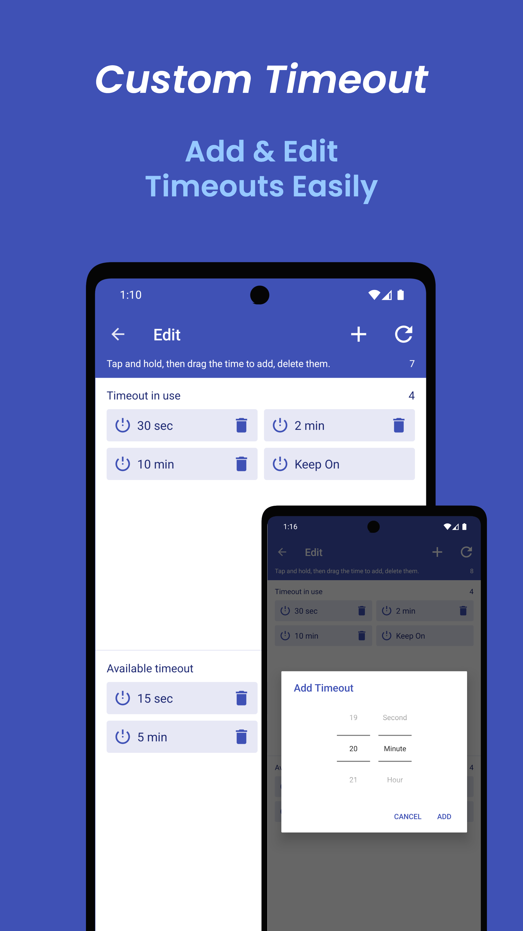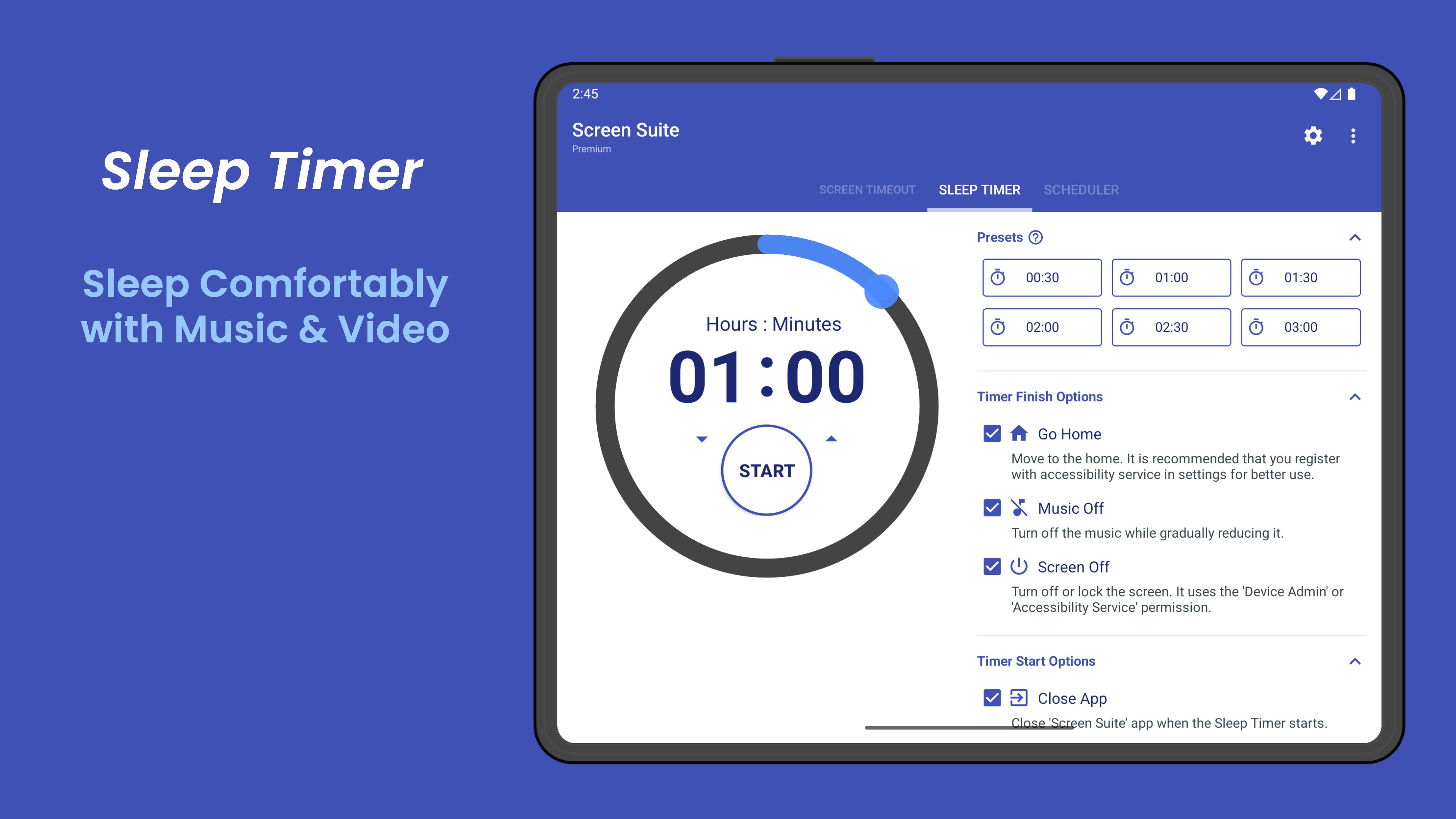 [Function Introduction] ● Screen Off Timeout Screen Off Timeout is a function to set the time the screen turns off when the device is not in inactivity (not in use, idle). (While playing game or watching video, it won't be forced screen off because it is in use.) You can change it easily and quickly using Quick Setting or App Widget. You can also keep the screen on. - Try using it like this: When the device is not in use, set it to 15 seconds to save battery, and change the timeout when you put your device down and do other tasks such as reading text or playing the piano with sheets. ● Immediate Screen Off You can quickly turn off the screen with a single touch using Quick Setting or App Widget. There are two types of screen off function, 'Lock' and 'Screen Off', and can be changed in settings. 'Lock' is a type of unlocking the device using high authentication (Password, PIN). 'Screen Off' supports biometrics such as fingerprint and face. (It is supported from Android 9.0 Pie or higher devices.) - Try using it like this: Turn off the screen with a single touch the screen without pressing the physical power button. ● Sleep Timer You can sleep comfortably while listening to video or music without worrying about battery consumption. It provides a variety of convenience options. - Try using it like this: When you want to sleep while listening to music, When you only want to play the game for a certain amount of time. ● Scheduler You can register and use the “Sound an alarm, change screen off timeout, and run sleep timer” functions at a specific time. The alarm also has a snooze and automatic snooze function. - Try using it like this: Start your day by registering an alarm and changing the screen off time at your wake-up time . Save battery by activating the sleep timer and changing the screen off time at your sleeping time. [Free Features] ● The Screen turns off automatically at the time you set when the device is not in use ● Preventing the screen from turning off ● Sleep Timer (Maximum 1 Hour) ● Scheduler tasks and alarms (up to 3) ● Timeout values editing ● Screen Off timeout app widget ● Light and Dark Theme [Premium Features] ● Add or delete the timeout values ● Sleep Timer (Maximum 8 Hours) ● Scheduler tasks and alarms (up to 100) ● Turn off the screen immediately (Supports biometrics such as fingerprints, face and etc.) ● Quick setting tiles (Supports from Android 7.0 Nougat) ● Screen Turn off app widget ● No ads This app is needed the following permissions. ● [Mandatory] Full network access Use a small amount of mobile network (5G, LTE, etc.). ● [Mandatory] View network connections Check the status of your mobile network (5G, LTE, etc.). ● [Optional] Change System Settings Use to set the screen off timeout. ● [Optional] Device Admin Use to lock the device when using app widget or quick setting tile. No personal information and data is collected or shared. ● [Optional] Accessibility service Use to turn off the screen when using app widget or quick setting tile. No personal information and data is collected or shared. [Troubleshooting] ● I cannot delete the app. If it is registered as a device administrator app, it cannot be deleted. You can delete the app by removing the 'Device Admin App' permission in the settings of Screen Off Timeout app. ● The screen off timeout function does not work. Some manufacturers limit the maximum amount of timeout a device. In this case, more than a certain value does not work. ● When the screen is turned off with the screen off function, it cannot be unlocked by biometrics. The Screen Turn Off type has 'Turn Off' and 'Lock'. 'Turn Off' type supports biometrics such as fingerprints, face and etc. ● It does not turn off while playing a game or watching a video. When you are watching a video or game, the screen does not turn off automatically because the device is in use. To force the screen off, use the 'Sleep Timer'.
