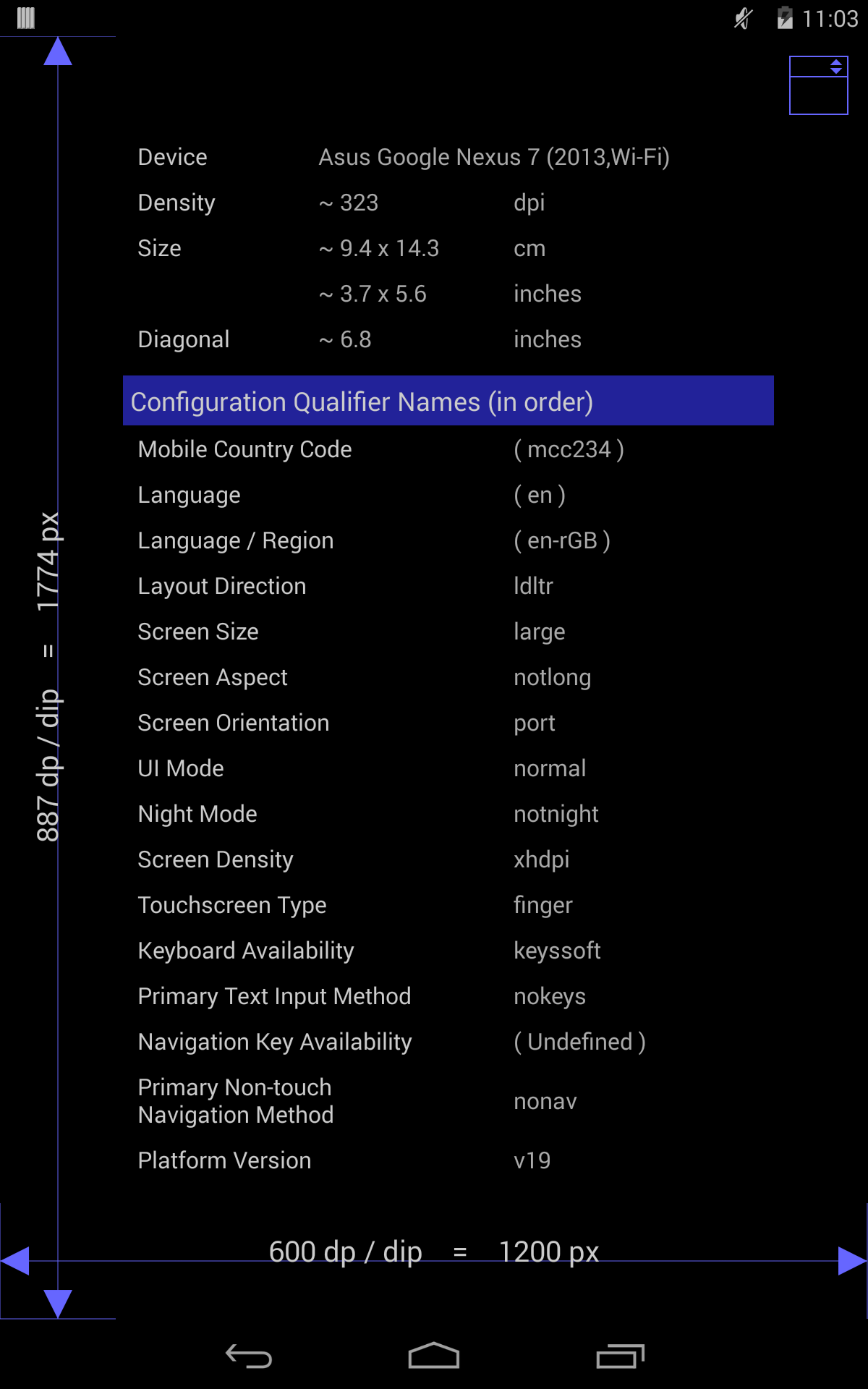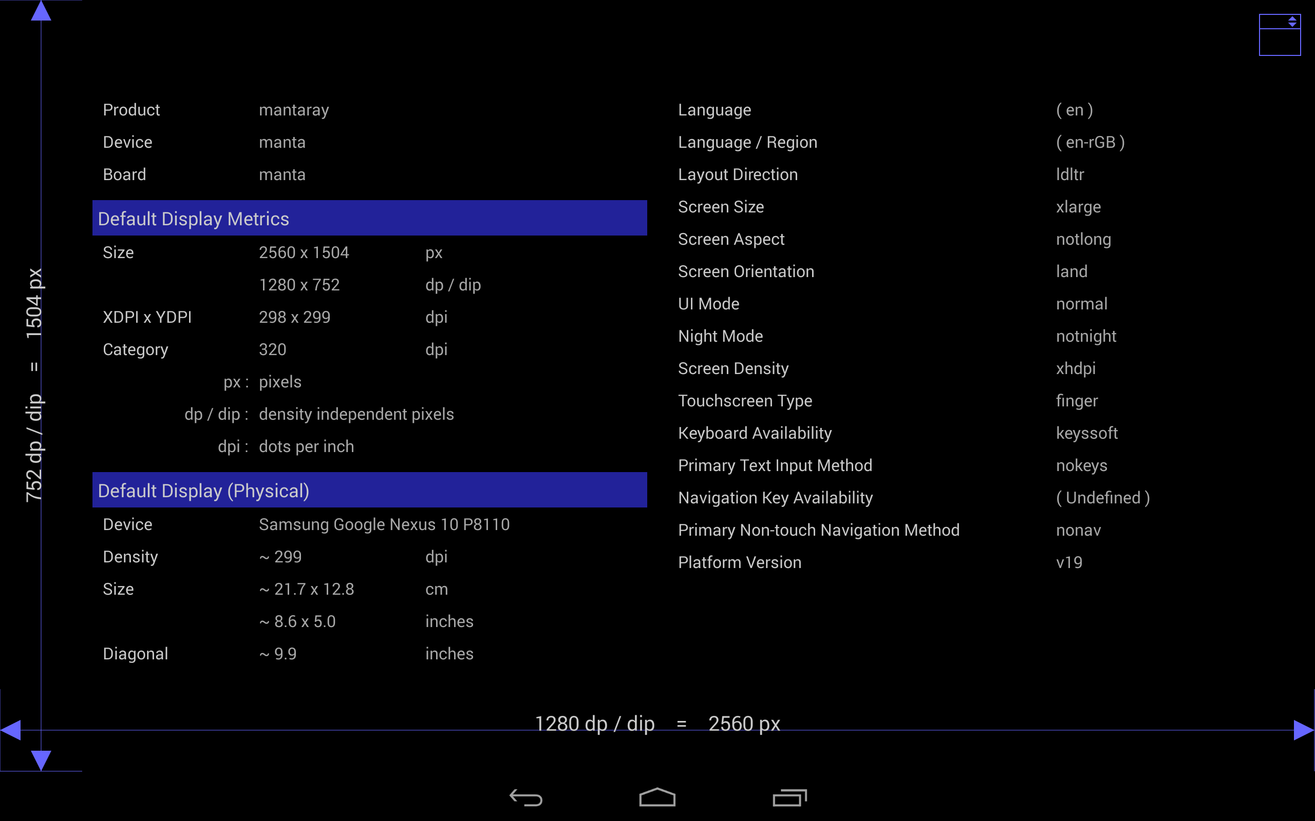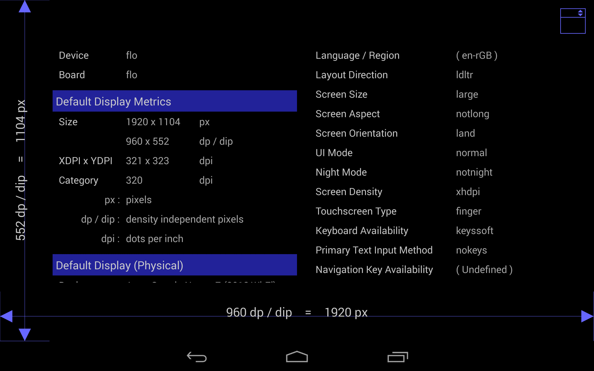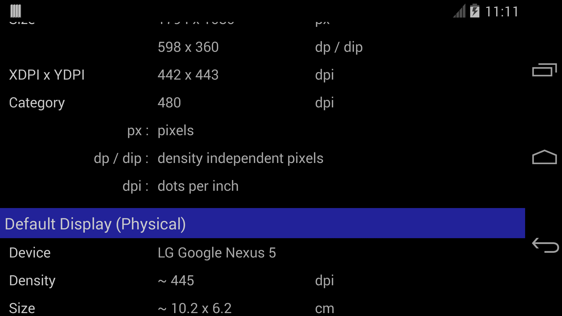 ScreenInfo provides users and developers with useful information about their screen, and configuration qualifiers. It works on all device sizes, in both portrait and landscape orientations, and on larger screens it will draw on the dimensions of the application window. On smaller screens, such as handsets, the text and graphic displays can be obtained by swiping left and right. A particularly useful feature for developers is that it displays the configuration qualifier names that may be used to supply alternate resources such as layouts, drawables or strings. For both users and developers, it shows you: - The default display size in pixels (px) and density independent pixels (dip / dp) - Reported density in dots per inch (DPI) - For known devices - approximate physical dimensions of the screen in inches and cm. For developers, it shows you some device details from the Android.os.Build class (MODEL, PRODUCT, BOARD, and DEVICE), and all the current configuration qualifier names in the order that they are used: - Mobile country code (derived) - Language (derived) - Language / region (derived) - Layout direction (API v17 / 4.2 and above only) - Screen size - UI mode - Night mode - Screen density - Touchscreen type - Keyboard availability - Primary text input method - Navigation key availability - Primary non-touch navigation method - Platform version Important Notes ----------------------- - The sizes are given for the *default display* - which is the area of screen that is usable by apps. On devices where there are soft buttons on the screen (i.e. back, home, and task manager), this will not correspond to the whole display. - The xdpi, ydpi, and category densities are *as reported by the device*. These can often differ considerably from the true screen density for your device. - Due to the density issue described above, the screen size (which is calculated from the resolution and density) is only given where the true screen density is known. If your device is missing, please provide the device name and the details shown in the "Device" section: Model, Product, Board, and Device), and I will add it to the database of known devices. - Where the configuration qualifier name is described as derived (in the app these are shown in brackets), the device is queried for these values. For the others - the values are selected from actual resource folders using those suffixes (e.g. values-ldpi, values-xlarge, etc.).