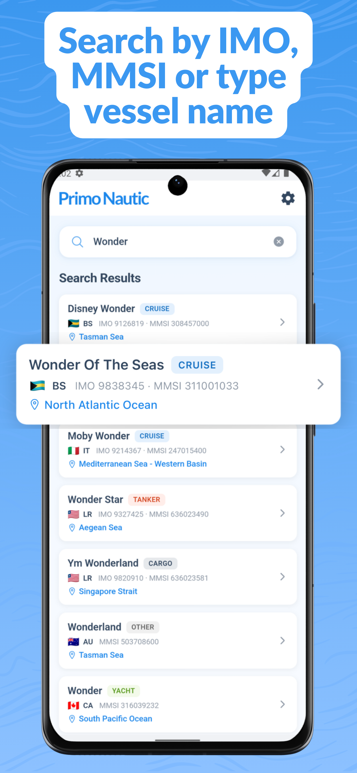 Primo Nautic is a vessel finder and ship tracker designed for people who care about ships and those aboard them. Track vessels worldwide with live marine traffic data and real-time AIS positioning. WHO IS IT FOR Families tracking loved ones on cruise ships. Business professionals monitor cargo and fleet movements. Maritime enthusiasts and ship spotters exploring vessels around the globe. Crew families stay connected with their shipmates while seafarers are at sea. LIVE SHIP TRACKING Find any vessel on the interactive map with AIS data. Get accurate ship positions, speeds in knots, courses, and destination information. Track cruise ships, cargo vessels, tankers, yachts, and boats of all types. CRUISE TRACKER Follow cruise ships in real-time. Know exactly where your family is sailing, check voyage progress, and see estimated arrival times. Perfect for parents tracking kids on cruise vacations or anyone wanting to know what's happening onboard. VESSEL INFORMATION Access detailed ship data, including vessel name, flag, type, size, and current voyage details. View port calls, departure and arrival info, and live location on the map. SMART FEATURES - Real-time marine traffic overview - Search by ship name, MMSI, or IMO number - Track multiple vessels simultaneously - ETA predictions and voyage progress - Port information and ship movements - Live map with vessel positions worldwide Whether you need a boat tracker for personal use, a fleet monitor for business, or simply want to explore maritime traffic, Primo Nautic puts the world's ships at your fingertips. Download now and start tracking vessels today.