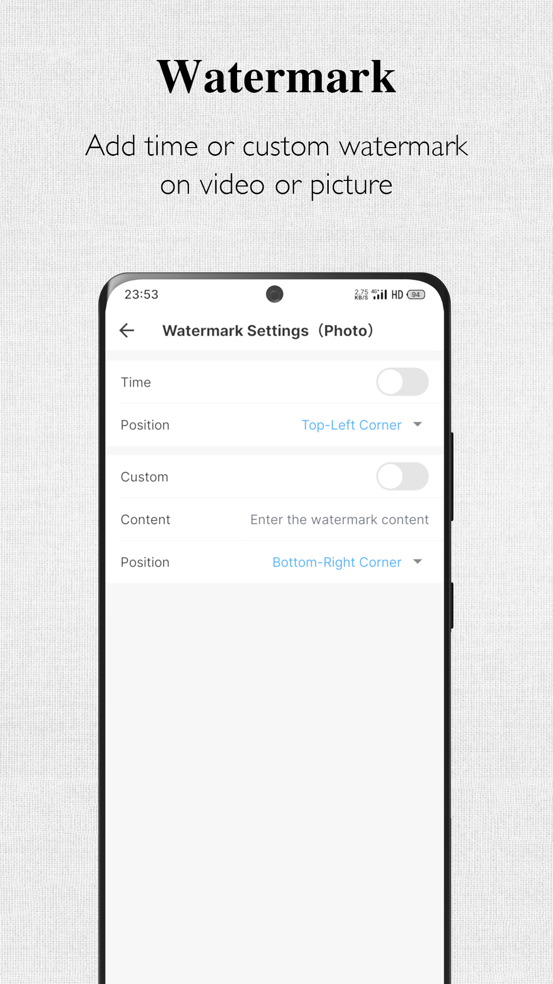 ★ Support time or custom text watermark function.