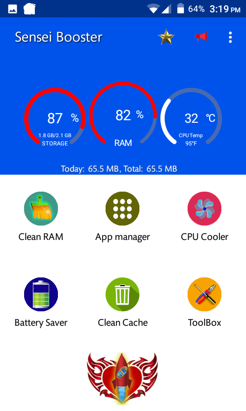 Sensei Booster is speed cleaner and optimizer; (CPU, files, Android Version, Space, Mark, Model, Screen Resolution, WIFI Signal Speed, APN, Architecture, RAM, ID, etc.) Storage Manager, manages installed applications, increases throughput, and more.