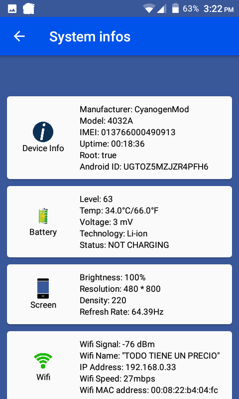 READ_PHONE_STATE (To display ONLY TO YOU the device hardware and system information like IMEI, CPU, Android ID, Manufacturer, Battery Voltage, Screen resolution, architecture, OS version, etc.)