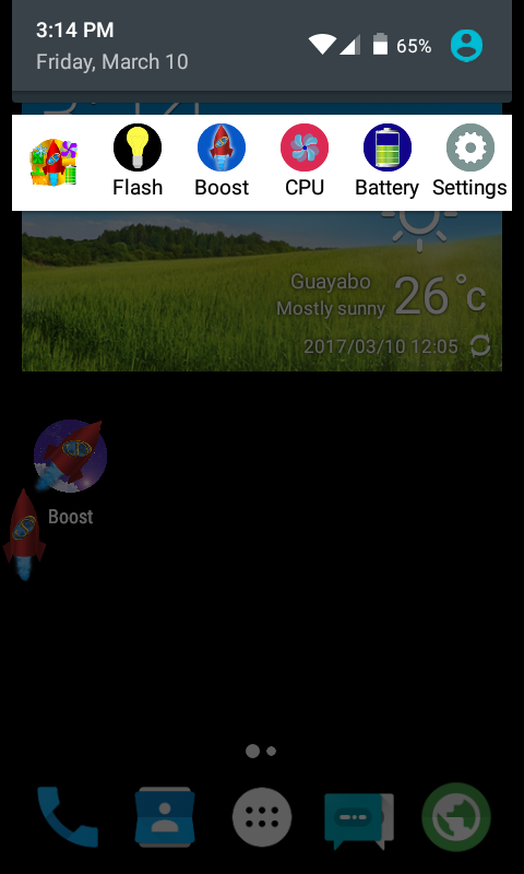 * Floating menu in the notification bar: It gives you access to: Flashlight, Accelerate, CPU cooler, Battery saver, all much needed.