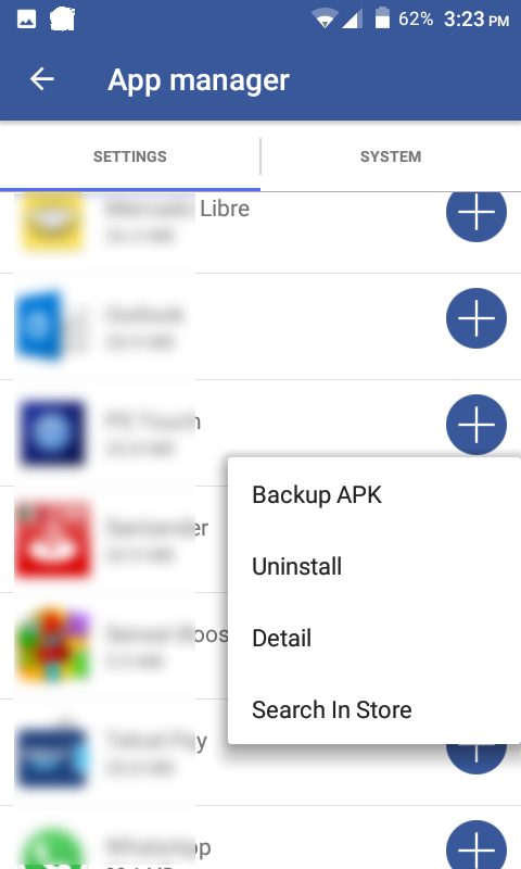 Easily uninstall any application, Backup or Manage (Storage, data, usage, permissions, notifications, battery usage, memory), or go to product page in the store.