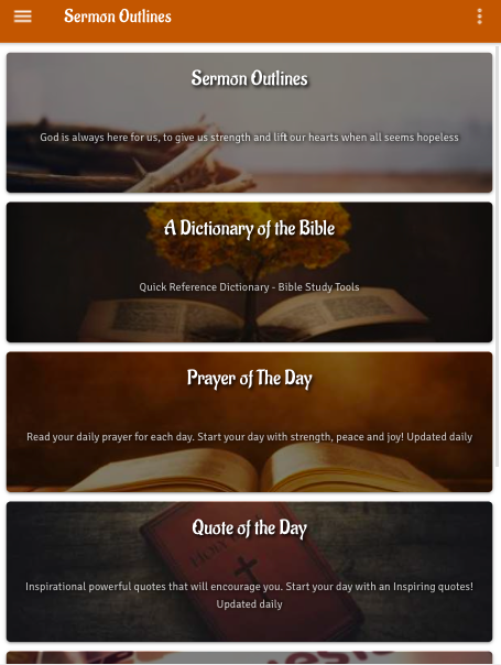 Sermon Outlines (Package Name: powerful.outlines.sermon) is developed by Most Powerful Prayers and the latest version of Sermon Outlines 01.01.11 was updated on October 26, 2025. Sermon Outlines is in the category of Books & Reference. You can check all apps from the developer of Sermon Outlines. Currently this app is for free. This app can be downloaded on Android 7.0+ on APKFab or Google Play. All APK/XAPK files on APKFab.com are original and 100% safe with fast download.