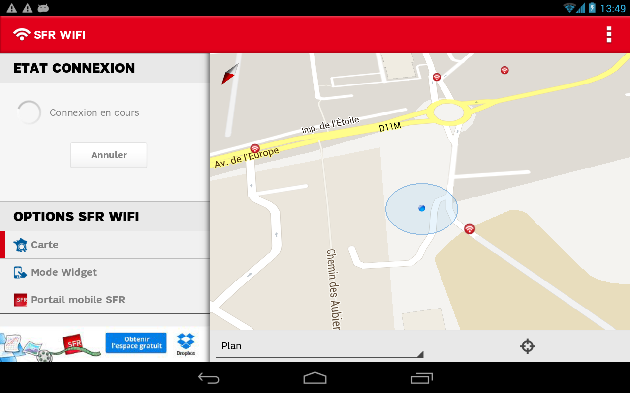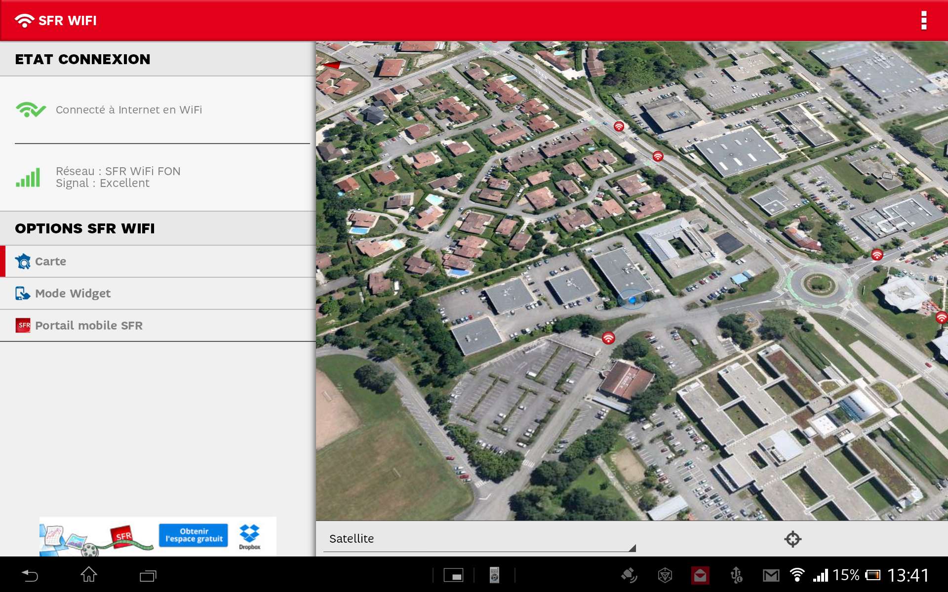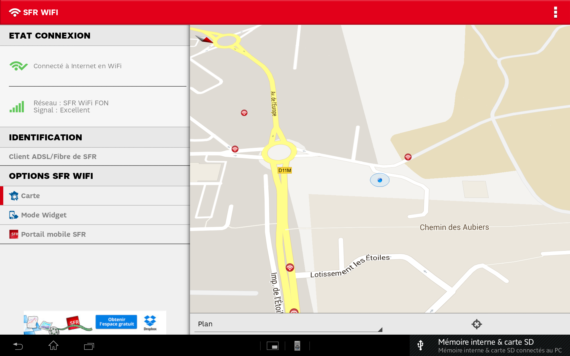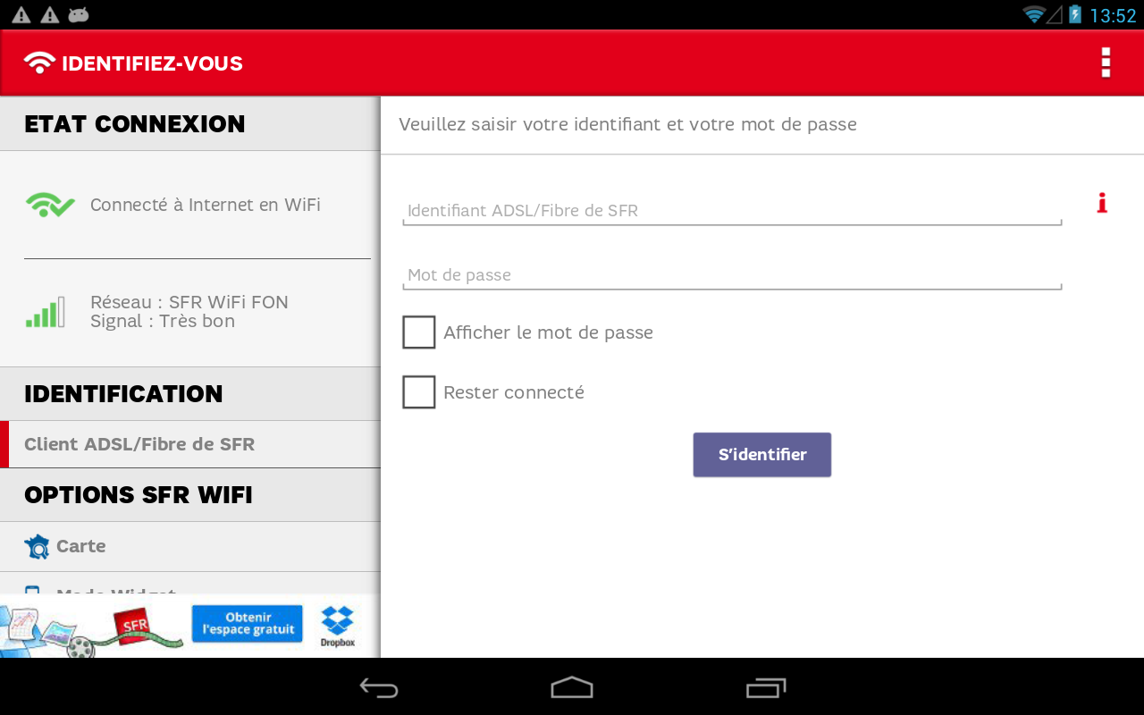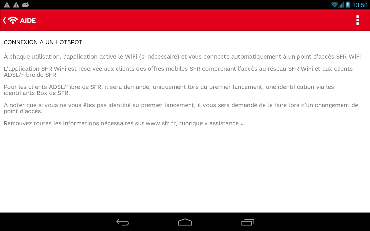 Nouvelle ergonomie ! Appli désormais accessible aux clients Box de SFR ! Avec l’application SFR WiFi, accédez à 4 millions de hotspots partout en France. L’application SFR WiFi est désormais disponible aux clients Box de SFR, comme aux clients mobile avec une carte SIM SFR ayant souscrit à une offre permettant l’accès à SFR WiFi. Pour les clients ADSL/Fibre de SFR, il sera demandé, uniquement lors du premier lancement, une identification via les identifiants Box de SFR. Egalement, retrouvez les points d'accès à proximité depuis le menu Carte WiFi utilisant la nouvelle version de Google Maps. Plus d’infos sur www.sfr.fr
