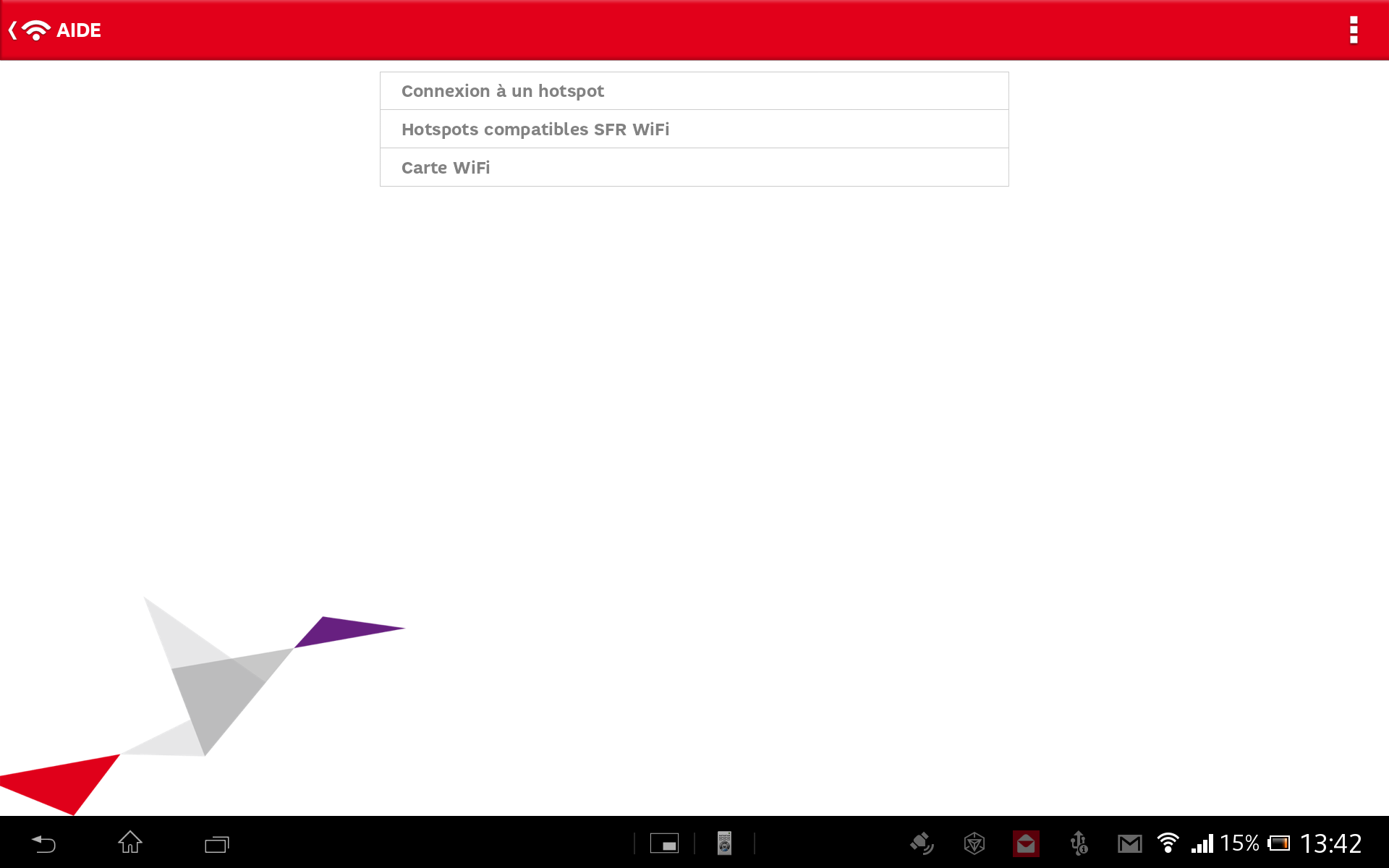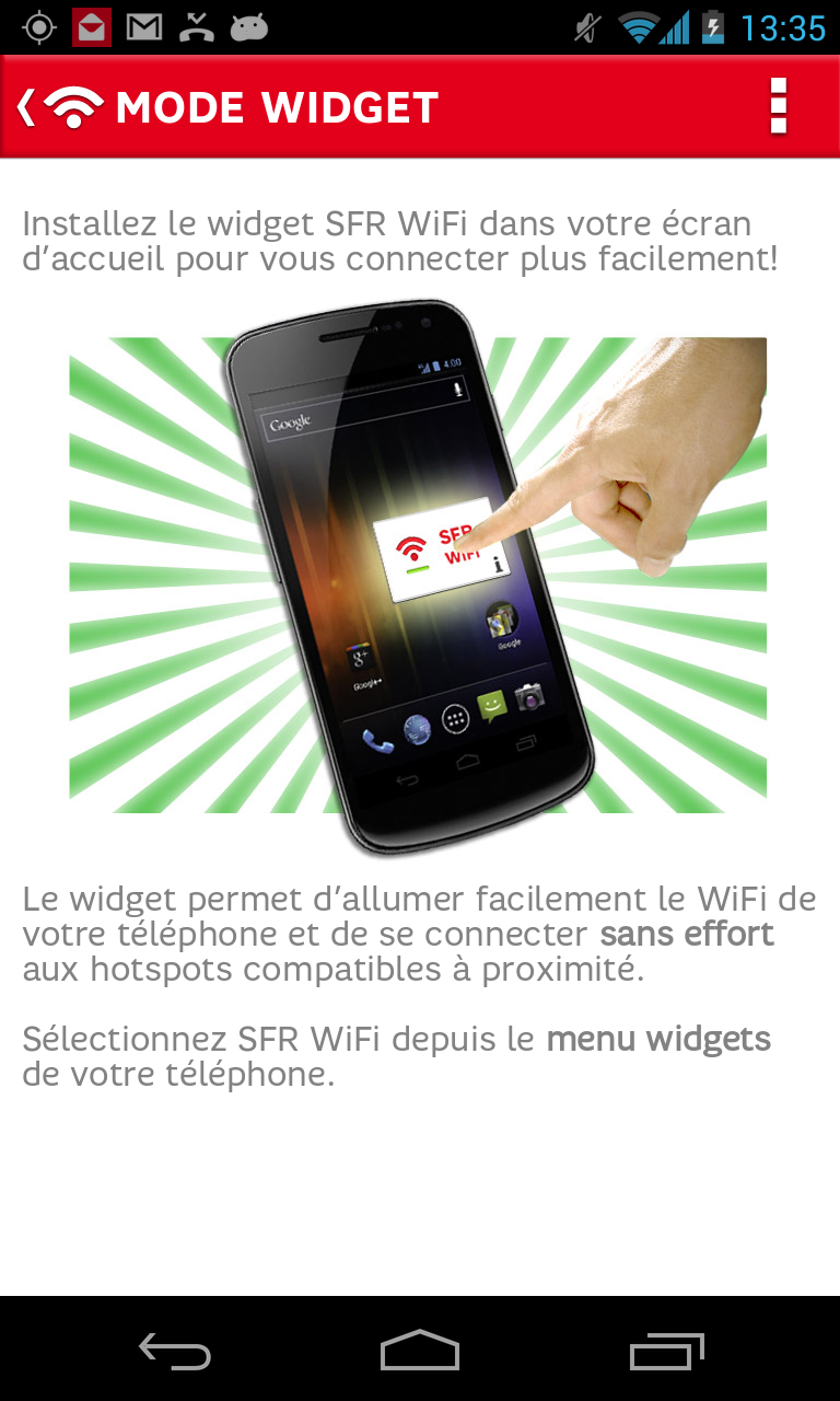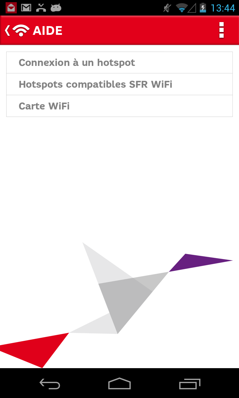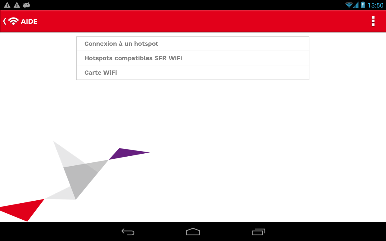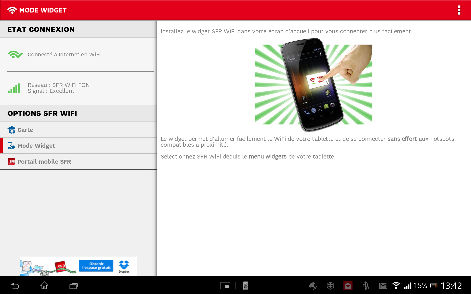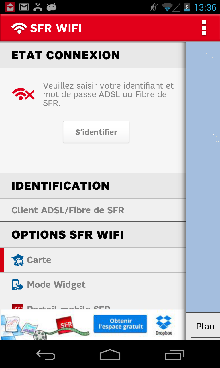 Nouvelle ergonomie ! Appli désormais accessible aux clients Box de SFR ! Avec l’application SFR WiFi, accédez à 4 millions de hotspots partout en France. L’application SFR WiFi est désormais disponible aux clients Box de SFR, comme aux clients mobile avec une carte SIM SFR ayant souscrit à une offre permettant l’accès à SFR WiFi. Pour les clients ADSL/Fibre de SFR, il sera demandé, uniquement lors du premier lancement, une identification via les identifiants Box de SFR. Egalement, retrouvez les points d'accès à proximité depuis le menu Carte WiFi utilisant la nouvelle version de Google Maps. Plus d’infos sur www.sfr.fr