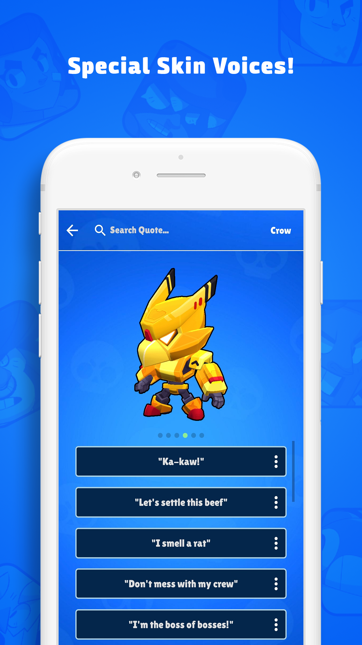 ★ "SFX for Brawl Stars" gives you a fully functional soundboard to explore what each brawler says. Didn’t unlock all the brawlers in “Brawl Stars”? Don’t worry! All the brawlers and their voice lines are available in the application! Instead of searching brawlers in the game to hear what they say, you can use this app, find the voice line & brawler's skin you are looking for and have fun with your friends and family! In addition, you can hear the hit sounds by hitting the brawler’s image! ★ Guess The Brawler Game: Try to guess which brawler the sound belongs to. Show off your Brawl Stars knowledge! Share your high score with friends and try to be on top of the ranking table! ★ Share with your friends your favorite brawler voice lines! * Disclaimer: This content is not affiliated with, endorsed, sponsored, or specifically approved by Supercell and Supercell is not responsible for it. For more information see Supercell's Fan Content Policy: www.supercell.com/fan-content-policy "SFX for Brawl Stars" is a fan-based app for "Brawl Stars". We are not directly connected to Brawl Stars and you cannot unlock characters/skins via this app.