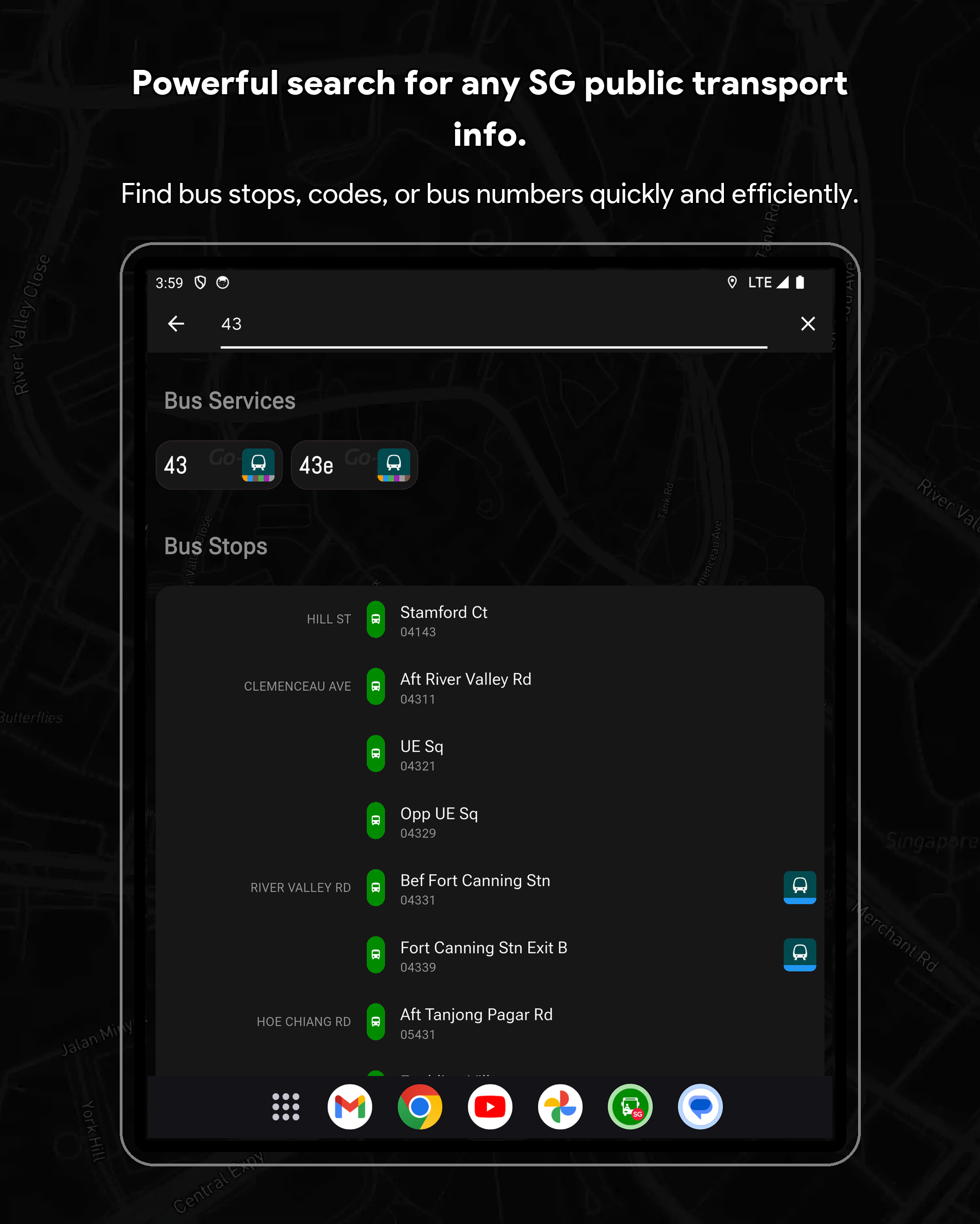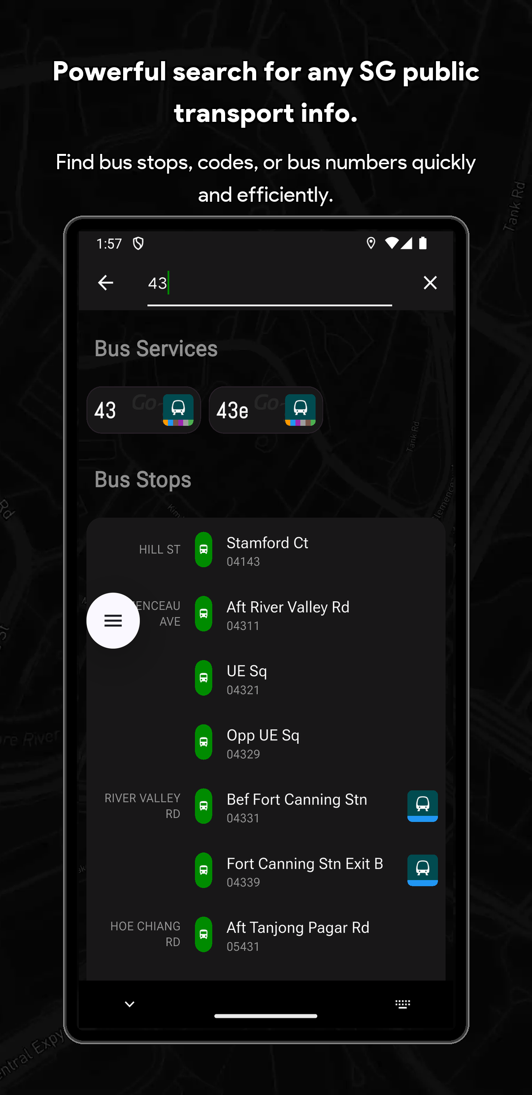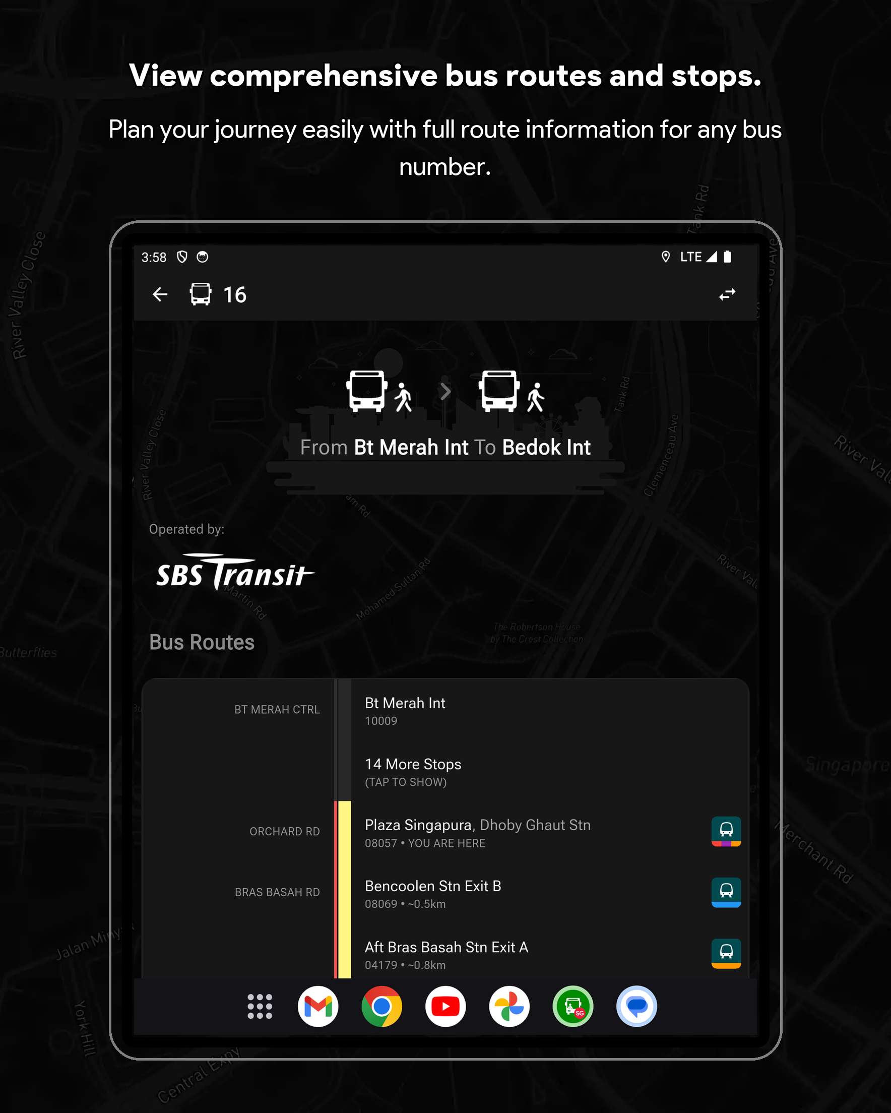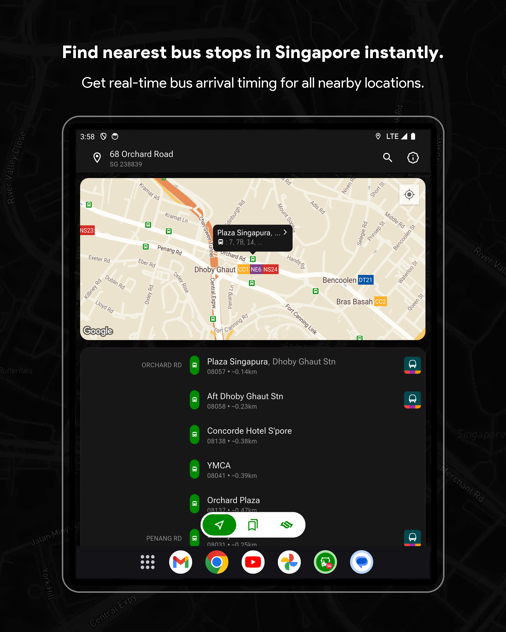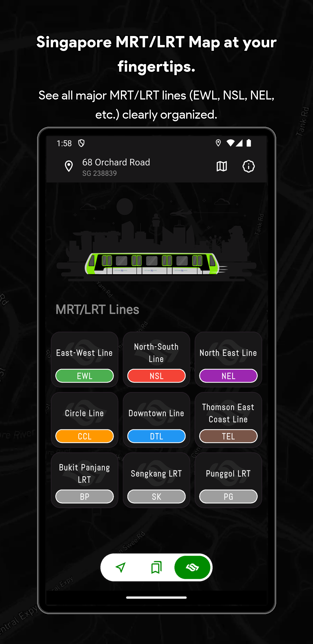 🏆 Singapore Bus Timing & Real-Time Arrival Companion (SG Bus App) Never miss a bus in Singapore again! SG Bus Arrival Time is your essential real-time public transport companion for effortlessly navigating the Singapore bus network. Get live bus timing updates, check the MRT map, and plan your commute with complete confidence. Trusted by thousands, this is the top-rated Singapore bus app you need for your daily travel. Core Features: Your Commute in Real-Time Streamline your daily travel and check bus arrival time sg quickly and efficiently. The SG Bus app ensures a smooth and hassle-free journey across the city. Whether you are searching for bus routes or checking bus sg status, the app is built to support everyone relying on LTA's reliable Singapore public transport system. 🚀 Top Features Designed for Singapore Bus Users: Real-Time SG Bus Timing: Get up-to-date bus arrival estimates for the next two buses at any stop in Singapore immediately. Locate Nearby Bus Stops: Instantly find your nearest bus stops, sorted by distance and road name for quick access to live bus timings. Essential Bus Service Info: View critical details for every bus service, including first and last bus timing, operator (SBST, SMRT, etc.), and estimated bus load. Quick Bookmarks: Save your favorite sg bus stops and services. Customize names for faster identification and check times with a single tap. MRT Map & Station Location Guide Seamlessly connect your Singapore bus journey with the train network. (Important Note: This app provides bus timing only and does not provide real-time MRT train timing.) Detailed MRT Map: Access the complete and current Singapore MRT & LRT Map (including the NSL, EWL, NEL, DTL, CCL, TEL) to easily plan intermodal travel and find connection points. MRT Station Information: Get detailed info on every MRT station, including exits, amenities, and surrounding points of interest. Bus-MRT Connectivity: View the full bus route and easily identify stops with MRT Connectivity clearly highlighted to simplify transit planning. Advanced Search & Navigation Unified & Powerful Search: Instantly find any bus stop code, bus service number, or specific bus route using a single, efficient search bar. Index to Roads: Quickly find bus services that ply specific road names, making navigation easier when you are in an unfamiliar area. Call to Action Download SG Bus now and enjoy stress-free commuting with the best singapore bus app! Get the real-time bus schedule and MRT map today! 🇸🇬 Disclaimer: This App is a personal project developed by myself and is not affiliated with SimplyGo, LTA, or any bus operators in Singapore.