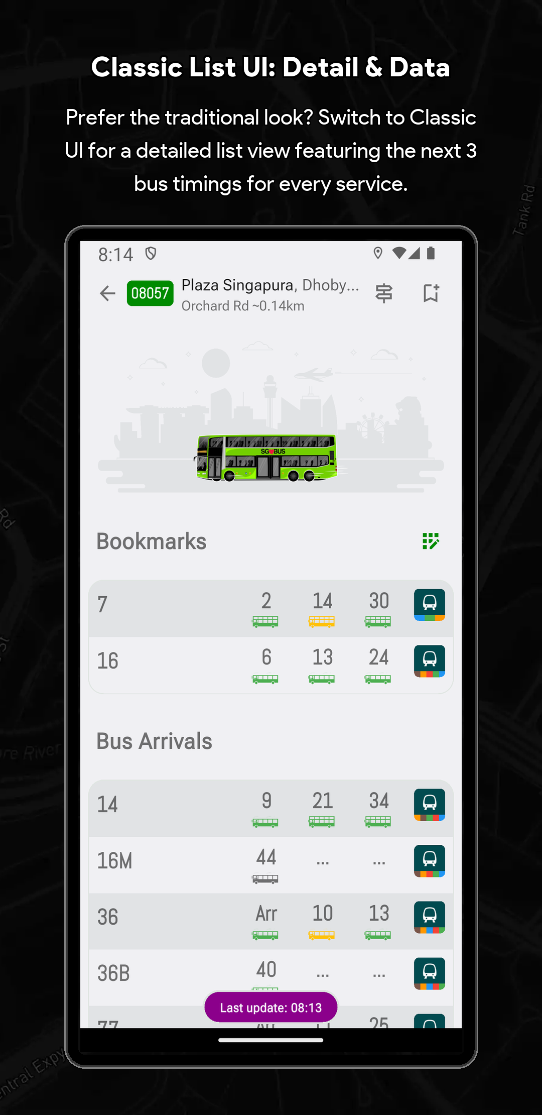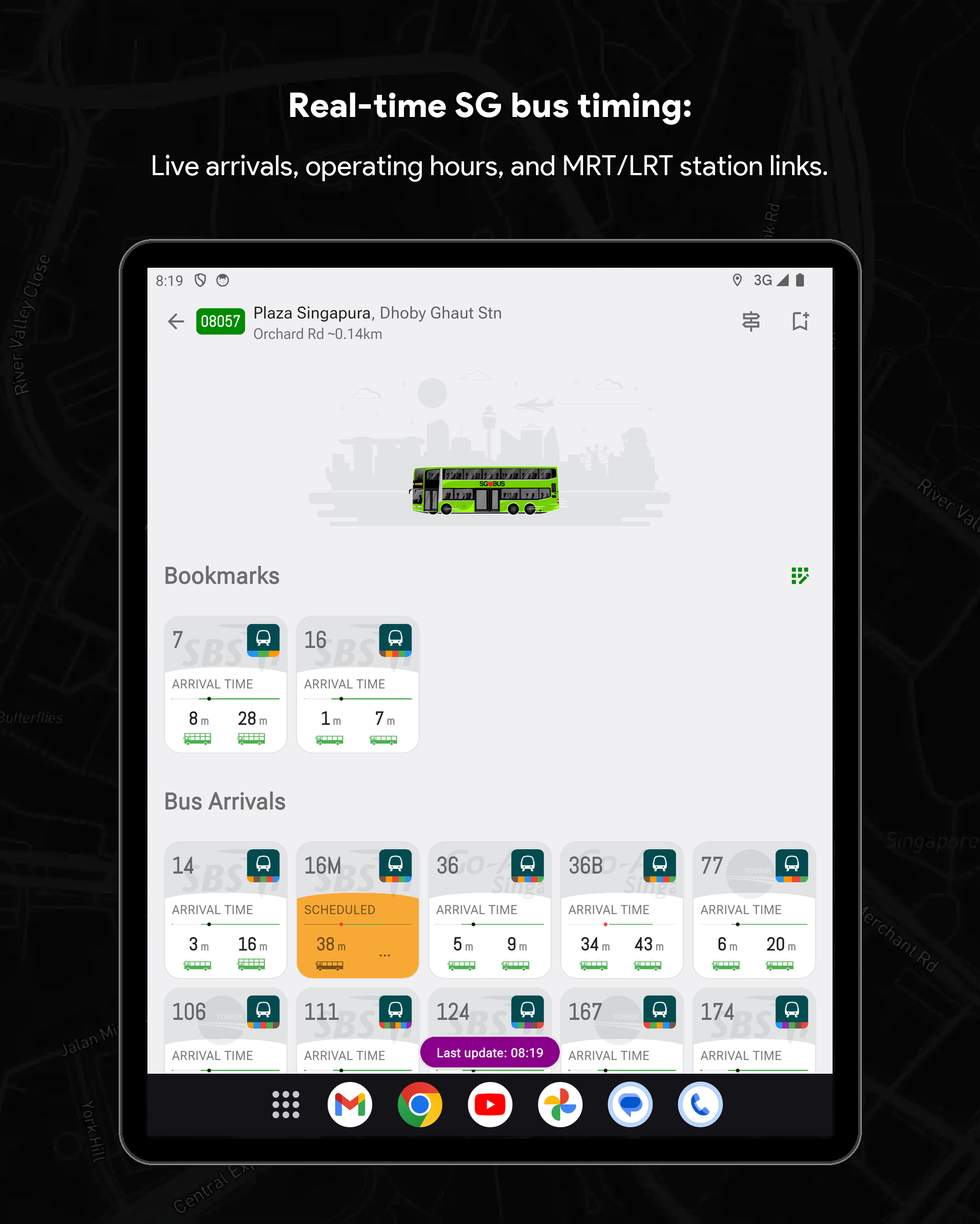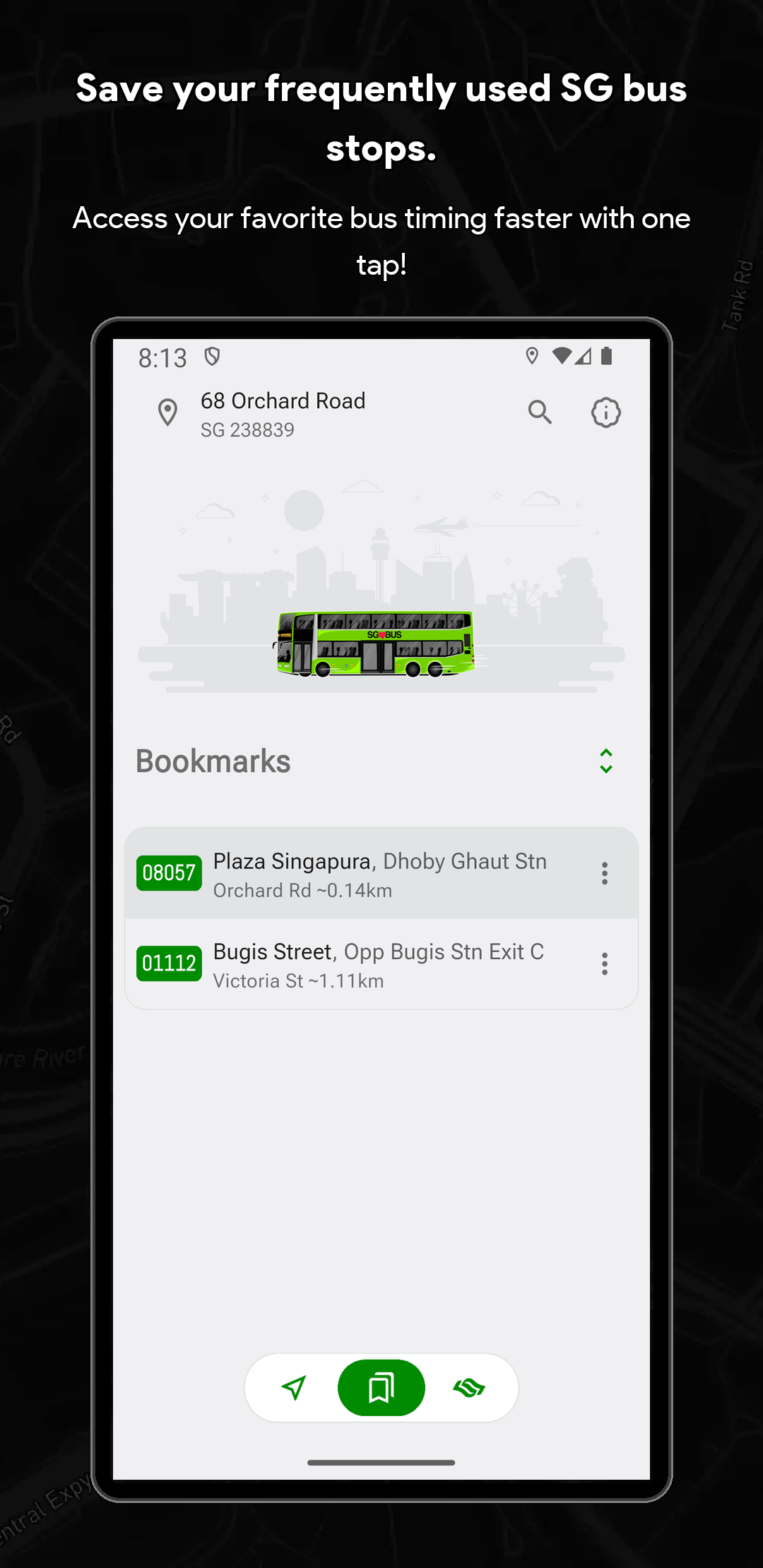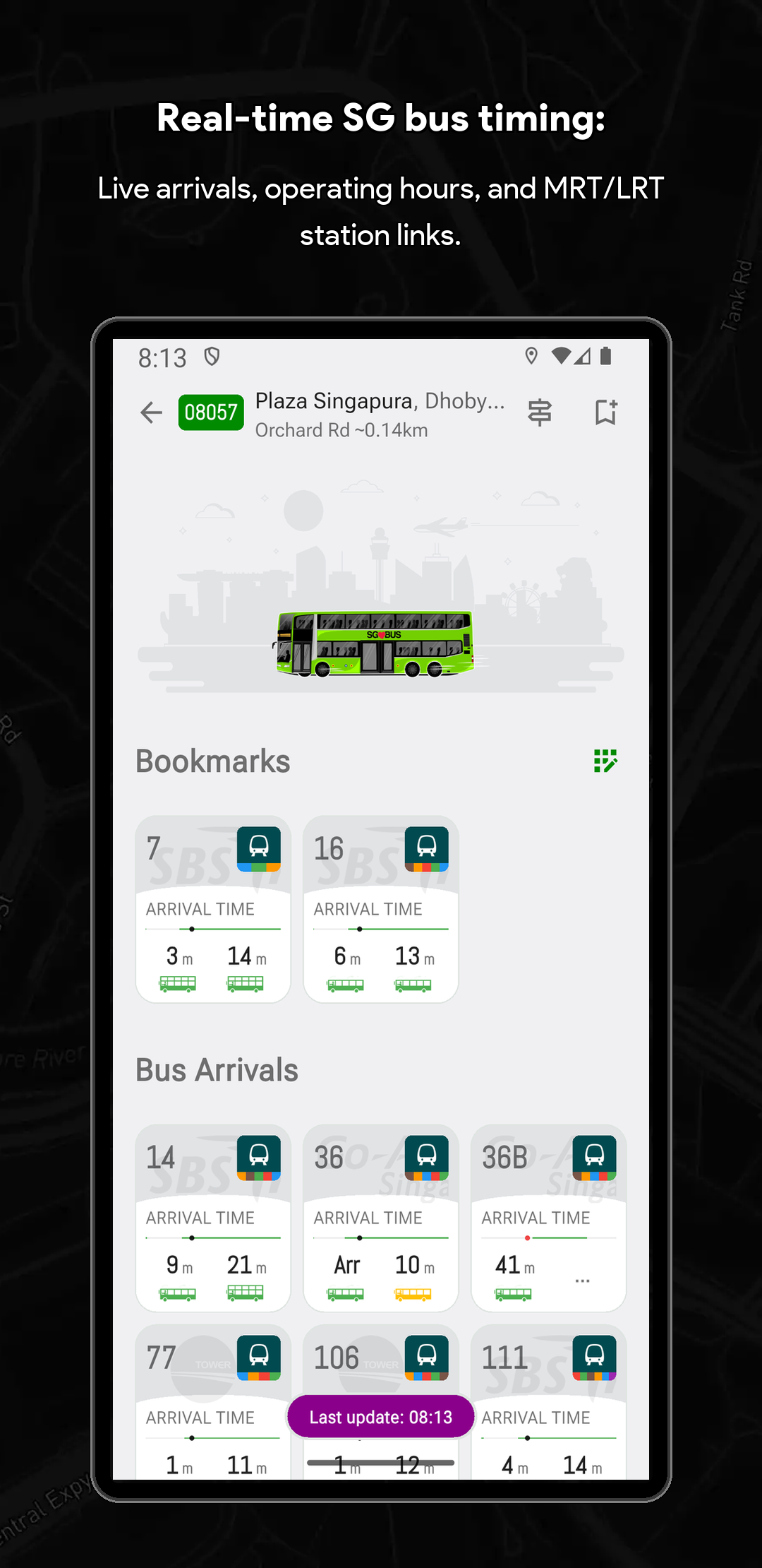 🏆 Singapore Bus Timing & Real-Time Arrival Companion (SG Bus App) Never miss a bus in Singapore again! SG Bus Arrival Time is your essential real-time public transport companion for effortlessly navigating the Singapore bus network. Get live bus timing updates, check the MRT map, and plan your commute with complete confidence. Trusted by thousands, this is the top-rated Singapore bus app you need for your daily travel. Core Features: Your Commute in Real-Time Streamline your daily travel and check bus arrival time sg quickly and efficiently. The SG Bus app ensures a smooth and hassle-free journey across the city. Whether you are searching for bus routes or checking bus sg status, the app is built to support everyone relying on LTA's reliable Singapore public transport system. 🚀 Top Features Designed for Singapore Bus Users: Real-Time SG Bus Timing: Get up-to-date bus arrival estimates for the next two or three buses at any stop in Singapore immediately. System Theme Support (Light & Dark Mode): Automatically adapts to your device’s system theme for a comfortable viewing experience anytime, day or night. Modern & Classic UI: Customize your experience by switching between a Modern UI (Grid UI) or a Classic UI (List UI) to suit your preferred style of viewing arrival times. Locate Nearby Bus Stops: Instantly find your nearest bus stops, sorted by distance and road name for quick access to live bus timings. Fare Calculator: Effortlessly calculate your journey fares for both bus and MRT trips to help you plan your travel expenses in advance. Essential Bus Service Info: View critical details for every bus service, including first and last bus timing, operator (SBST, SMRT, etc.), and estimated bus load. Operating Hours & Timeline: Check specific operating hours for every bus service at any stop. Use the operating hours timeline indicator to easily see if a bus is still in service or already out of operating hours. Quick Bookmarks & Custom Names: Save your favorite sg bus stops and services. You can now rename every single bus stop for even faster identification and check times with a single tap. MRT Map & Station Location Guide Seamlessly connect your Singapore bus journey with the train network. (Important Note: This app provides bus timing only and does not provide real-time MRT train timing.) Real-Time MRT Status: Stay informed with live updates on the MRT network. Easily check for service disruptions, delays, or any travel alerts to plan your journey better. Detailed MRT Map: Access the complete and current Singapore MRT & LRT Map (including the NSL, EWL, NEL, DTL, CCL, TEL) to easily plan intermodal travel and find connection points. MRT Station Information: Get detailed info on every MRT station, including exits, amenities, and surrounding points of interest. Bus-MRT Connectivity: View the full bus route and easily identify stops with MRT Connectivity clearly highlighted to simplify transit planning. Advanced Search & Navigation Unified & Powerful Search: Instantly find any bus stop code, bus service number, or specific bus route using a single, efficient search bar. Index to Roads: Quickly find bus services that ply specific road names, making navigation easier when you are in an unfamiliar area. Call to Action Download SG Bus now and enjoy stress-free commuting with the best singapore bus app! Get the real-time bus schedule and MRT map today! 🇸🇬 Disclaimer: This App is a personal project developed by myself and is not affiliated with SimplyGo, LTA, or any bus operators in Singapore.
