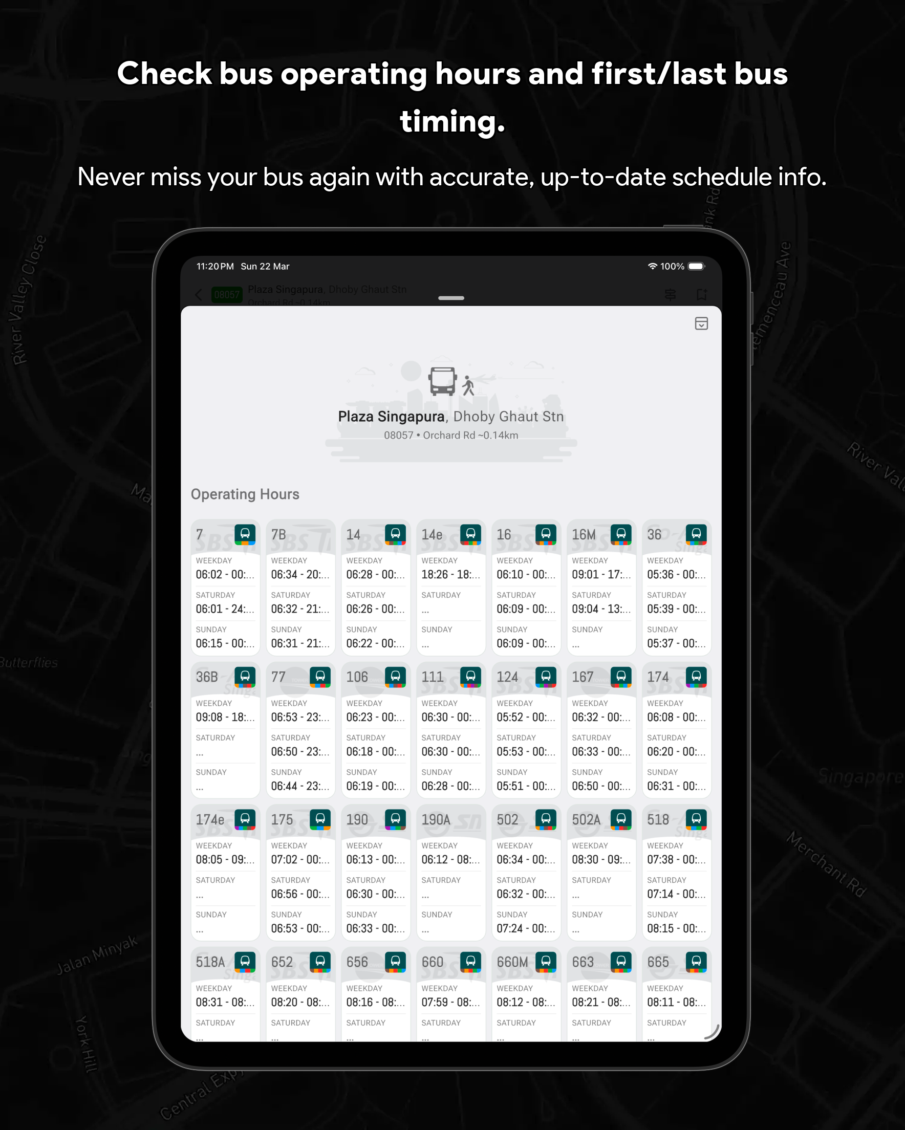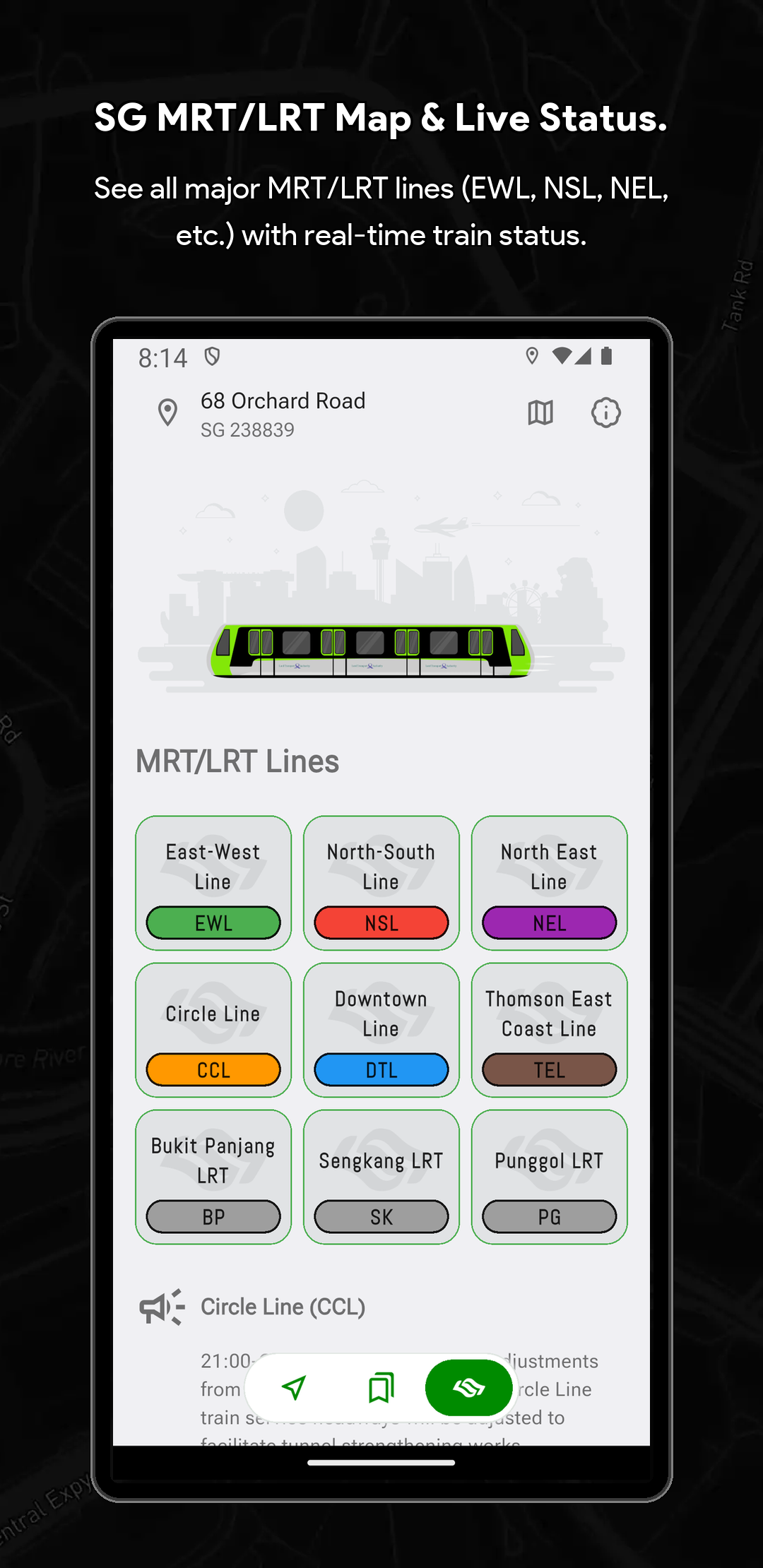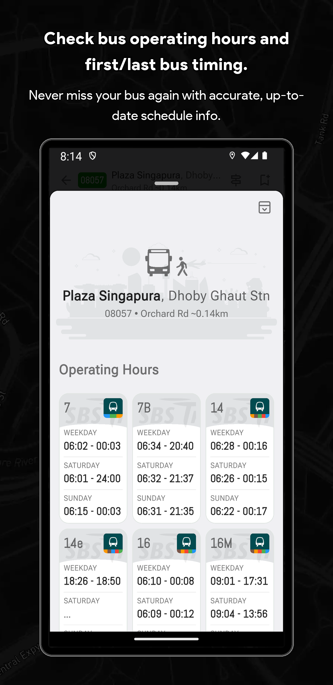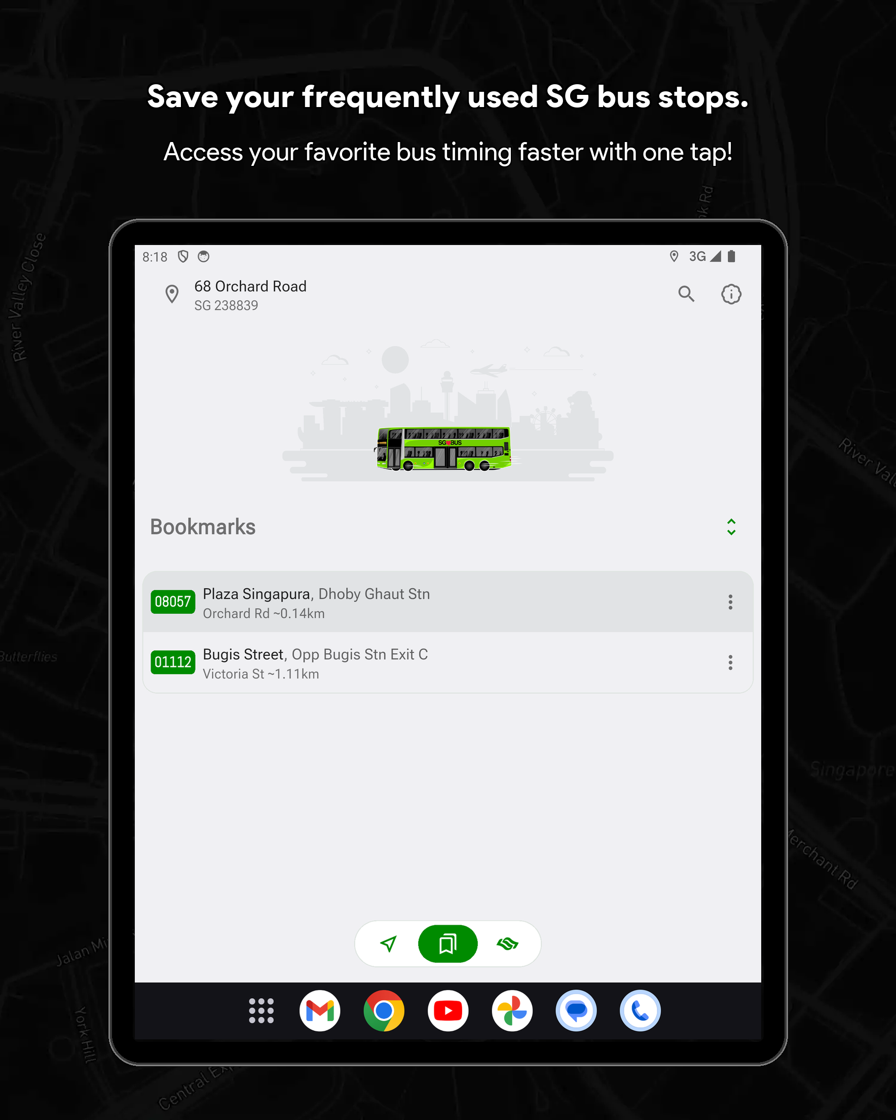 🏆 Singapore Bus Timing & Real-Time Arrival Companion (SG Bus App) Never miss a bus in Singapore again! SG Bus Arrival Time is your essential real-time public transport companion for effortlessly navigating the Singapore bus network. Get live bus timing updates, check the MRT map, and plan your commute with complete confidence. Trusted by thousands, this is the top-rated Singapore bus app you need for your daily travel. Core Features: Your Commute in Real-Time Streamline your daily travel and check bus arrival time sg quickly and efficiently. The SG Bus app ensures a smooth and hassle-free journey across the city. Whether you are searching for bus routes or checking bus sg status, the app is built to support everyone relying on LTA's reliable Singapore public transport system. 🚀 Top Features Designed for Singapore Bus Users: Real-Time SG Bus Timing: Get up-to-date bus arrival estimates for the next two or three buses at any stop in Singapore immediately. System Theme Support (Light & Dark Mode): Automatically adapts to your device’s system theme for a comfortable viewing experience anytime, day or night. Modern & Classic UI: Customize your experience by switching between a Modern UI (Grid UI) or a Classic UI (List UI) to suit your preferred style of viewing arrival times. Locate Nearby Bus Stops: Instantly find your nearest bus stops, sorted by distance and road name for quick access to live bus timings. Fare Calculator: Effortlessly calculate your journey fares for both bus and MRT trips to help you plan your travel expenses in advance. Essential Bus Service Info: View critical details for every bus service, including first and last bus timing, operator (SBST, SMRT, etc.), and estimated bus load. Operating Hours & Timeline: Check specific operating hours for every bus service at any stop. Use the operating hours timeline indicator to easily see if a bus is still in service or already out of operating hours. Quick Bookmarks & Custom Names: Save your favorite sg bus stops and services. You can now rename every single bus stop for even faster identification and check times with a single tap. MRT Map & Station Location Guide Seamlessly connect your Singapore bus journey with the train network. (Important Note: This app provides bus timing only and does not provide real-time MRT train timing.) Real-Time MRT Status: Stay informed with live updates on the MRT network. Easily check for service disruptions, delays, or any travel alerts to plan your journey better. Detailed MRT Map: Access the complete and current Singapore MRT & LRT Map (including the NSL, EWL, NEL, DTL, CCL, TEL) to easily plan intermodal travel and find connection points. MRT Station Information: Get detailed info on every MRT station, including exits, amenities, and surrounding points of interest. Bus-MRT Connectivity: View the full bus route and easily identify stops with MRT Connectivity clearly highlighted to simplify transit planning. Advanced Search & Navigation Unified & Powerful Search: Instantly find any bus stop code, bus service number, or specific bus route using a single, efficient search bar. Index to Roads: Quickly find bus services that ply specific road names, making navigation easier when you are in an unfamiliar area. Call to Action Download SG Bus now and enjoy stress-free commuting with the best singapore bus app! Get the real-time bus schedule and MRT map today! 🇸🇬 Disclaimer: This App is a personal project developed by myself and is not affiliated with SimplyGo, LTA, or any bus operators in Singapore.