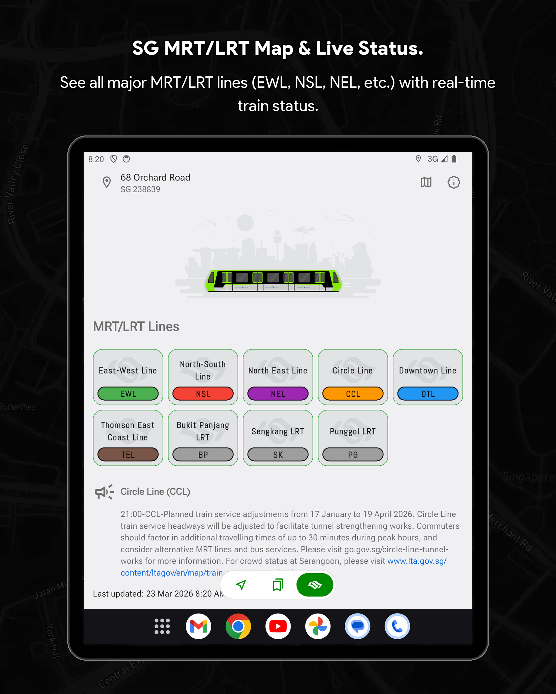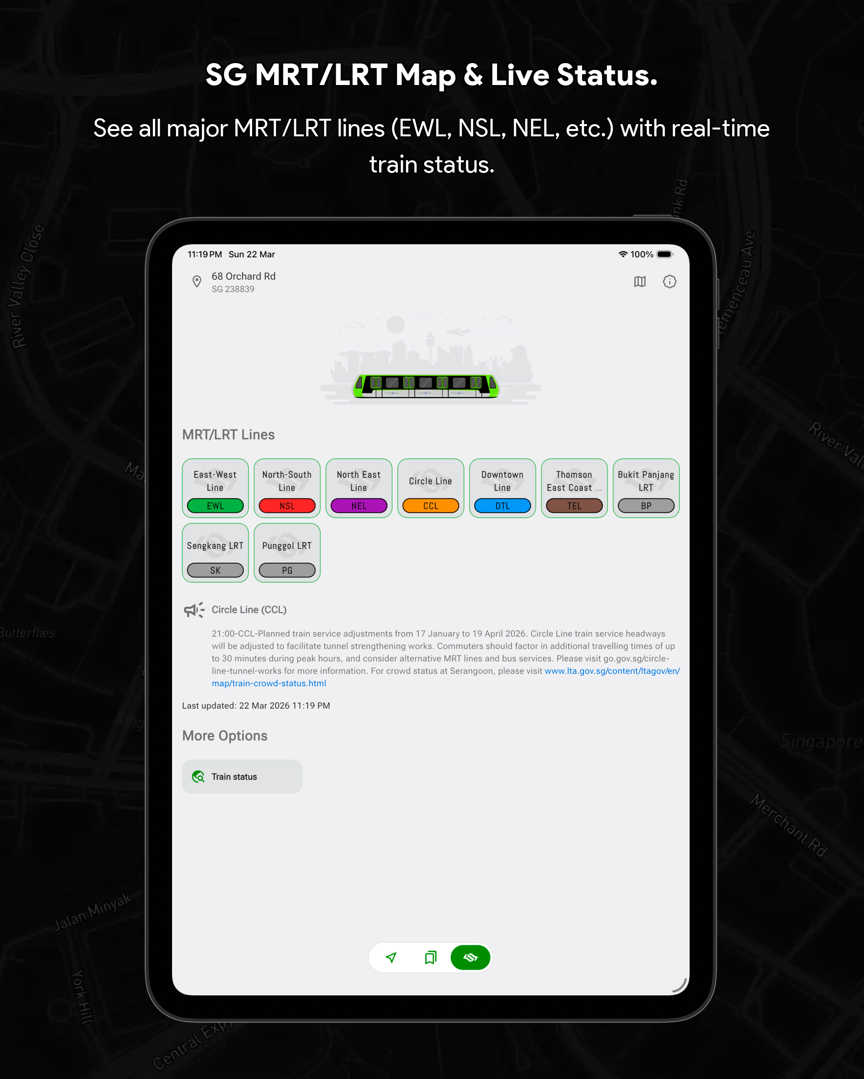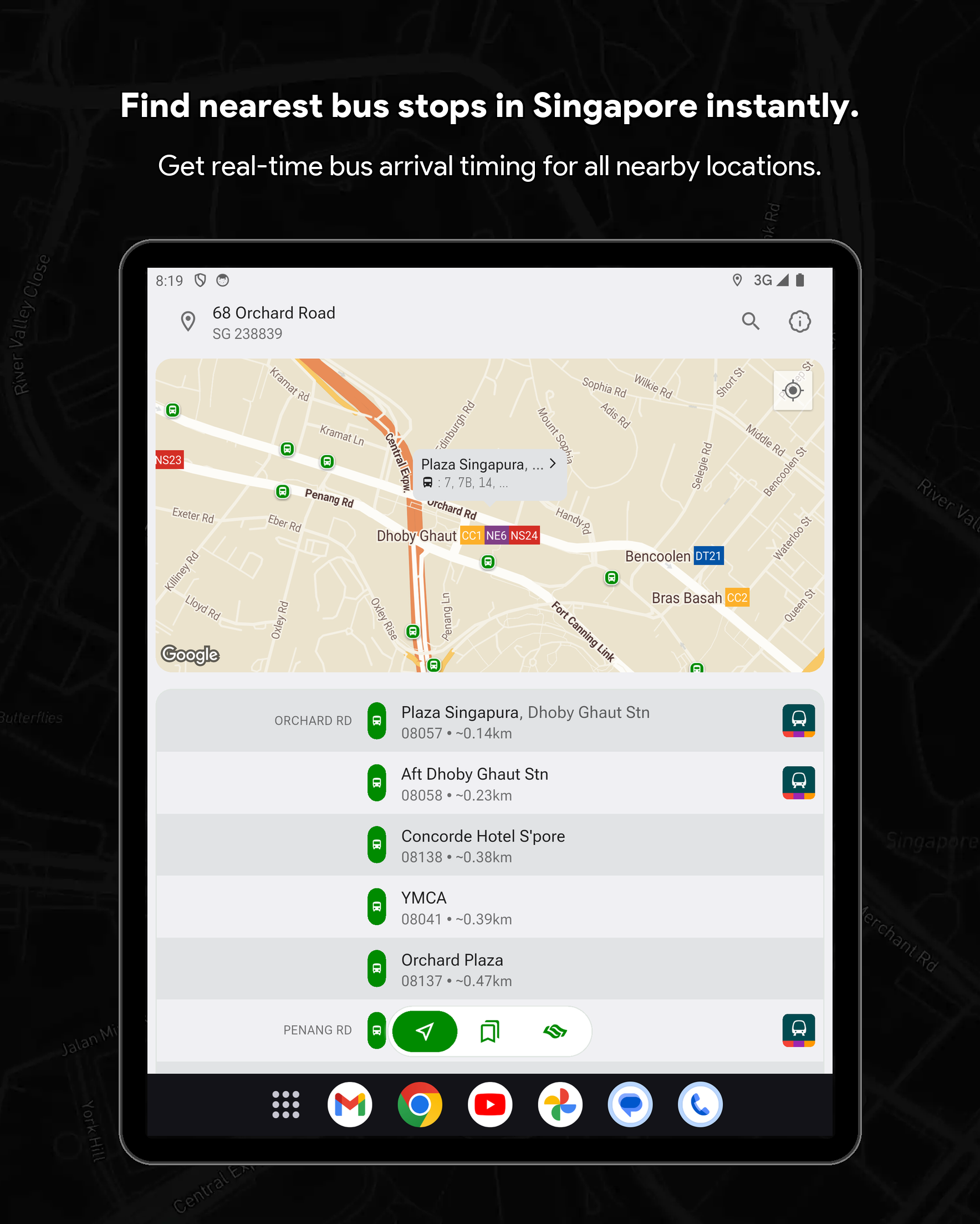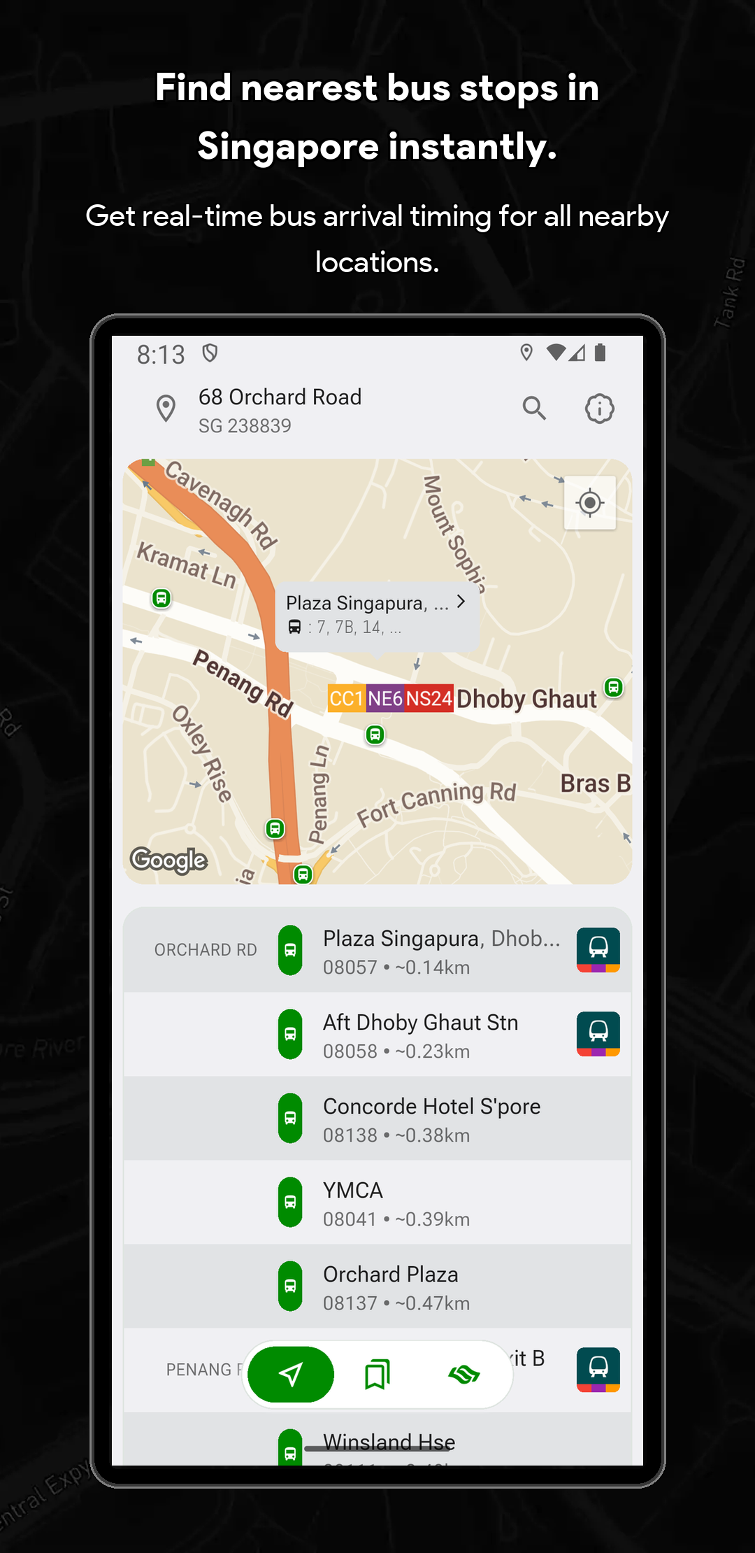 🏆 Singapore Bus Timing & Real-Time Arrival Companion (SG Bus App) Never miss a bus in Singapore again! SG Bus Arrival Time is your essential real-time public transport companion for effortlessly navigating the Singapore bus network. Get live bus timing updates, check the MRT map, and plan your commute with complete confidence. Trusted by thousands, this is the top-rated Singapore bus app you need for your daily travel. Core Features: Your Commute in Real-Time Streamline your daily travel and check bus arrival time sg quickly and efficiently. The SG Bus app ensures a smooth and hassle-free journey across the city. Whether you are searching for bus routes or checking bus sg status, the app is built to support everyone relying on LTA's reliable Singapore public transport system. 🚀 Top Features Designed for Singapore Bus Users: Real-Time SG Bus Timing: Get up-to-date bus arrival estimates for the next two or three buses at any stop in Singapore immediately. System Theme Support (Light & Dark Mode): Automatically adapts to your device’s system theme for a comfortable viewing experience anytime, day or night. Modern & Classic UI: Customize your experience by switching between a Modern UI (Grid UI) or a Classic UI (List UI) to suit your preferred style of viewing arrival times. Locate Nearby Bus Stops: Instantly find your nearest bus stops, sorted by distance and road name for quick access to live bus timings. Fare Calculator: Effortlessly calculate your journey fares for both bus and MRT trips to help you plan your travel expenses in advance. Essential Bus Service Info: View critical details for every bus service, including first and last bus timing, operator (SBST, SMRT, etc.), and estimated bus load. Operating Hours & Timeline: Check specific operating hours for every bus service at any stop. Use the operating hours timeline indicator to easily see if a bus is still in service or already out of operating hours. Quick Bookmarks & Custom Names: Save your favorite sg bus stops and services. You can now rename every single bus stop for even faster identification and check times with a single tap. MRT Map & Station Location Guide Seamlessly connect your Singapore bus journey with the train network. (Important Note: This app provides bus timing only and does not provide real-time MRT train timing.) Real-Time MRT Status: Stay informed with live updates on the MRT network. Easily check for service disruptions, delays, or any travel alerts to plan your journey better. Detailed MRT Map: Access the complete and current Singapore MRT & LRT Map (including the NSL, EWL, NEL, DTL, CCL, TEL) to easily plan intermodal travel and find connection points. MRT Station Information: Get detailed info on every MRT station, including exits, amenities, and surrounding points of interest. Bus-MRT Connectivity: View the full bus route and easily identify stops with MRT Connectivity clearly highlighted to simplify transit planning. Advanced Search & Navigation Unified & Powerful Search: Instantly find any bus stop code, bus service number, or specific bus route using a single, efficient search bar. Index to Roads: Quickly find bus services that ply specific road names, making navigation easier when you are in an unfamiliar area. Call to Action Download SG Bus now and enjoy stress-free commuting with the best singapore bus app! Get the real-time bus schedule and MRT map today! 🇸🇬 Disclaimer: This App is a personal project developed by myself and is not affiliated with SimplyGo, LTA, or any bus operators in Singapore.