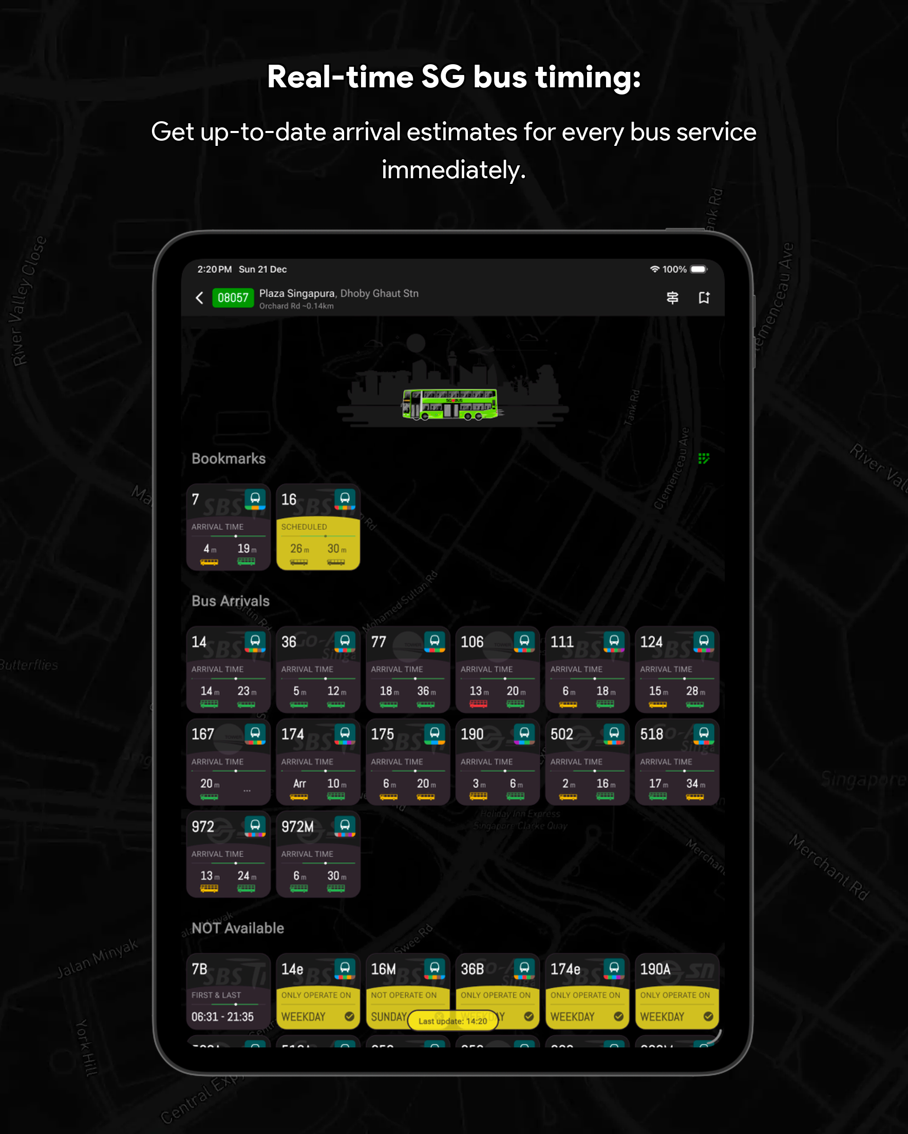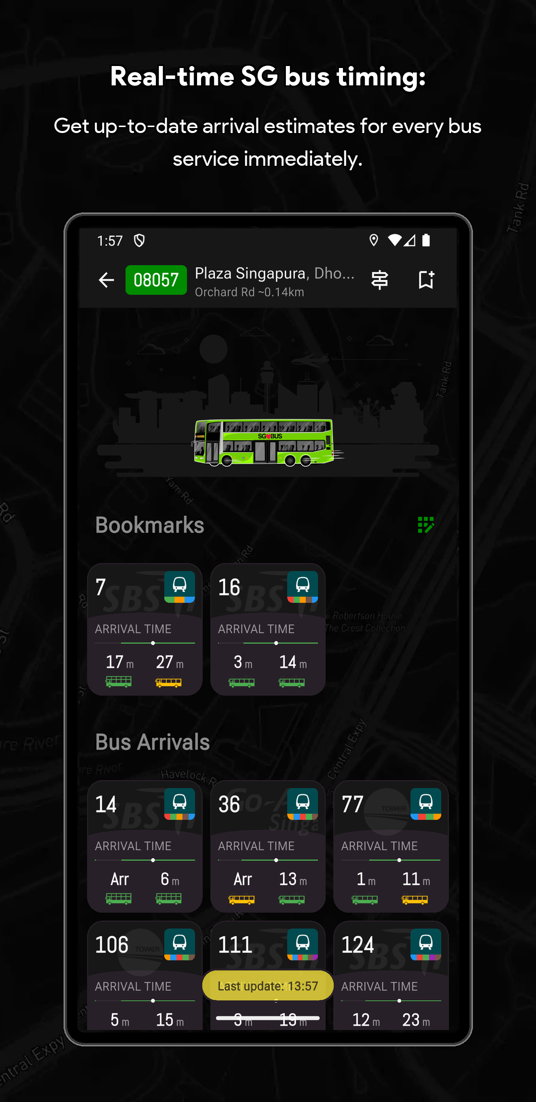 Never miss a bus in Singapore again! SG Bus Arrival Time is your essential real-time public transport companion for effortlessly navigating the Singapore bus network. Here’s What’s New: - Expanded and Updated Bus Stop Database (20/12/2025) – Enjoy more accurate stops! - Added bus operating hours timeline indicator to all the bus services in bus arrivals page. - Added option to edit bus stop display name for all bus stops. - Added option to show 3 bus arrival timing (default is 2).