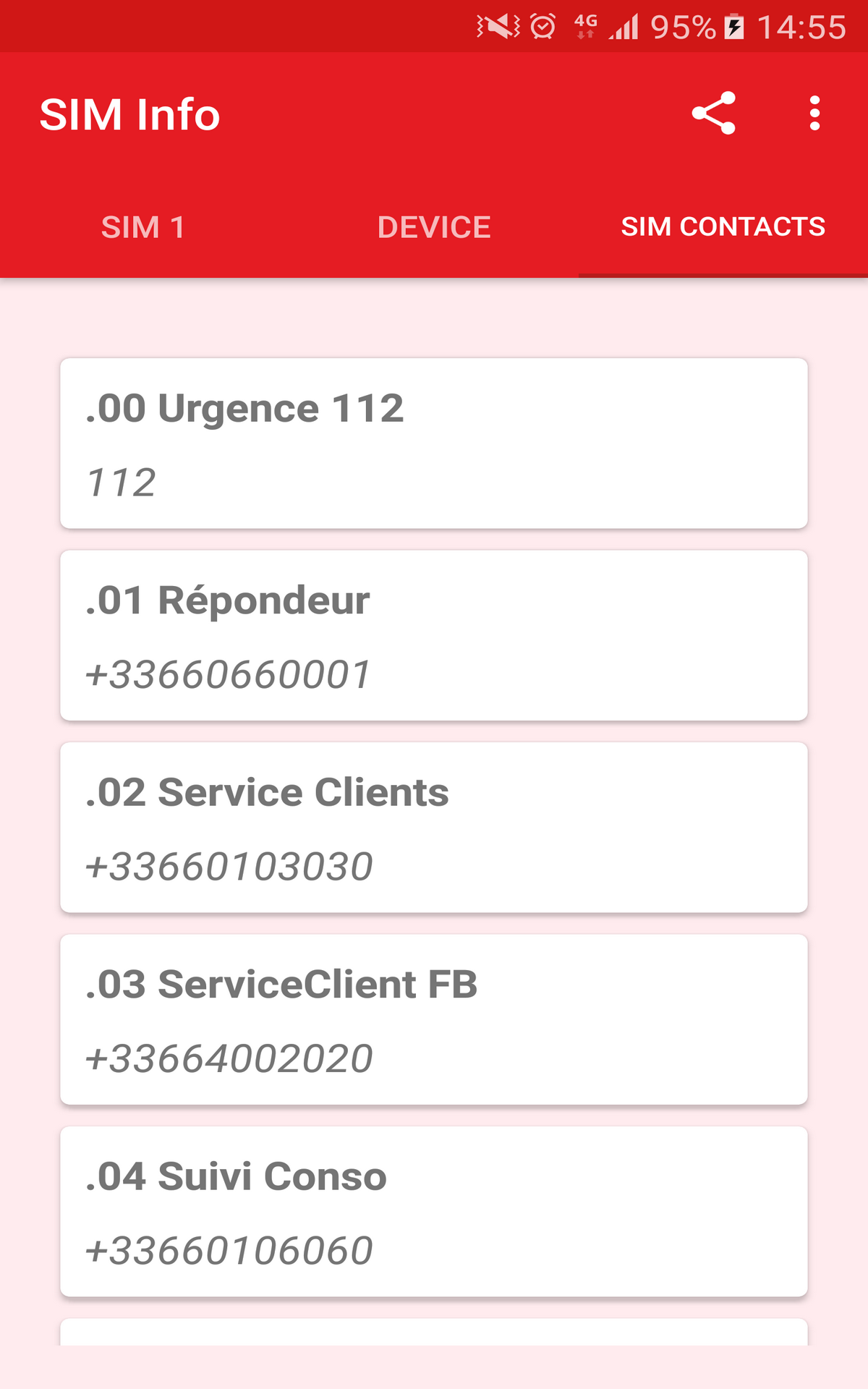 A Device tab is offered and displays some static information on your smartphone or tablet like : Board value, Manufacturer, Brand, Display code, Hardware of the device or the Bootloader used. Finally, the SIM Contacts tab lets you to discover all the Contacts saved in your SIM Card. With a long touch on a Contact you can copy the number associated in your clipboard.