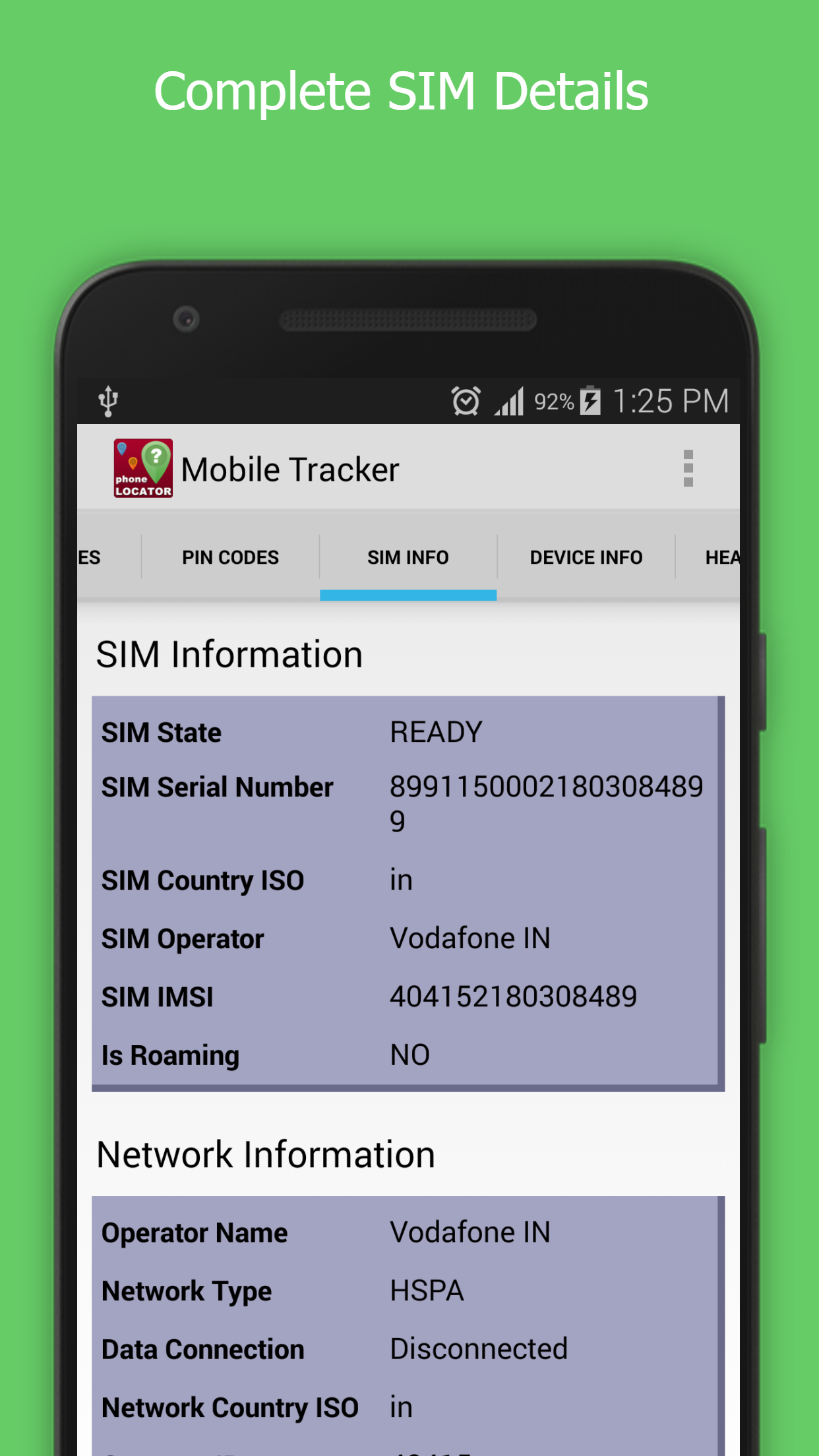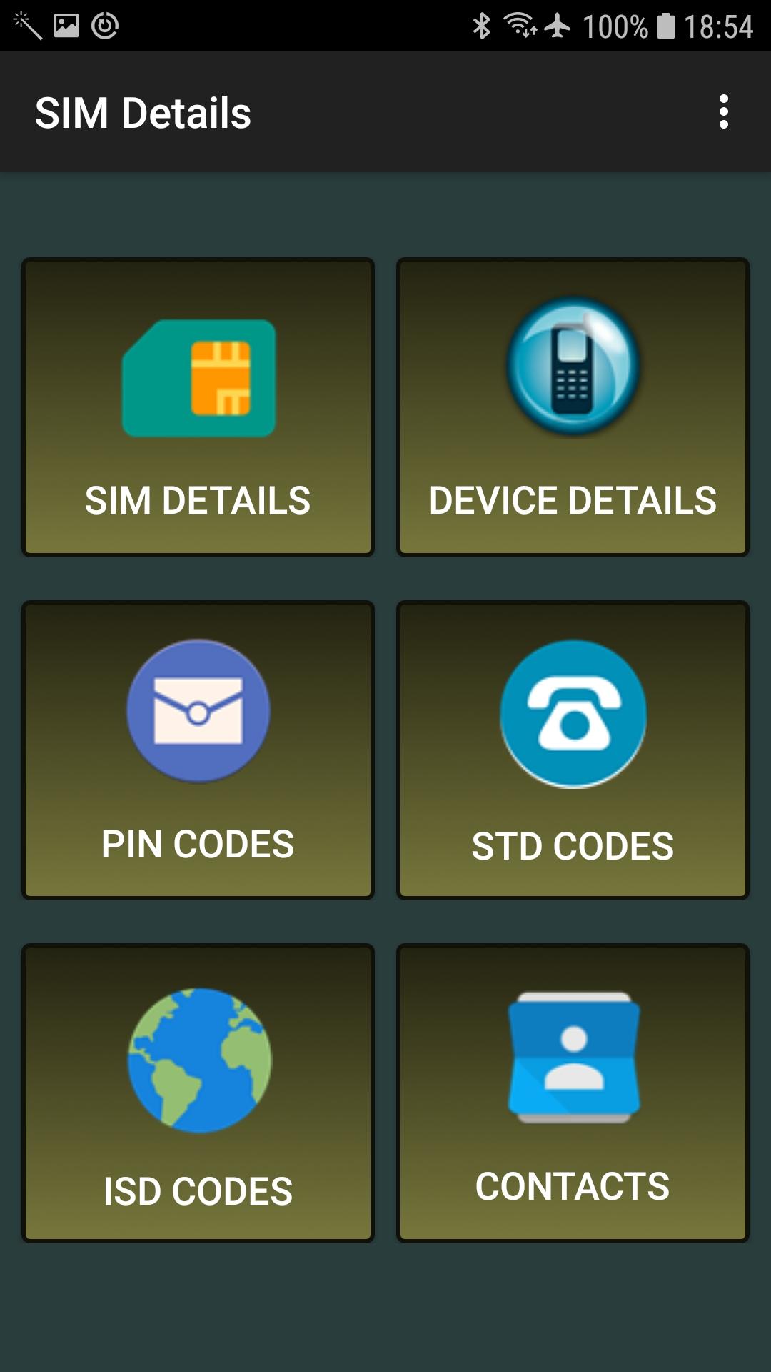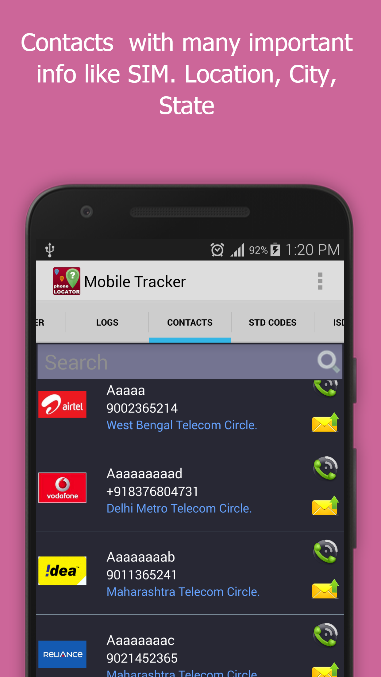 Get SIM details,Device Details IMEI, Phone Model, Android Version PIN Code, STD Codes, ISD Codes etc SIM Details : Operator name, SIM Status, SIM IMSI, Roaming Information, Mobile Data Status, Country ISO. Network Info: Network Provider, Network Type 2G, 3G, LTE Etc, Operator ID, Data State. Device Details: IMEI Number, Device Type GSM/CDMA, Model Name, Manufacturer, Brand, Hardware Info. Operating System Info: OS Name like Jellybean, Kit Kat, SDK Version, Android Version, Binary Type * Updated with latest 7XXX and 8XXX Series * Includes Landline Numbers and Tollfree Numbers * No Internet connection required, Works offline as well. * STD Code of all Cities in India * ISD Codes of all Countries in world. Smart Contacts: Contacts with detail like Geographical area of Service Provider, Location etc. Note : This app works only for Indian Mobile and Landline Numbers.