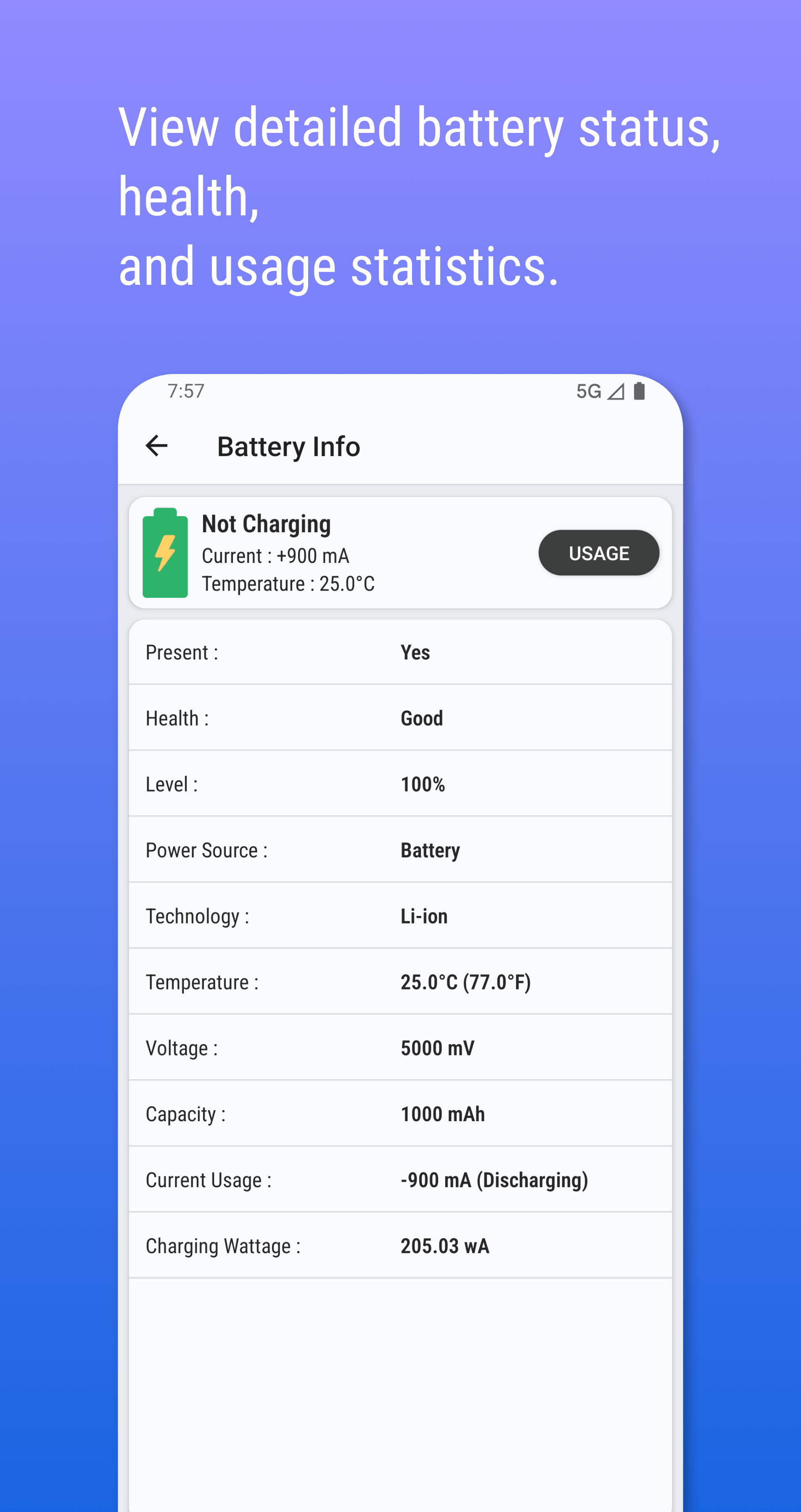 • Real-Time Battery Health Check: Monitor your battery’s status, health, technology, temperature, voltage, and capacity without root access.