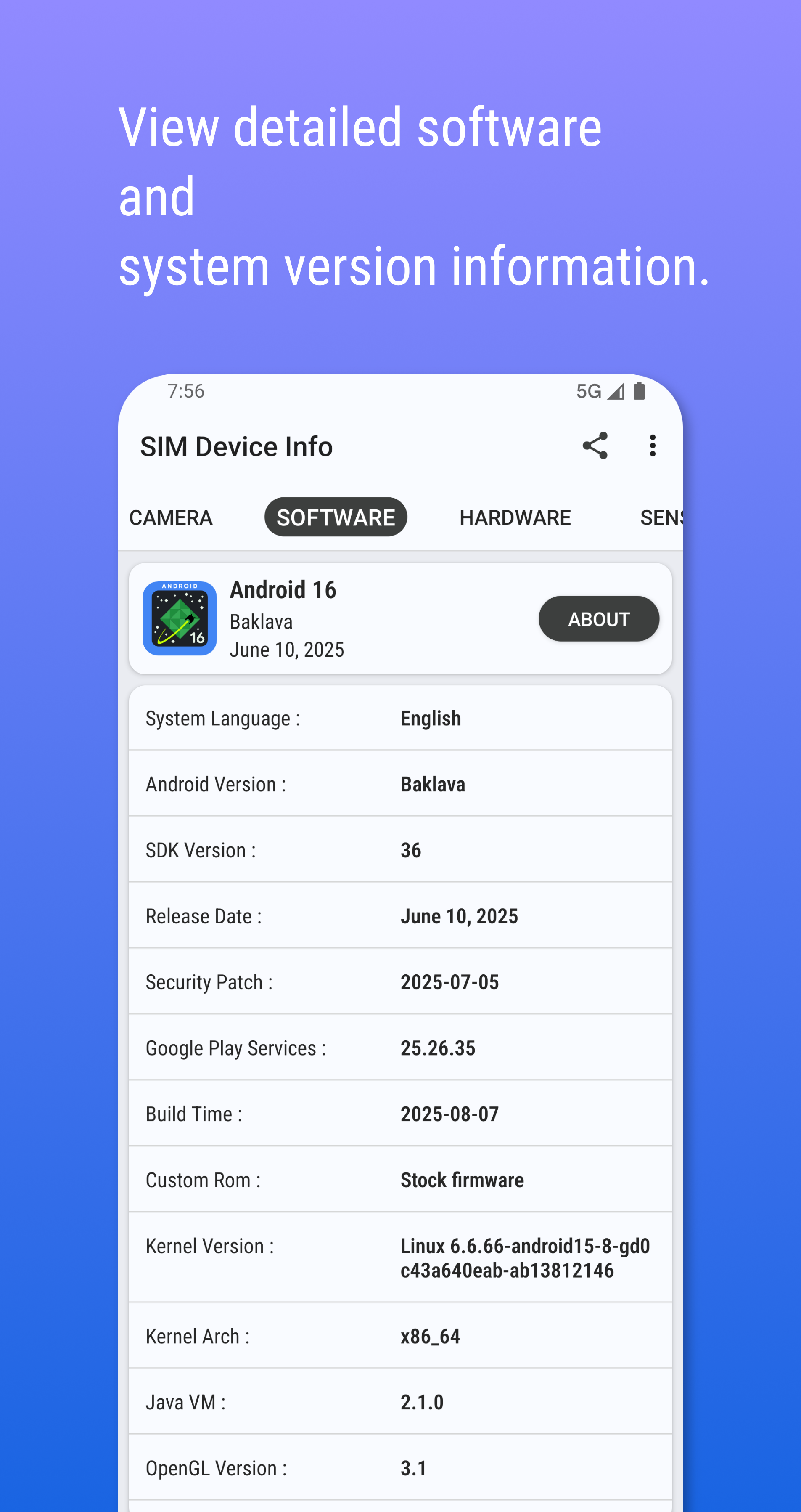 • In-Depth System Diagnostics: Dive deep into your operating system version, API level, security patch date, and kernel information.