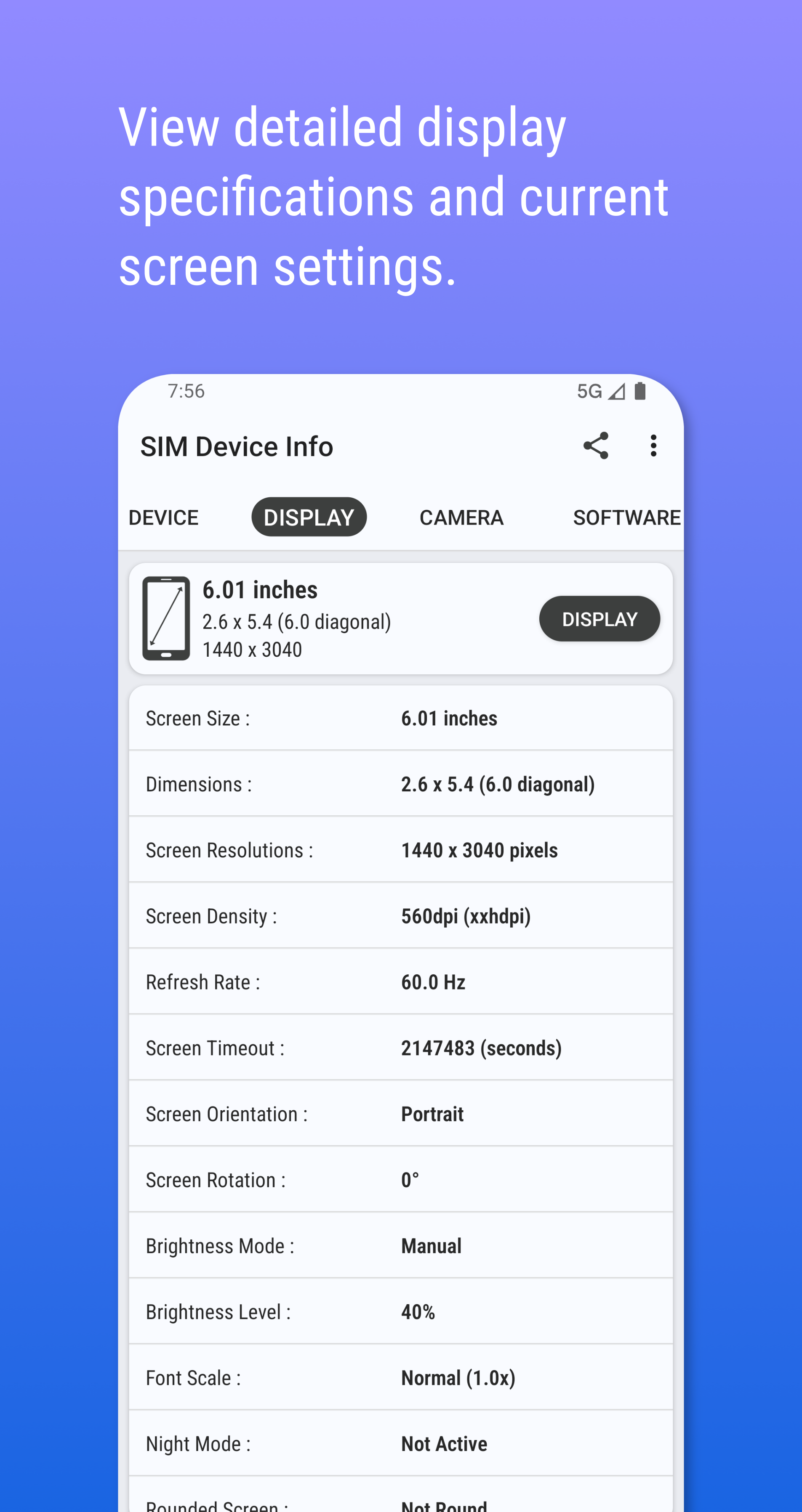 • Display & Camera Specs: Analyze your screen's resolution, density, refresh rate, and precise dimensions. Get a full breakdown of your camera’s capabilities, including resolution, megapixels, and supported features.