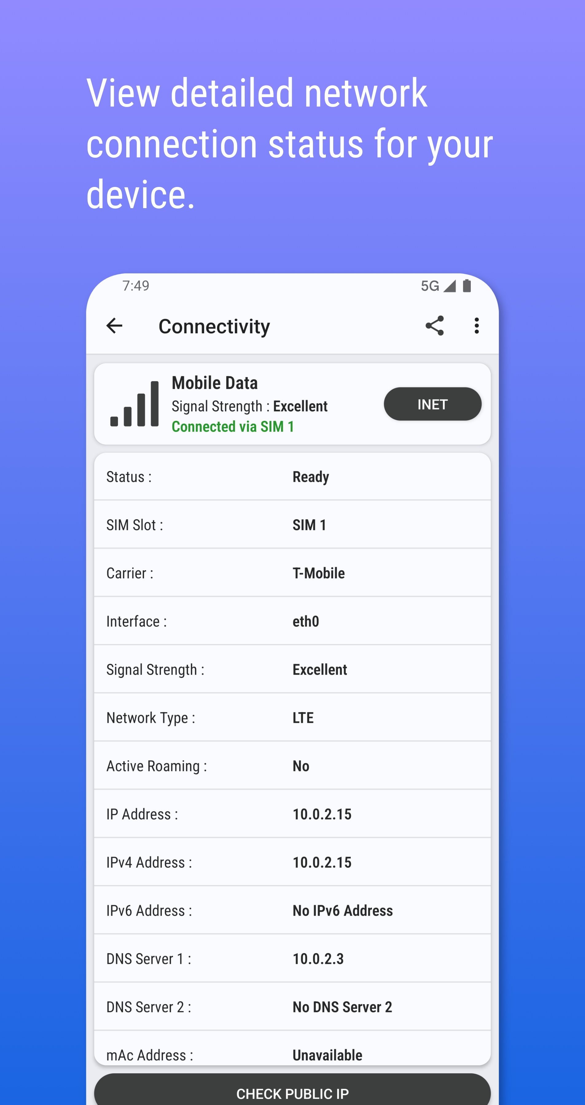 • SIM Card Details Unveiled: Discover vital SIM information like carrier name, country code, serial number (ICCID), and network type (5G, 4G LTE, etc.).