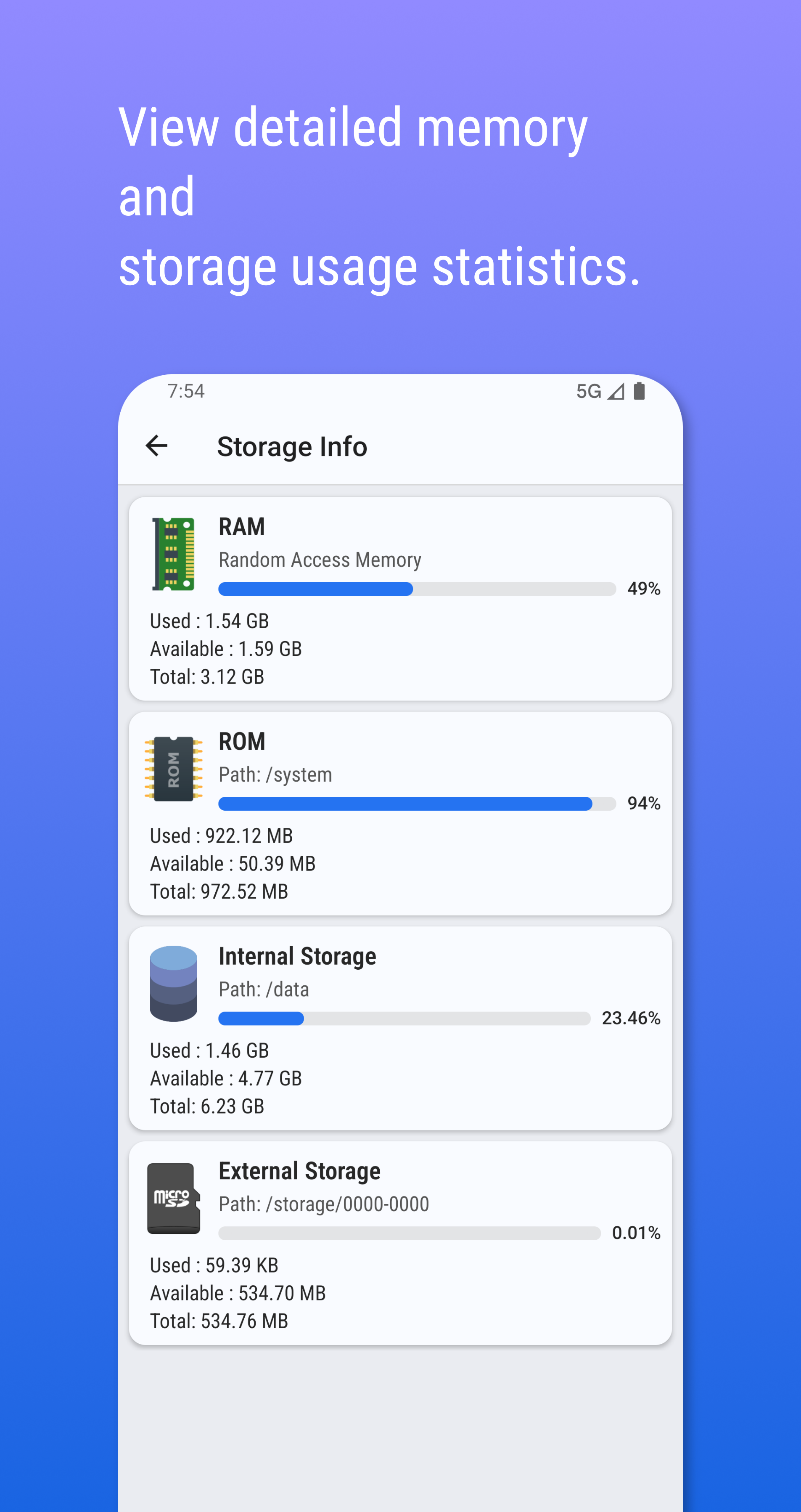 • Storage & Memory Analysis: See a clear breakdown of your total and available storage (internal & external) and RAM usage to manage your space efficiently.